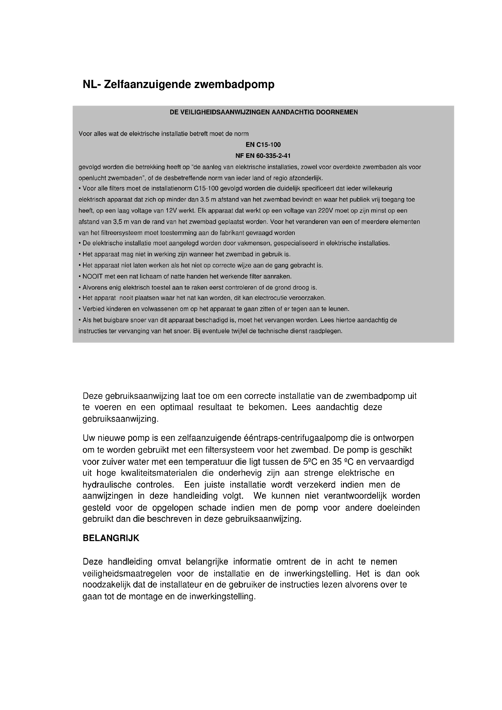 ze gebruiksaanwijzing laat toe om een correcte installatie van de zwembadpomp uit te voeren en een optimaal resultaat te bekomen. Lees aandachtig deze gebruiksaanwijzing. Uw nieuwe pomp is een zelfaanzuigende ééntraps-centrifugaalpomp die is ontworpen om te worden gebruikt met een filtersysteem voor het zwembad. De pomp is geschikt voor zuiver water met een temperatuur die ligt tussen de 5ºC en 35 ºC en vervaardigd uit hoge kwaliteitsmaterialen die onderhevig zijn aan strenge elektrische en hydraulische controles. Een juiste installatie wordt verzekerd indien men de aanwijzingen in deze handleiding volgt. We kunnen niet verantwoordelijk worden gesteld voor de opgelopen schade indien men de pomp voor andere doeleinden gebruikt dan die beschreven in deze gebruiksaanwijzing. BELANGRIJK Deze handleiding omvat belangrijke informatie omtrent de in acht te nemen veiligheidsmaatregelen voor de installatie en de inwerkingstelling. Het is dan ook noodzakelijk dat de installateur en de gebruiker de instructies lezen alvorens over te gaan tot de montage en de inwerkingstelling.