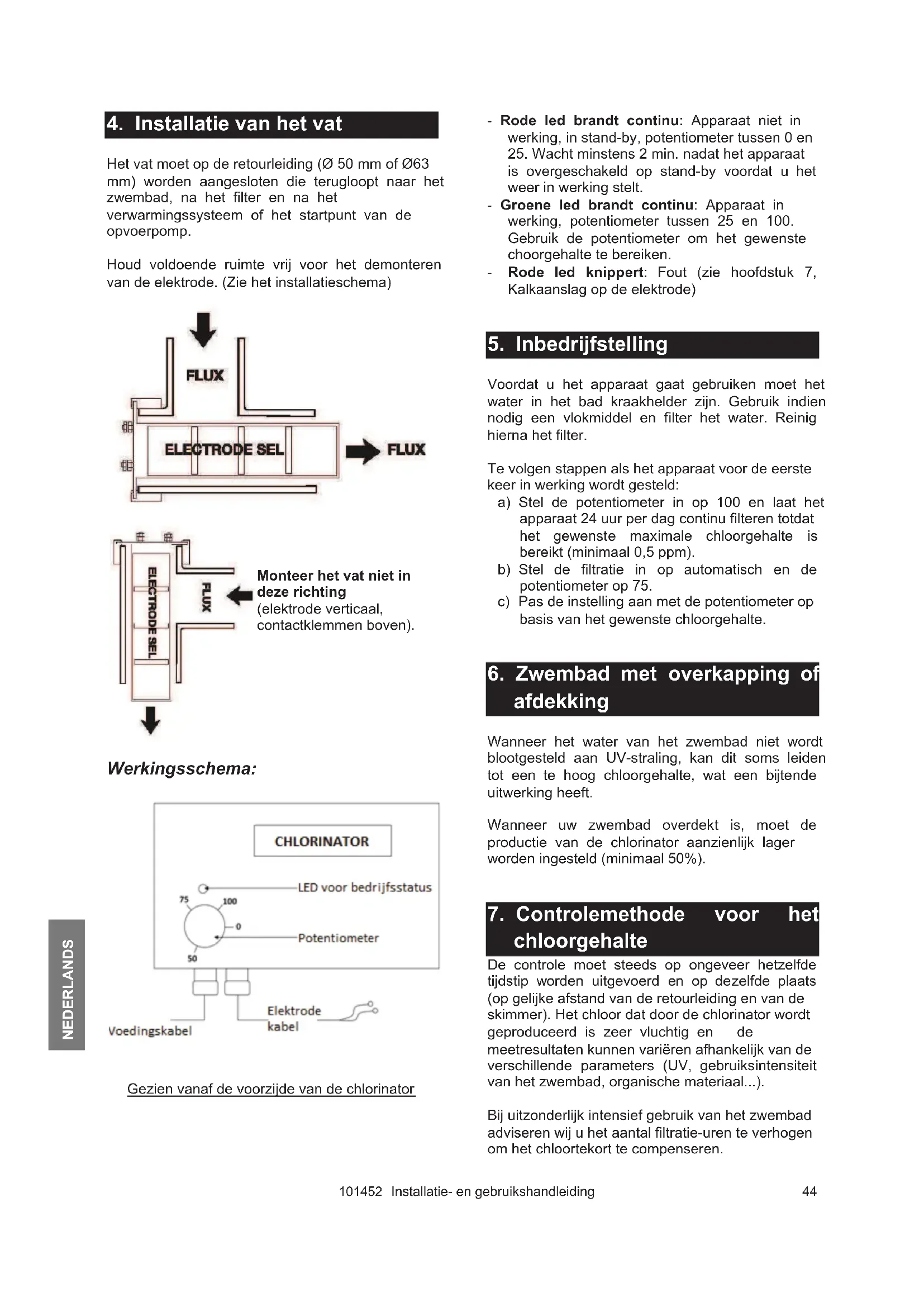 Stabilisator zwischen 20 bis 80 g/m3 empfohlen 40 g/m3 Watertemperatuur apparaat niet gebruiken onder de 15 °C Chloorgehalte tussen 0,5 en 2,5 ppm Elektrische aansluiting 230 volt-50/60 Hz, Pmax 100 W en aangestuurd bij de filterpomp.
