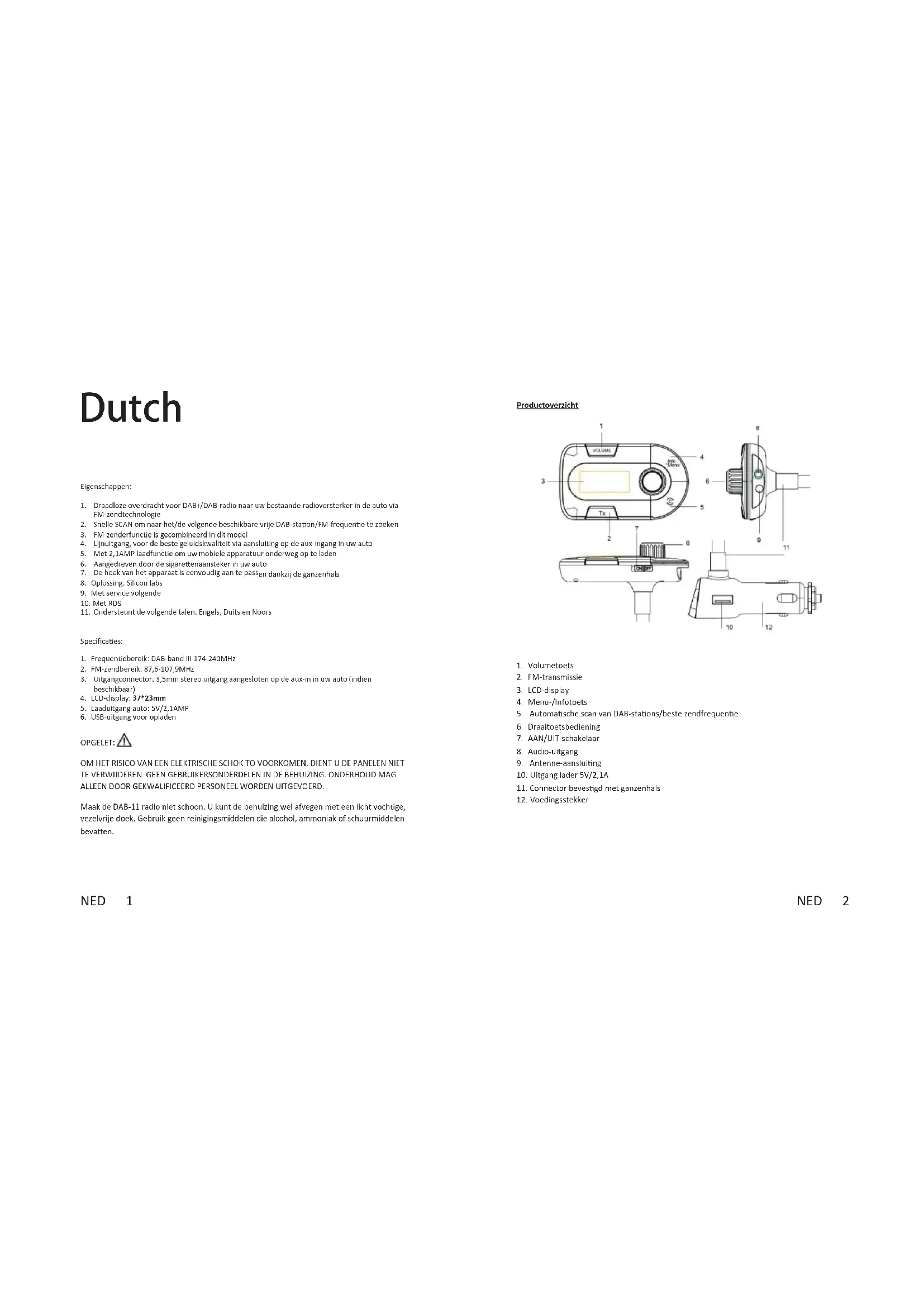 KEN U kunt als volgt de funce LIJN UIT gebruiken voor een betere geluidskwaliteit: - Sluit de AUX-kabel (inbegrepen) van de uitgang van de DAB-11 auto-adapter aan op de aux-ingang van uw auto - Het audiosignaal van de DAB auto-adapter zal nu direct naar de luidsprekers in de auto worden gestuurd NED 4NED 3ALLE RECHTEN VOORBEHOUDEN, AUTEURSRECHT DENVER ELECTRONICS A/S
