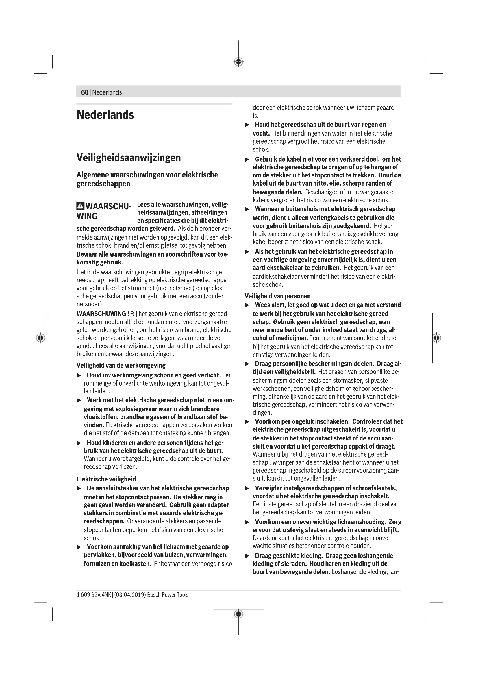 Barra telescopica a serraggio rapido 2 608 598 111 Serbatoio a pressione per l’acqua 2 609 390 308 Aspiratore a umido / a secco GAS 35MAFC Aspiratore a umido / a secco GAS 55MAFC Servizio di assistenza e consulenza tecnica Il servizio di assistenza risponde alle Vostre domande relati- ve alla riparazione e alla manutenzione del Vostro prodotto nonché concernenti i pezzi di ricambio. Disegni in vista esplosa e informazioni relative ai pezzi di ricambio sono con- sultabili anche sul sito www.bosch-pt.com Il team di consulenza tecnica Bosch sarà lieto di rispondere alle Vostre domande in merito ai nostri prodotti e accessori. In caso di richieste o di ordinazione di pezzi di ricambio, co- municare sempre il codice prodotto a 10cifre riportato sulla targhetta di fabbricazione dell’elettroutensile. Italia Tel.: (02) 3696 2314 E-Mail: pt.hotlinebosch@it.bosch.com Svizzera Sul sito www.bosch-pt.com/ch/it è possible ordinare diret- tamente on-line i ricambi. Tel.: (044) 8471513 Fax: (044) 8471553 E-Mail: Aftersales.Service@de.bosch.com Smaltimento Gli elettroutensili, il supporto a colonna, gli accessori e gli imballaggi devono essere avviati ad un riciclaggio rispettoso dell’ambiente. Non gettare elettroutensili dismessi tra i rifiuti domestici! Solo per i Paesi dellaCE: Conformemente alla Direttiva Europea 2012/19/UE sui rifiu- ti di apparecchiature elettriche ed elettroniche (RAEE) ed all’attuazione del recepimento nel diritto nazionale, gli elet- troutensili diventati inservibili devono essere raccolti sepa- ratamente ed essere smaltiti/riciclati nel rispetto dell’am- biente. Bosch Power Tools 1 609 92A 4NK | (03.04.2019)60 | Nederlands Nederlands Veiligheidsaanwijzingen Algemene waarschuwingen voor elektrische gereedschappen WAARSCHU- WING Lees alle waarschuwingen, veilig- heidsaanwijzingen, afbeeldingen en specificaties die bij dit elektri- sche gereedschap worden geleverd. Als de hieronder ver- melde aanwijzingen niet worden opgevolgd, kan dit een elek- trische schok, brand en/of ernstig letsel tot gevolg hebben. Bewaar alle waarschuwingen en voorschriften voor toe- komstig gebruik. Het in de waarschuwingen gebruikte begrip elektrisch ge- reedschap heeft betrekking op elektrische gereedschappen voor gebruik op het stroomnet (met netsnoer) en op elektri- sche gereedschappen voor gebruik met een accu (zonder netsnoer). WAARSCHUWING ! Bij het gebruik van elektrische gereed- schappen moeten altijd de fundamentele voorzorgsmaatre- gelen worden getroffen, om het risico van brand, elektrische schok en persoonlijk letsel te verlagen, waaronder de vol- gende. Lees alle aanwijzingen, voordat u dit product gaat ge- bruiken en bewaar deze aanwijzingen. Veiligheid van de werkomgeving u Houd uw werkomgeving schoon en goed verlicht. Een rommelige of onverlichte werkomgeving kan tot ongeval- len leiden. u Werk met het elektrische gereedschap niet in een om- geving met explosiegevaar waarin zich brandbare vloeistoffen, brandbare gassen of brandbaar stof be- vinden. Elektrische gereedschappen veroorzaken vonken die het stof of de dampen tot ontsteking kunnen brengen. u Houd kinderen en andere personen tijdens het ge- bruik van het elektrische gereedschap uit de buurt. Wanneer u wordt afgeleid, kunt u de controle over het ge- reedschap verliezen. Elektrische veiligheid u De aansluitstekker van het elektrische gereedschap moet in het stopcontact passen. De stekker mag in geen geval worden veranderd. Gebruik geen adapter- stekkers in combinatie met geaarde elektrische ge- reedschappen. Onveranderde stekkers en passende stopcontacten beperken het risico van een elektrische schok. u Voorkom aanraking van het lichaam met geaarde op- pervlakken, bijvoorbeeld van buizen, verwarmingen, fornuizen en koelkasten. Er bestaat een verhoogd risico door een elektrische schok wanneer uw lichaam geaard is. u Houd het gereedschap uit de buurt van regen en vocht. Het binnendringen van water in het elektrische gereedschap vergroot het risico van een elektrische schok. u Gebruik de kabel niet voor een verkeerd doel, om het elektrische gereedschap te dragen of op te hangen of om de stekker uit het stopcontact te trekken. Houd de kabel uit de buurt van hitte, olie, scherpe randen of bewegende delen. Beschadigde of in de war geraakte kabels vergroten het risico van een elektrische schok. u Wanneer u buitenshuis met elektrisch gereedschap werkt, dient u alleen verlengkabels te gebruiken die voor gebruik buitenshuis zijn goedgekeurd. Het ge- bruik van een voor gebruik buitenshuis geschikte verleng- kabel beperkt het risico van een elektrische schok. u Als het gebruik van het elektrische gereedschap in een vochtige omgeving onvermijdelijk is, dient u een aardlekschakelaar te gebruiken. Het gebruik van een aardlekschakelaar vermindert het risico van een elektri- sche schok. Veiligheid van personen u Wees alert, let goed op wat u doet en ga met verstand te werk bij het gebruik van het elektrische gereed- schap. Gebruik geen elektrisch gereedschap, wan- neer u moe bent of onder invloed staat van drugs, al- cohol of medicijnen. Een moment van onoplettendheid bij het gebruik van het elektrische gereedschap kan tot ernstige verwondingen leiden. u Draag persoonlijke beschermingsmiddelen. Draag al- tijd een veiligheidsbril. Het dragen van persoonlijke be- schermingsmiddelen zoals een stofmasker, slipvaste werkschoenen, een veiligheidshelm of gehoorbescher- ming, afhankelijk van de aard en het gebruik van het elek- trische gereedschap, vermindert het risico van verwon- dingen. u Voorkom per ongeluk inschakelen. Controleer dat het elektrische gereedschap uitgeschakeld is, voordat u de stekker in het stopcontact steekt of de accu aan- sluit en voordat u het gereedschap oppakt of draagt. Wanneer u bij het dragen van het elektrische gereed- schap uw vinger aan de schakelaar hebt of wanneer u het gereedschap ingeschakeld op de stroomvoorziening aan- sluit, kan dit tot ongevallen leiden. u Verwijder instelgereedschappen of schroefsleute