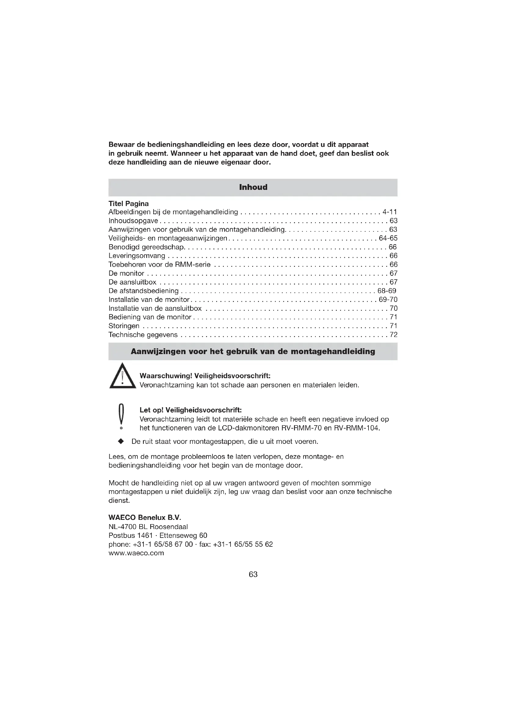 - Montage van de monitor Algemene montagevoorschriften! Voordat u de monitor aanbrengt, moet u rekening houden met de volgende punten: – Monitor plaatsen om uit te proberen. – De plaats van montage moet vlak zijn. – Controleer vóór de definitieve montage, of er ook boven de montageplaats voldoende vrije ruimte is voor het aanbrengen van borgringen en moeren. – Houd rekening met het gewicht van de monitor. Is een steviger constructie (grotereborgringen of plaatjes) noodzakelijk? – Is de aanleg van de set aansluitkabels en van de verbindingskabel naar de monitor mogelijk? – Let er bij het plaatsen van de monitor op, dat deze niet in het uitslagbereik van een AIRBAG wordt gemonteerd. Anders bestaat bij activering kans op verwondingen. Monteer de monitor niet in de bewegingsruimte voor het hoofd.Installatie van de monitor Voer voorafgaand aan de montage een functietest uit. Bevindt zich in het voertuig op een geschikte plaats, b.v. tussen bestuurders- en bijrijdersplaats een binnenverlichtingslampje, dan kan de dakmonitor op deze plaats worden geïnstalleerd. Controleer of de verbindingskabel lang genoeg is om de afstand van montageplaats naar aansluitbox te overbruggen. Let op! Let erop dat de monitor op de plaats van montage stevig genoeg bevestigd kan worden (zie H 1.4). Is de dakbekleding stevig genoeg? Kan door bevestiging met schroeven genoeg stevigheid worden bereikt (zie H 1.5)? Controleer of u de monitor open kunt klappen (zie H 1.5). Let op! Op de binnenverlichting mag geen stroom staan, om tijdens de installatie van de monitor kortsluiting e.d. te voorkomen. Verwijder de binnenverlichtingslamp (zie H 1.1). Monteer de montageplaat (zie H 1.2). Leg de verbindingskabel van de monitor naar de plaats waar u de installatie van de aansluitbox gepland hebt. Sluit de voedingskabel van de originele binnenverlichting op de aansluitingen van de monitor aan (op + en — hoeft niet te worden gelet) (zie H 1.3). Steek de verbindingskabel in de bus (zie H 1.6). Houd beslist rekening met de veiligheidsvoorschriften. Installatie van de aansluitbox De montageplaats moet tegen vocht beschermd zijn. Wegens de compacte bouw is montage onder het dashboard aan te bevelen. De box kan met de meegeleverde plaatschroeven of met zelfklevend klittenband (niet in de levering inbegrepen) worden bevestigd. Neem de veiligheids- en montageaanwijzingen in acht! De voedingsspanning moet via een geschakelde spanningsbron, zoals klem 15, plaatsvinden. Het systeem neemt ook in uitgeschakelde toestand (IR-ontvangst geactiveerd) een beetje vermogen op, dat over een langere periode de voertuigaccu kan ontladen. De aansluitbox biedt ingangen voor 2 videobronnen (zie I 2). Dat kan bijvoorbeeld een DVD-speler (WAECO art.-nr. DVD-PL-10) of een camera zijn. Steek de RCA-kabel van de videobronnen in de bussen VIDEO/AUDIO (zie I 2). Bij gebruik van maar één audio-ingang wordt een mono-audiosignaal opgewekt. 70Bediening van de monitor Na volledige aansluiting schakelt de monitor zichzelf bij aansluiting van de voedingsspan- ning automatisch in (POWER DIRECT = ON) of schakelt u het apparaat via de afstandsbediening (knop POWER) in (zie F 1.1). Is er een videobron aangesloten en in bedrijf, dan verschijnt er beeld; via de IR-koptelefoon toebehoren HS-10 (zie G 1) of de autoradio (bij gebruik van de FM-MOD-10) wordt het audiosignaal overgedragen. Om van videokanaal te wisselen, gebruikt u de knop AV (zie F 1.7) op de afstandsbediening. Als u instellingen wilt wijzigen dan is dat via de MODE- en VOL-toetsen op de monitor (zie D 1.5/1.6/1.7) of van de afstandsbediening (zie F 1.5/1.4) mogelijk. De monitor kan naar beide zijden en naar achteren ca. 15° worden gedraaid (zie G 1 en G 2). Gebruik van de koptelefoon HS-10 De monitoren RV-RMM-70 en RV-RMM-104 zijn met een IR (infrarood)-zender uitgerust. Dit maakt het gebruik van de draadloze IR-koptelefoon HS-10 mogelijk (verdere aanwijzingen in de handleiding). Om er gebruik van te maken moet u zich binnen een bereik van ca. 120° horizontaal en 60° verticaal voor de monitor ophouden (zie G). Dan kunt u verzekerd zijn van een storingsvrije ontvangst. Storingen Flikkeren van het beeld De voedingsspanning is onder de 12 Volt gedaald. Laad de voertuigaccu op. Zorg voor een zo kort mogelijke aansluitkabel van spanningsbron naar aansluitbox. Lopen van het beeld Het ingestelde videoformaat (COLOR SYSTEM) past niet bij de videobron. Verander het formaat, bijvoorbeeld van NTSC naar PAL. 71Technische gegevens Afmetingen (b x h x d): 210 x 230 x 40 mm (RV-RMM-70) Afmetingen (b x h x d): 285 x 310 x 40 mm (RV-RMM-104) Bedrijfsspanning: 12 V gelijkstroom, max. 15 V Stroomopname: max. 16 Watt incl. binnenverlichting (RV-RMM-70) 18 Watt incl. binnenverlichting (RV-RMM-104) Beeldgrootte: 7”, 17,7 cm diagonaal (RV-RMM-70) Beeldgrootte: 10,4”, 26,4 cm diagonaal (RV-RMM-104) Beeldpunten: 337.000 pixels (RV-RMM-70) Beeldpunten: 480.000 pixels (RV-RMM-104) Videostandaard: NTSC/PAL Bedrijfstemperatuur: 0 tot +60 °C Gewicht: ca. 1,5 kg (RV-RMM-70) Gewicht: ca. 2,5 kg (RV-RMM-104) Veranderingen ten behoeve van technische vooruitgang voorbehouden. Bewaar deze handleiding goed en geef deze in geval van verkoop samen met het apparaat door aan de koper. Indien u nog vragen hebt over de RV-RMM-70 of de RV-RMM-104, neemt u dan contact op met: WAECO Benelux B.V. NL-4700 BL Roosendaal Postbus 1461 · Ettenseweg 60 phone: +31-1 65/58 67 00 · fax: +31-1 65/55 55 62 www.waeco.com 72• LCD-loftsmonitor Læs betjeningsvejledningen, inden du går i gang med at bruge apparatet og opbe- var betjeningsvejledningen til senere brug. Hvis du videresælger apparatet, bedes du sørge for at give vejledningen videre til den nye ejer. Indholdsfortegnelse Titel Side Illustrationer til monteringsvejledningen p. 4