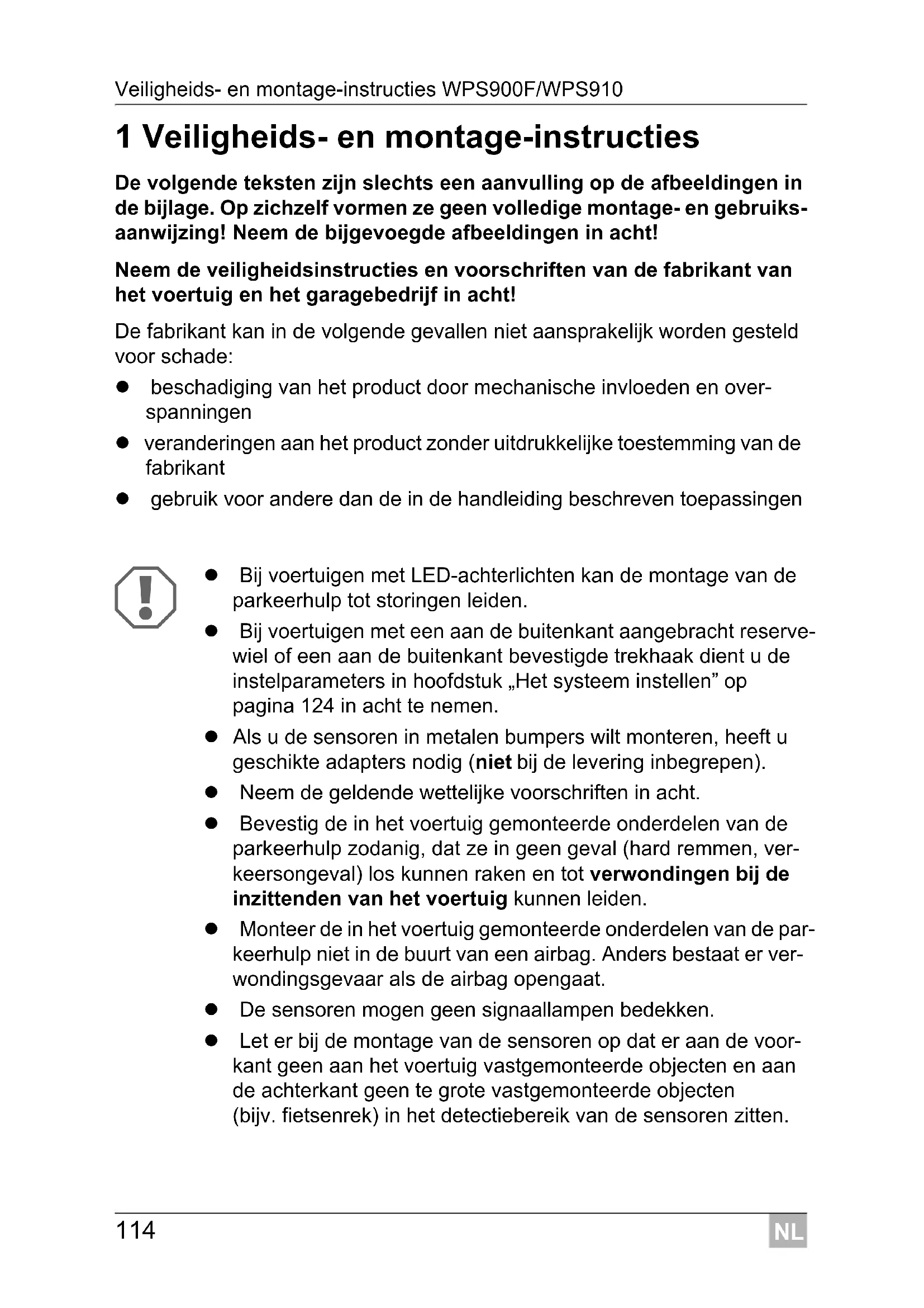 1 Veiligheids- en montage-instructies De volgende teksten zijn slechts een aanvulling op de afbeeldingen in de bijlage. Op zichzelf vormen ze geen volledige montage- en gebruiks- aanwijzing! Neem de bijgevoegde afbeeldingen in acht! Neem de veiligheidsinstructies en voorschriften van de fabrikant van het voertuig en het garagebedrijf in acht! De fabrikant kan in de volgende gevallen niet aansprakelijk worden gesteld voor schade: beschadiging van het product door mechanische invloeden en over- spanningen veranderingen aan het product zonder uitdrukkelijke toestemming van de fabrikant gebruik voor andere dan de in de handleiding beschreven toepassingen