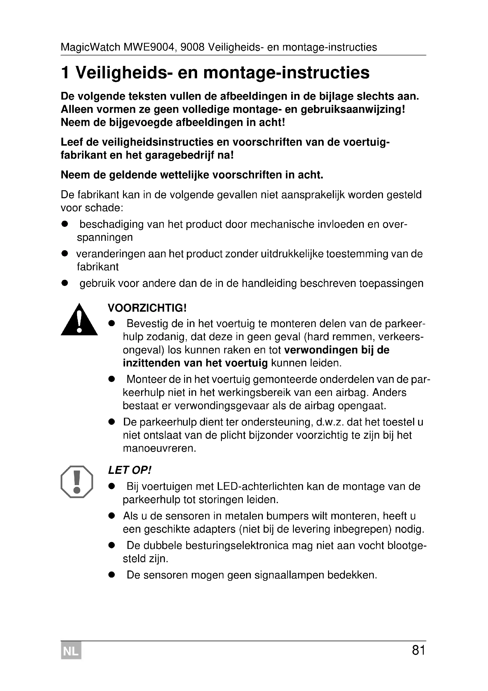 LET OP! Bij voertuigen met LED-achterlichten kan de montage van de parkeerhulp tot storingen leiden. Als u de sensoren in metalen bumpers wilt monteren, heeft u een geschikte adapters (niet bij de levering inbegrepen) nodig. De dubbele besturingselektronica mag niet aan vocht blootge- steld zijn. De sensoren mogen geen signaallampen bedekken.NL Omvang van de levering MagicWatch MWE9004, 9008