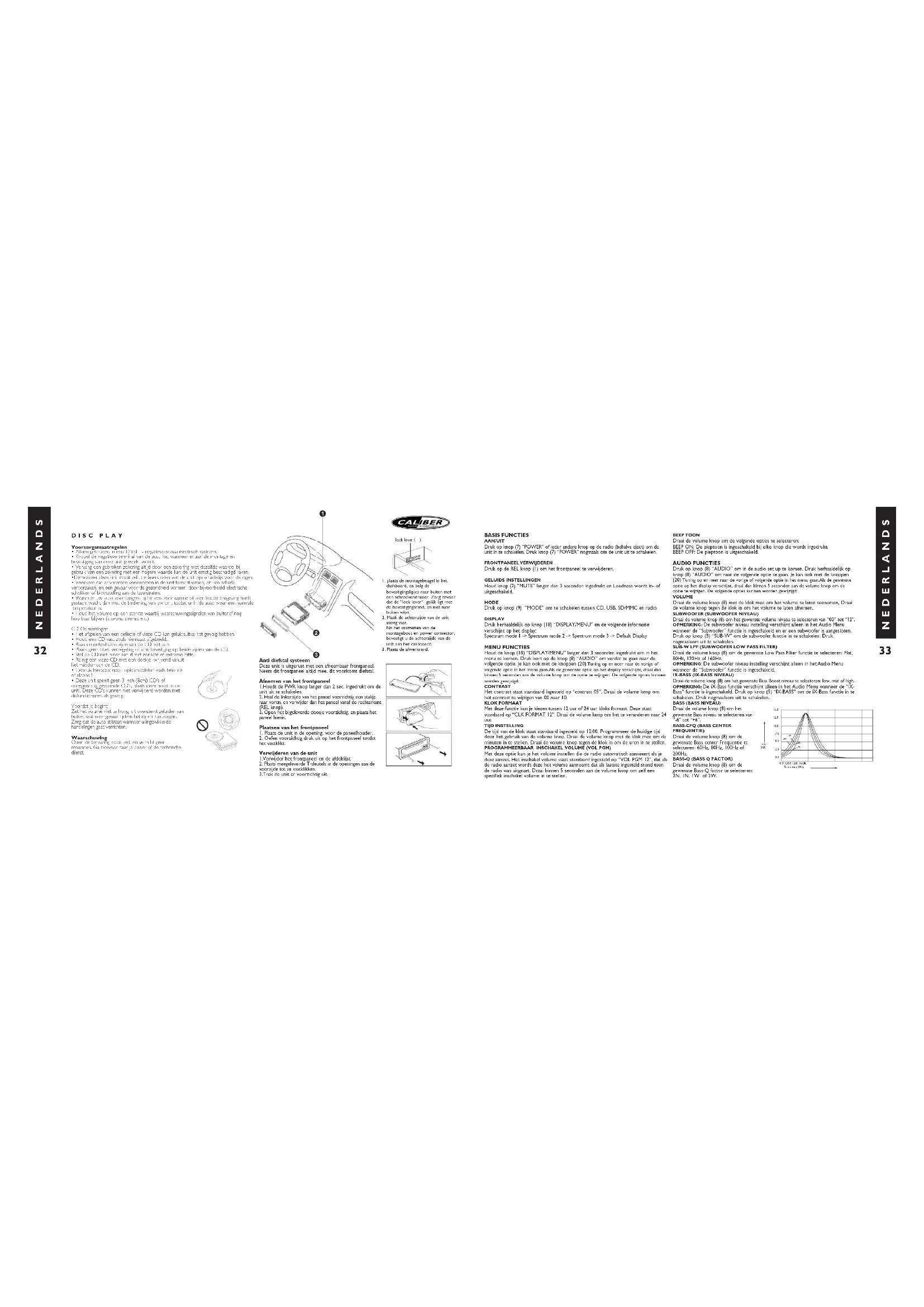 BASIS FUNCTIES AAN/UIT Druk op knop (7) “POWER” of ieder andere knop op de radio (behalve eject) om de unit in te schakelen. Druk knop (7) “POWER” nogmaals om de unit uit te schakelen. FRONTPANEEL VERWIJDEREN Druk op de REL knop (1) om het frontpaneel te verwijderen. GELUIDS INSTELLINGEN Houd knop (2) “MUTE” langer dan 3 seconden ingedrukt en Loudness wordt in- of uitgeschakeld. MODE Druk op knop (9) “MODE” om te schakelen tussen CD, USB, SD/MMC en radio. DISPLAY Druk herhaaldelijk op knop (18) “DISPLAY/MENU” en de volgende informatie verschijnt op het display: Spectrum mode 1 -> Spectrum mode 2 -> Spectrum mode 3 -> Default Display MENU FUNCTIES Houd de knop (18) “DISPLAY/MENU” langer dan 3 seconden ingedrukt om in het menu te komen. Druk kort op de knop (8) “AUDIO” om verder te gaan naar de volgende optie. Je kan ook met de knoppen (20) Tuning op en neer naar de vorige of volgende optie in het menu gaan.Als de gewenste optie op het display verschijnt, draai dan binnen 5 seconden aan de volume knop om de optie te wijzigen. De volgende opties kunnen worden gewijzigd: CONTRAST Het contrast staat standaard ingesteld op “contrast 05”. Draai de volume knop om het contrast te wijzigen van 00 naar 10. KLOK FORMAAT Met deze functie kun je kiezen tussen 12 uur of 24 uur kloks formaat. Deze staat standaard op “CLK FORMAT 12”. Draai de volume knop om het te veranderen naar 24 uur. TIJD INSTELLING De tijd van de klok staat standaard ingesteld op 12:00. Programmeer de huidige tijd door het gebruik van de volume knop. Draai de volume knop met de klok mee om de minuten in te stellen, Draai de volume knop tegen de klok in om de uren in te stellen. PROGRAMMEERBAAR INSCHAKEL VOLUME (VOL PGM) Met deze optie kun je het volume instellen die de radio automatisch aanneemt als je deze aanzet. Het inschakel volume staat standaard ingesteld op “VOL PGM 12”, dat als de radio aanzet wordt deze het volume aanneemt dat als laatste ingesteld stond toen de radio was uitgezet. Draai binnen 5 seconden aan de volume knop om zelf een specifiek inschakel volume in te stellen. BEEP TOON Draai de volume knop om de volgende opties te selecteren: BEEP ON: De pieptoon is ingeschakeld bij elke knop die wordt ingedrukt. BEEP OFF: De pieptoon is uitgeschakeld. AUDIO FUNCTIES Druk op knop (8) “AUDIO” om in de audio set up te komen. Druk herhaaldelijk op knop (8) “AUDIO” om naar de volgende optie te gaan. Je kan ook met de knoppen (20) Tuning op en neer naar de vorige of volgende optie in het menu gaan.Als de gewenste optie op het display verschijnt, draai dan binnen 5 seconden aan de volume knop om de optie te wijzigen. De volgende opties kunnen worden gewijzigd: VOLUME Draai de volume knop (8) met de klok mee om het volume te laten toenemen, Draai de volume knop tegen de klok in om het volume te laten afnemen. SUBWOOFER (SUBWOOFER NIVEAU) Draai de volume knop (8) om het gewenste volume niveau te selecteren van “00” tot “12”. OPMERKING: De subwoofer niveau instelling verschijnt alleen in het Audio Menu wanneer de “Subwoofer” functie is ingeschakeld en er een subwoofer is aangesloten. Druk op knop (3) “SUB-W” om de subwoofer functie in te schakelen. Druk nogmaalsom uit te schakelen. SUB-W LPF (SUBWOOFER LOW PASS FILTER) Draai de volume knop (8) om de gewenste Low Pass Filter functie te selecteren: Flat, 80Hz, 120Hz of 160Hz. OPMERKING: De subwoofer niveau instelling verschijnt alleen in het Audio Menu wanneer de “Subwoofer” functie is ingeschakeld. IX-BASS (IX-BASS NIVEAU) Draai de volume knop (8) om het gewenste Bass Boost niveau te selecteren: low, mid of high. OPMERKING: De iX-Bass functie verschijnt alleen in het Audio Menu wanneer de “iX- Bass” functie is ingeschakeld. Druk op knop (5) “IX-BASS” om de iX-Bass functie in te schakelen. Druk nogmaalsom uit te schakelen. BASS (BASS NIVEAU) Draai de volume knop (8) om het gewenste Bass niveau te selecteren van “-6” tot “+6”. BASS-CFQ (BASS CENTERFREQUENTIE) Draai de volume knop (8) om de gewenste Bass center Frequentie te selecteren: 60Hz, 80Hz, 100Hz of 200Hz. BASS-Q (BASS Q FACTOR) Draai de volume knop (8) om de gewenste Bass-Q factor te selecteren: 2N, 1N, 1W of 2W. Level (dB) Frequency (Hz)