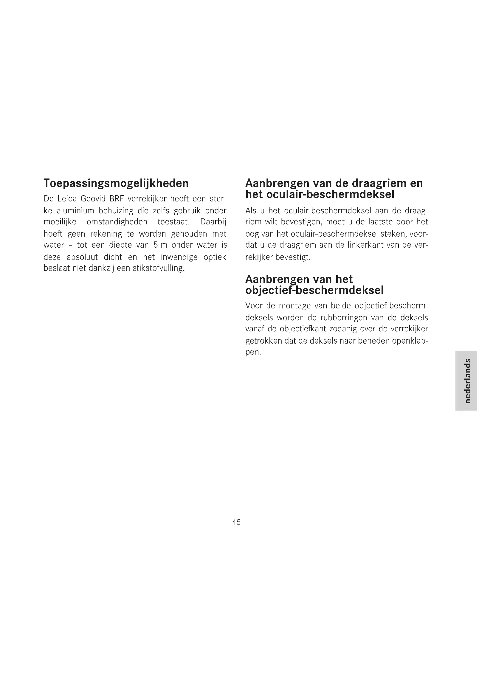 - Leveringsomvang - Verrekijker - 1 lithium batterij 3 V type CR 2 - Draagriem - Paraattas - Oculair-beschermdeksel - 2 objectief-beschermdeksels - Garantiekaart Voorwoord Geachte klant, De naam Leica staat voor de hoogste kwaliteit en fijnmechanische precisie in combinatie met de grootste betrouwbaarheid en lange levensduur. Wij wensen u veel succes en plezier met uw nieu- we Leica Geovid BRF verrekijker. Om deze goed te kunnen gebruiken, adviseren wij u eerst deze handleiding goed te lezen.44 Inhoudsopgave Benaming van de onderdelen p. 43