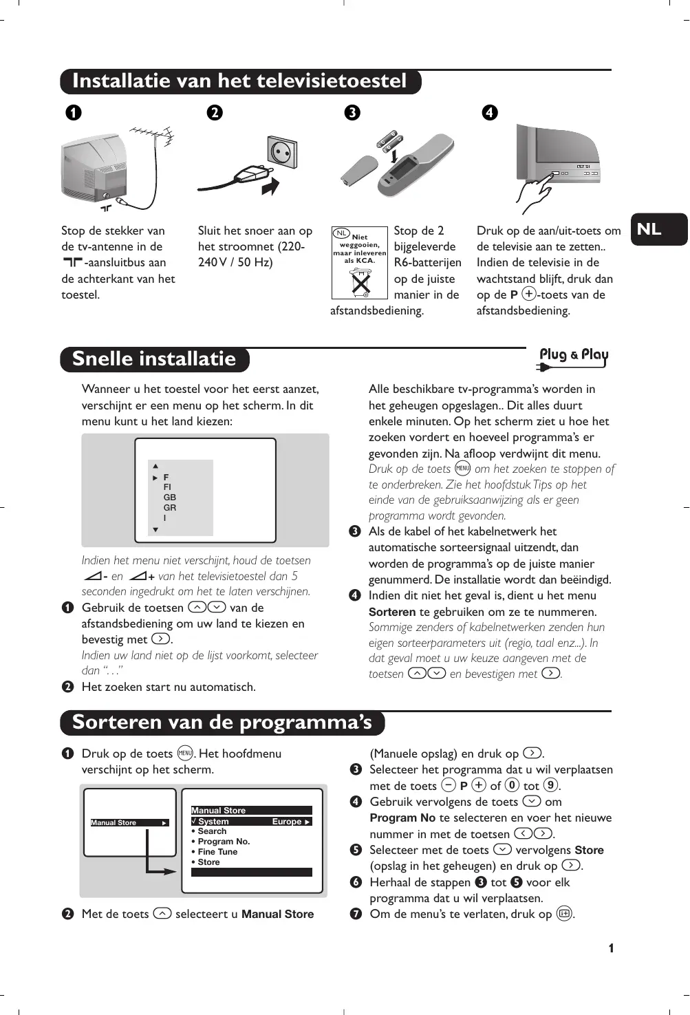 Indien het menu niet verschijnt, houd de toetsen ”- en ”+ van het televisietoestel dan 5 seconden ingedrukt om het te laten verschijnen. & Gebruik de toetsen îÏ van de afstandsbediening om uw land te kiezen en bevestig met ¬. Indien uw land niet op de lijst voorkomt, selecteer dan “. . .” é Het zoeken start nu automatisch. Alle beschikbare tv-programma’s worden in het geheugen opgeslagen.. Dit alles duurt enkele minuten. Op het scherm ziet u hoe het zoeken vordert en hoeveel programma’s er gevonden zijn. Na afloop verdwijnt dit menu. Druk op de toets H om het zoeken te stoppen of te onderbreken. Zie het hoofdstuk Tips op het einde van de gebruiksaanwijzing als er geen programma wordt gevonden. “ Als de kabel of het kabelnetwerk het automatische sorteersignaal uitzendt, dan worden de programma’s op de juiste manier genummerd. De installatie wordt dan beëindigd. ‘ Indien dit niet het geval is, dient u het menu Sorteren te gebruiken om ze te nummeren. Sommige zenders of kabelnetwerken zenden hun eigen sorteerparameters uit (regio, taal enz...). In dat geval moet u uw keuze aangeven met de toetsen îÏ en bevestigen met ¬. Sorteren van de programma’s & Druk op de toets H. Het hoofdmenu verschijnt op het scherm. Manual Store