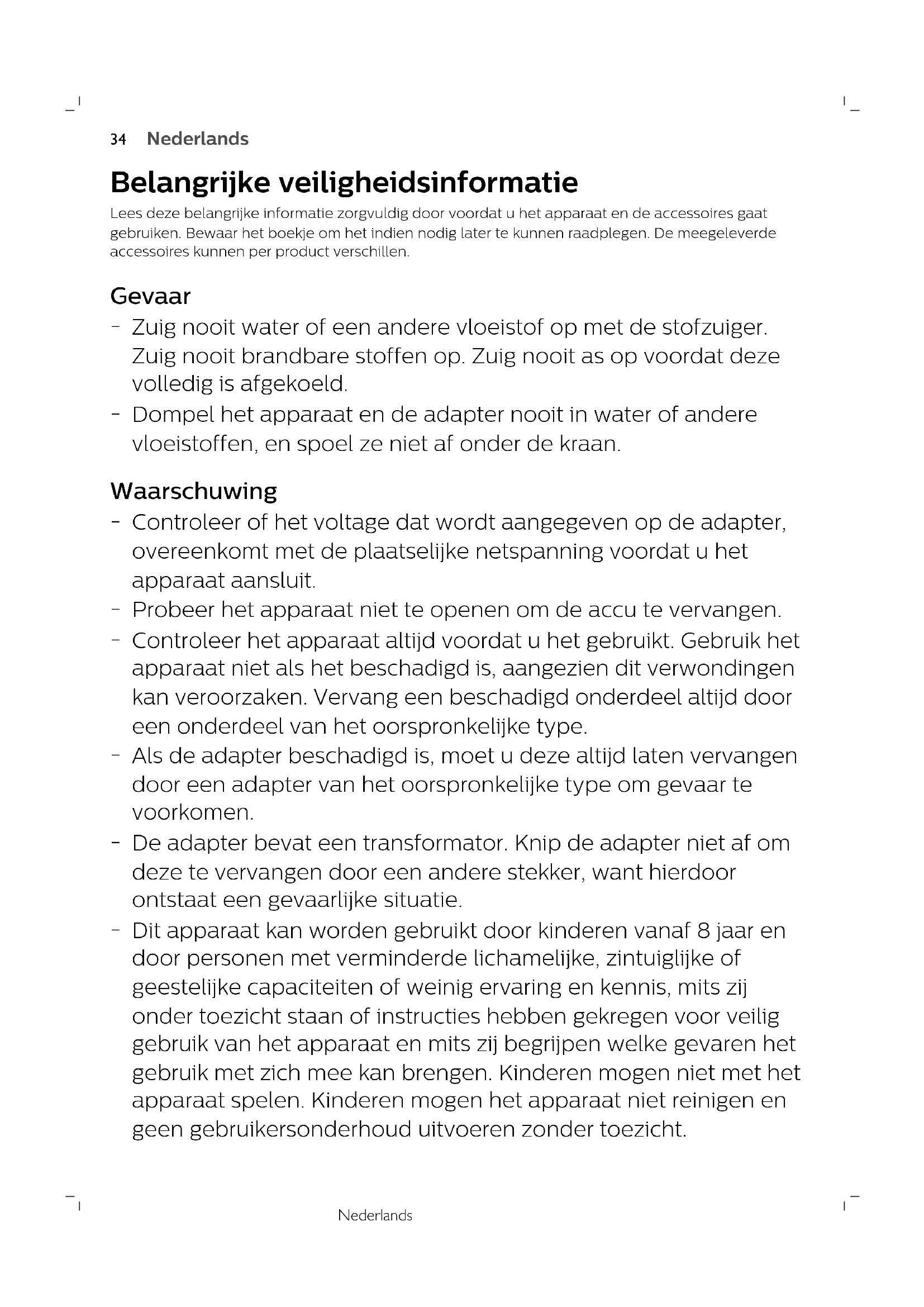 Dit apparaat kan worden gebruikt door kinderen vanaf 8 jaar en door personen met verminderde lichamelijke, zintuiglijke of geestelijke capaciteiten of weinig ervaring en kennis, mits zij onder toezicht staan of instructies hebben gekregen voor veilig gebruik van het apparaat en mits zij begrijpen welke gevaren het gebruik met zich mee kan brengen. Kinderen mogen niet met het apparaat spelen. Kinderen mogen het apparaat niet reinigen en geen gebruikersonderhoud uitvoeren zonder toezicht.