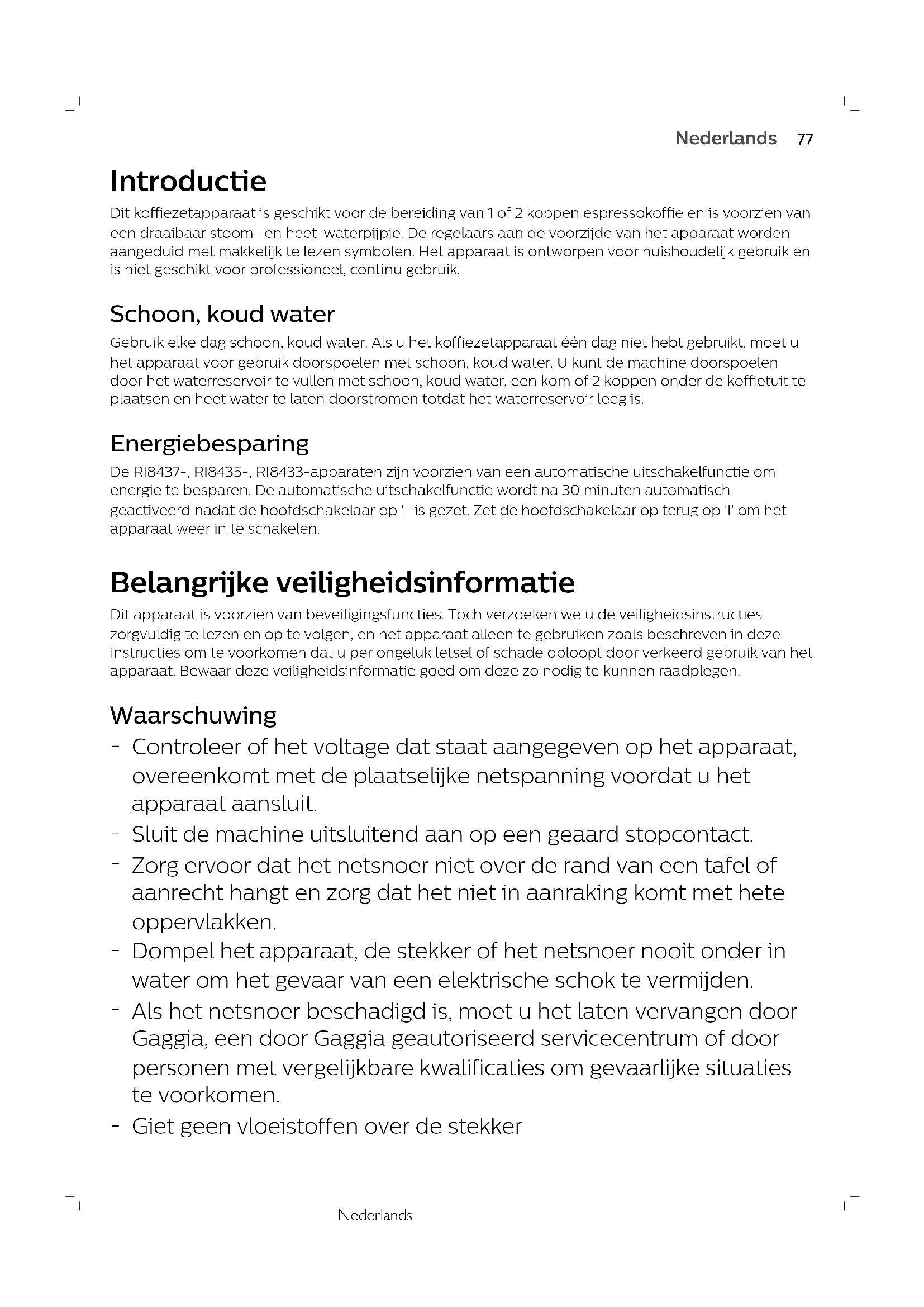 ItalianoNederlands Introductie Dit koffiezetapparaat is geschikt voor de bereiding van 1 of 2 koppen espressokoffie en is voorzien vaneen draaibaar stoom- en heet-waterpijpje. De regelaars aan de voorzijde van het apparaat wordenaangeduid met makkelijk te lezen symbolen. Het apparaat is ontworpen voor huishoudelijk gebruik enis niet geschikt voor professioneel, continu gebruik. Schoon, koud water Gebruik elke dag schoon, koud water. Als u het koffiezetapparaat één dag niet hebt gebruikt, moet uhet apparaat voor gebruik doorspoelen met schoon, koud water. U kunt de machine doorspoelendoor het waterreservoir te vullen met schoon, koud water, een kom of 2 koppen onder de koffietuit teplaatsen en heet water te laten doorstromen totdat het waterreservoir leeg is. Energiebesparing De RI8437-, RI8435-, RI8433-apparaten zijn voorzien van een automatische uitschakelfunctie omenergie te besparen. De automatische uitschakelfunctie wordt na 30 minuten automatischgeactiveerd nadat de hoofdschakelaar op 'I' is gezet. Zet de hoofdschakelaar op terug op 'I' om hetapparaat weer in te schakelen. Belangrijke veiligheidsinformatie Dit apparaat is voorzien van beveiligingsfuncties. Toch verzoeken we u de veiligheidsinstructieszorgvuldig te lezen en op te volgen, en het apparaat alleen te gebruiken zoals beschreven in dezeinstructies om te voorkomen dat u per ongeluk letsel of schade oploopt door verkeerd gebruik van hetapparaat. Bewaar deze veiligheidsinformatie goed om deze zo nodig te kunnen raadplegen. Waarschuwing