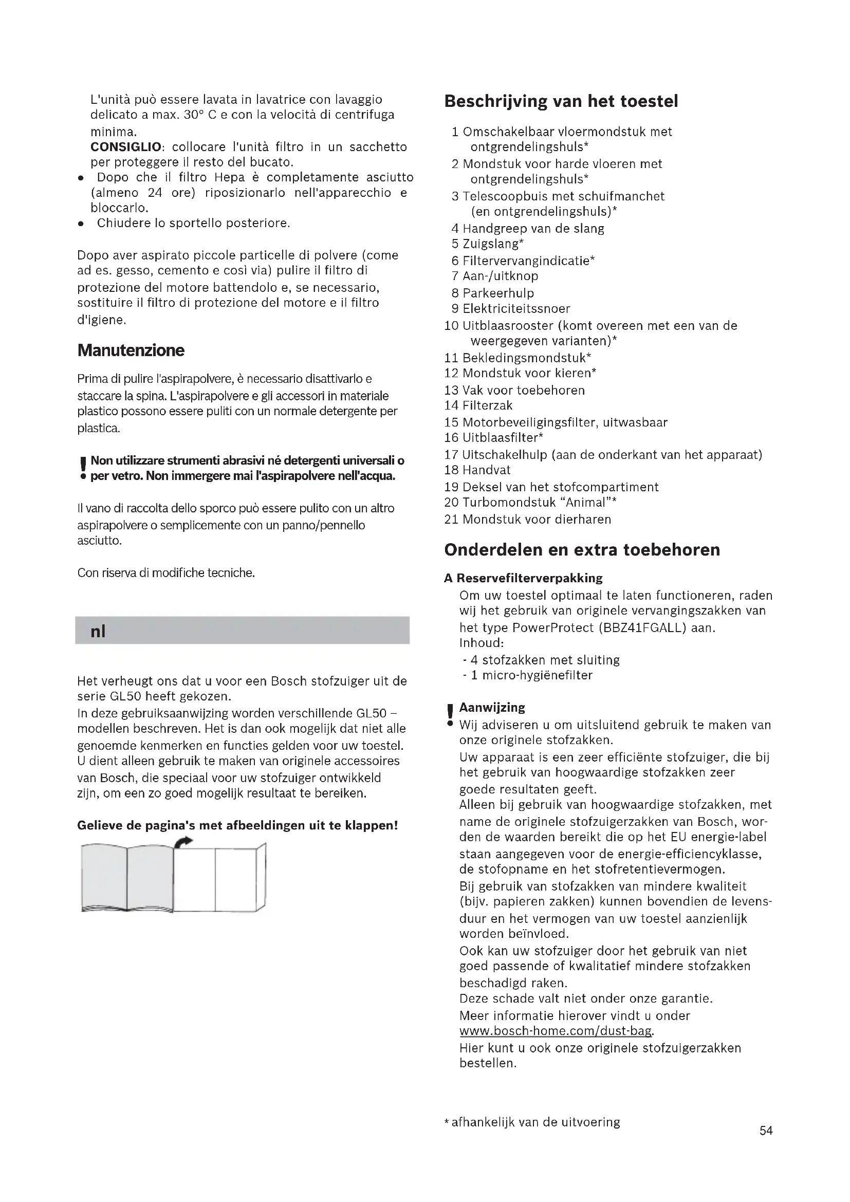 Het verheugt ons dat u voor een Bosch stofzuiger uit de serie GL50 heeft gekozen. In deze gebruiksaanwijzing worden verschillende GL50 – modellen beschreven. Het is dan ook mogelijk dat niet alle genoemde kenmerken en functies gelden voor uw toestel. U dient alleen gebruik te maken van originele accessoires van Bosch, die speciaal voor uw stofzuiger ontwikkeld zijn, om een zo goed mogelijk resultaat te bereiken. Gelieve de pagina's met afbeeldingen uit te klappen! Beschrijving van het toestel 1 Omschakelbaar vloermondstuk met ontgrendelingshuls* 2 Mondstuk voor harde vloeren met ontgrendelingshuls* 3 Telescoopbuis met schuifmanchet (en ontgrendelingshuls)* 4 Handgreep van de slang 5 Zuigslang* 6 Filtervervangindicatie* 7 Aan-/uitknop 8 Parkeerhulp 9 Elektriciteitssnoer 10 Uitblaasrooster (komt overeen met een van de weergegeven varianten)* 11 Bekledingsmondstuk* 12 Mondstuk voor kieren* 13 Vak voor toebehoren 14 Filterzak 15 Motorbeveiligingsfilter, uitwasbaar 16 Uitblaasfilter* 17 Uitschakelhulp (aan de onderkant van het apparaat) 18 Handvat 19 Deksel van het stofcompartiment 20 Turbomondstuk “Animal”* 21 Mondstuk voor dierharen Onderdelen en extra toebehoren A Reservefilterverpakking Om uw toestel optimaal te laten functioneren, raden wij het gebruik van originele vervangingszakken van het type PowerProtect (BBZ41FGALL) aan. Inhoud: - 4 stofzakken met sluiting - 1 micro-hygiënefilter