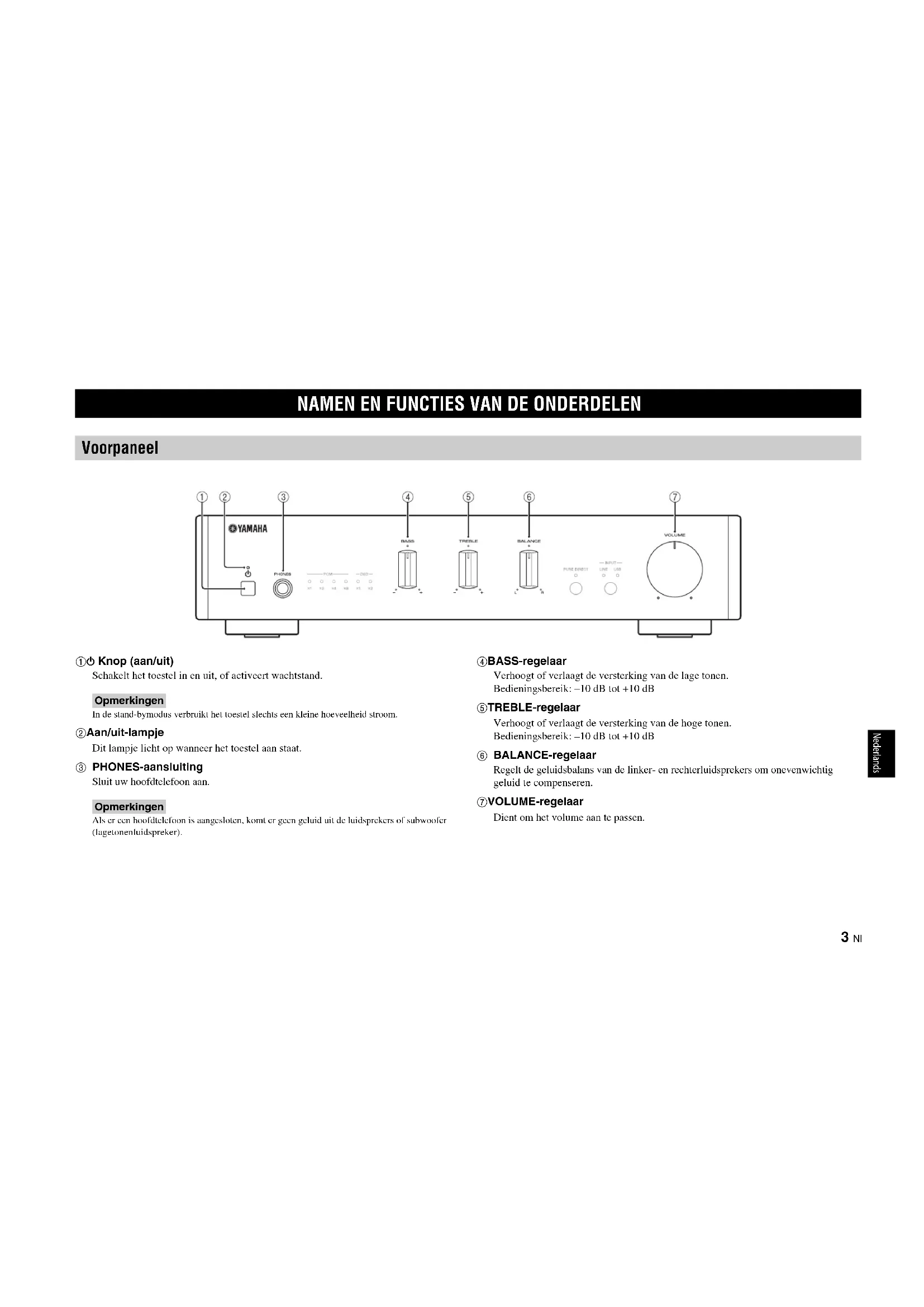 SPECIFICATIES...................................................................17 u Dit toestel is een geïntegreerde versterker die analoge stereosignalen aan een erg hoge geluidskwaliteit afspeelt. In combinatie met luidsprekers kan dit toestel muziek afspelen aan een erg hoge geluidskwaliteit. u TREBLE (hoge frequenties), BASS (lage frequenties) en BALANCE (rechter en linker geluidsbalans) kunnen naar wens worden aangepast met de bedieningen op het voorpaneel.u Met de USB DAC-functie kunt u muziek afspelen die is opgeslagen op een PC (+bladzijde 11). u Genieten van puur Hi-Fi-geluid met behulp van de functie PURE DIRECT (+bladzijde 13). u De bassen versterken door een subwoofer (lagetonenluidspreker) aan te sluiten (+bladzijde 9).Controleer of u alle volgende onderdelen ontvangen heeft. INHOUD INTRODUCTIE Wat dit toestel kan Meegeleverde accessoires Afstandsbediening Batterijen (× 2) (AA, R6, UM-3)NAMEN EN FUNCTIES VAN DE ONDERDELEN 3 Nl Nederlands 1 A Knop (aan/uit) Schakelt het toestel in en uit, of activeert wachtstand. In de stand-bymodus verbruikt het toestel slechts een kleine hoeveelheid stroom. 2 Aan/uit-lampje Dit lampje licht op wanneer het toestel aan staat.