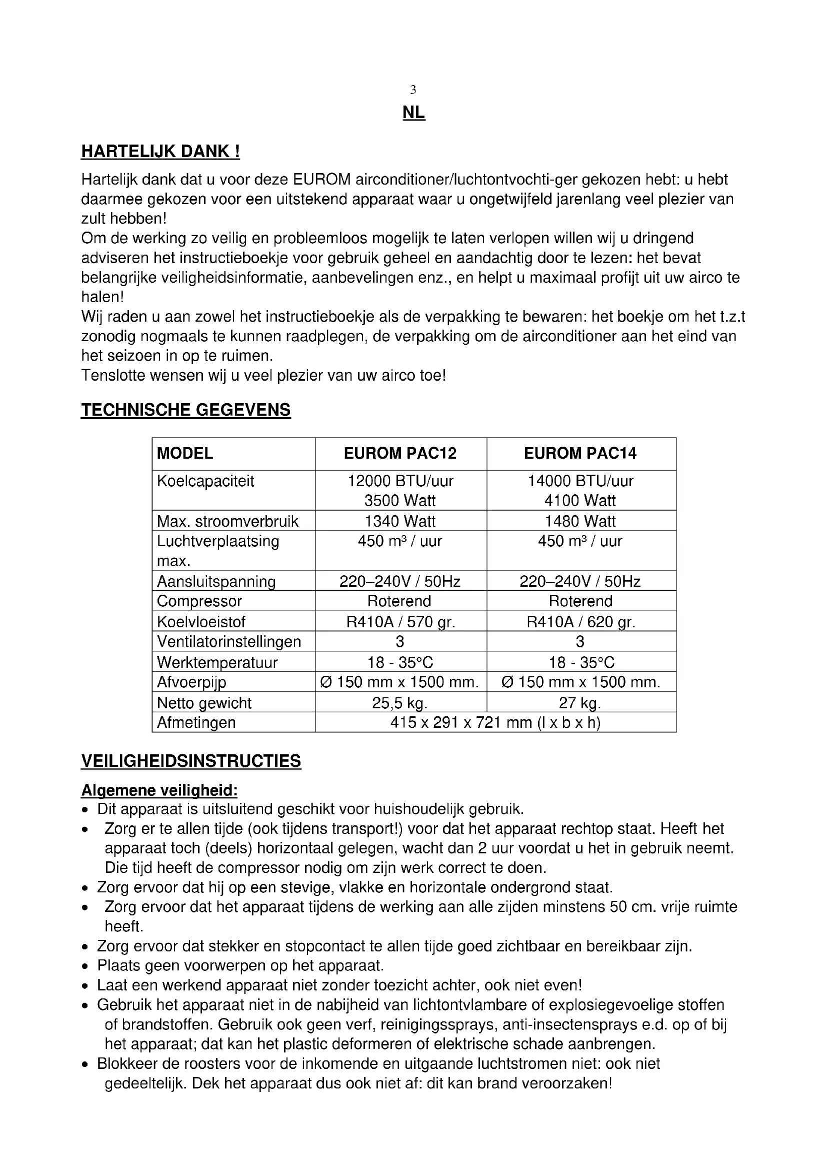 Hartelijk dank dat u voor每次都 EUROM airconditioner/luchtontvochi-ger gekozen hebt: u hebt daarmee gekozen voor een uitstekend apparaat waar u ongetwijfeld jarenlang veel plezier van zult hebben!