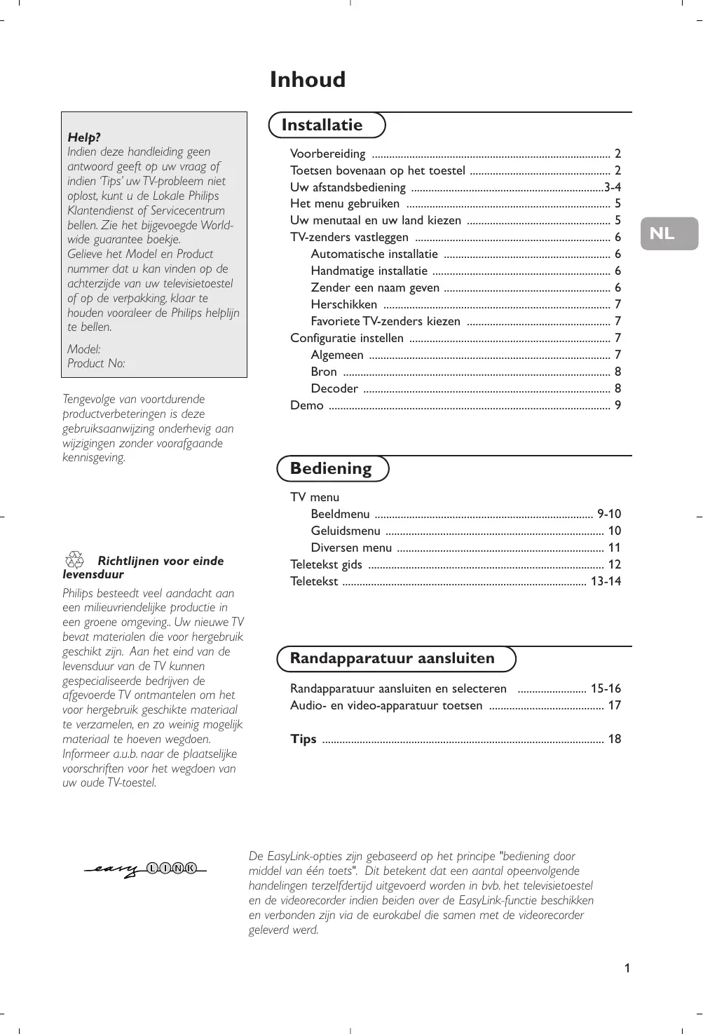 Inhoud Help? Indien deze handleiding geen antwoord geeft op uw vraag of indien ‘Tips’ uw TV-probleem niet oplost, kunt u de Lokale Philips Klantendienst of Servicecentrum bellen. Zie het bijgevoegde Worldwide guarantee boekje. Gelieve het Model en Product nummer dat u kan vinden op de achterzijde van uw televisietoestel of op de verpakking, klaar te houden vooraleer de Philips helplijn te bellen. Model: Product No: Tengevolge van voortdurende productverbeteringen is deze gebruiksaanwijzing onderhevig aan wijzigingen zonder voorafgaande kennisgeving.