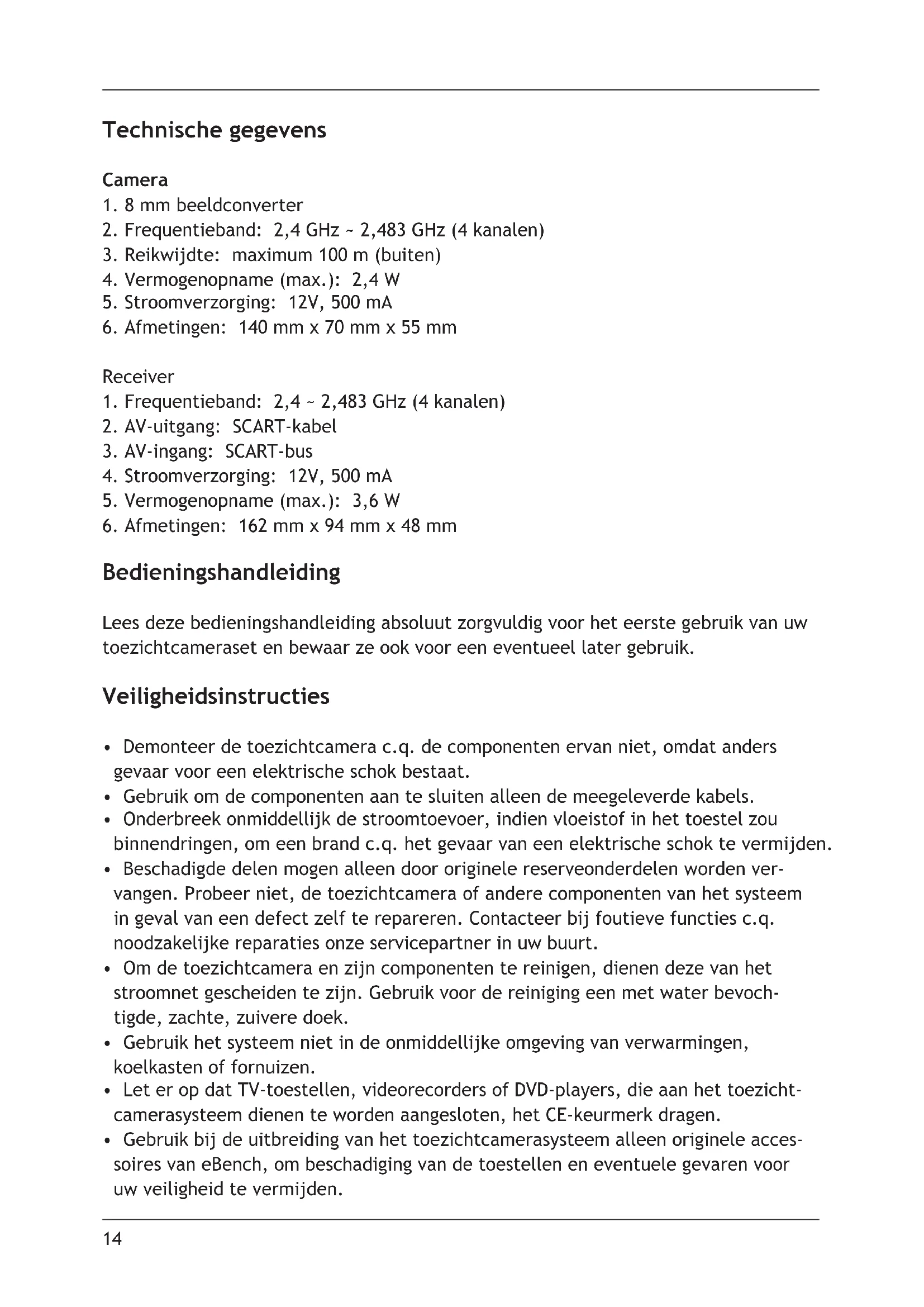 - Gebruik bij de uitbreiding van het toezichtcamerasysteem alleen originele acces- soires van eBench, om beschadiging van de toestellen en eventuele gevaren voor uw veiligheid te vermijden.14
