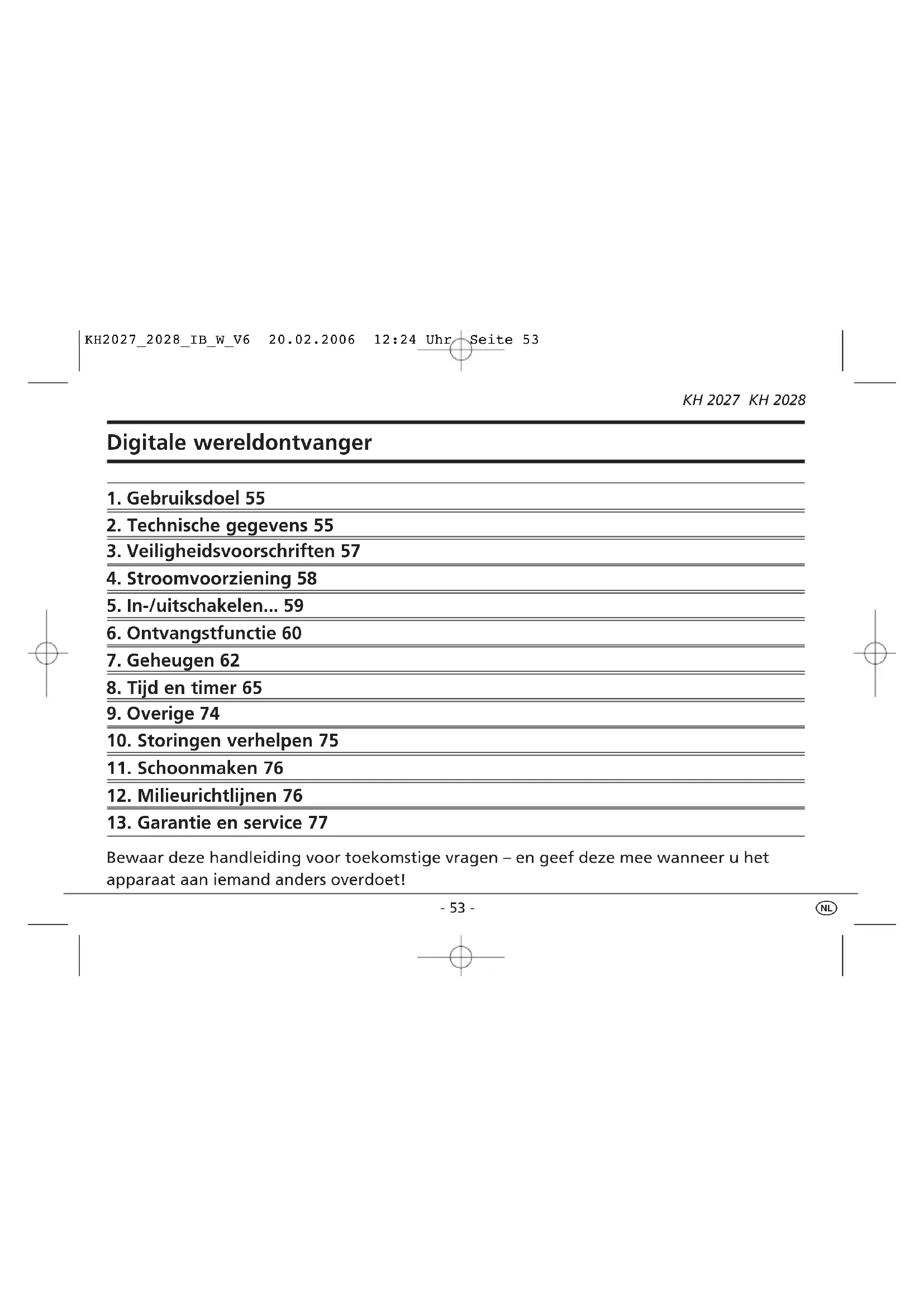 Bewaar deze handleiding voor toekomstige vragen – en geef deze mee wanneer u het apparaat aan iemand anders overdoet! KH2027_2028_IB_W_V6 20.02.2006 12:24 Uhr Seite 53 Zoekactie in geheugen starten (7d) Zenders automatisch opslaan (7b) Terugtellen instellen (8j) Geheugenposities instellen (7a) Geheugenposities oproepen (7c) Zenders opslaan (7a) Toetsen blokkeren (9) Gevoeligheid op kortegolf (6f) Zenders zoeken (6d) Instellingen wijzigen (6c, 6e, 8e, 8h, 8i, 8j) Tijden, datum instellen (8a, 8b, 8d, 8g) Ontvangstbereik kiezen (6b) Type tijdweergave wijzigen (9) Fijnafstemming van zenders (6e) Volume instellen (6a) Wektijden 1/2 instellen (8g) Wekalarm terugzetten (8h) Apparaat aanzetten (5a) Vertraagd uitschakelen (5c) Tijd + datum instellen (8a, 8b) Instelling kiezen (6c) Batterijvak (4a) Luidspreker Draagriem Apparaat schuin plaatsen (9) Telescoopantenne Apparaat uitschakelen (5b) - Zomertijd in-/uitschakelen (8f) - Wekken 1-59 min. terugzetten (8h) - Terugtellen starten / stoppen (8j) - Stoptijd starten / stoppen (8k) Geheugenblok kiezen (7a, 7c) Stoptijdfunctie activeren (8k) Hoofdtelefoonaansluiting (9) Netvoedingsadapter (4b) Zomertijd (8f)