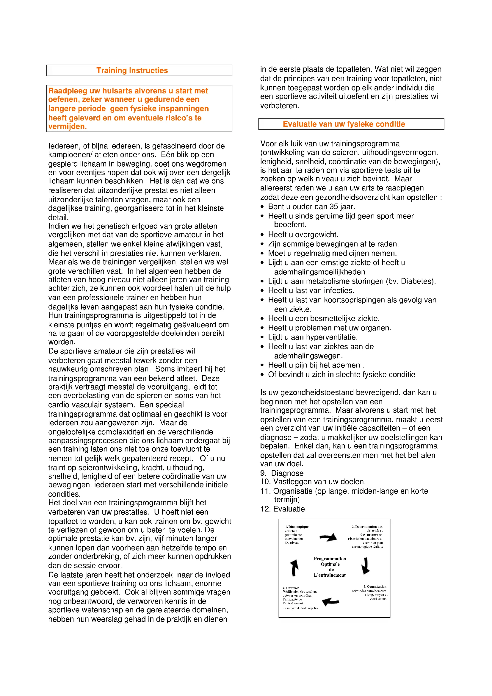 Alvorens een programma op maat op te stellen, moet u notie nemen van enkele parameters en uw maten nemen. Deze vaststellingen zullen u helpen bij het bepalen van uw huidige fysieke conditie (oa. meten van de taille enz.). Het is de bedoeling alle gegevens te verzamelen aangaande uw persoonlijkheid, uw gezondheid en uw prestaties.
