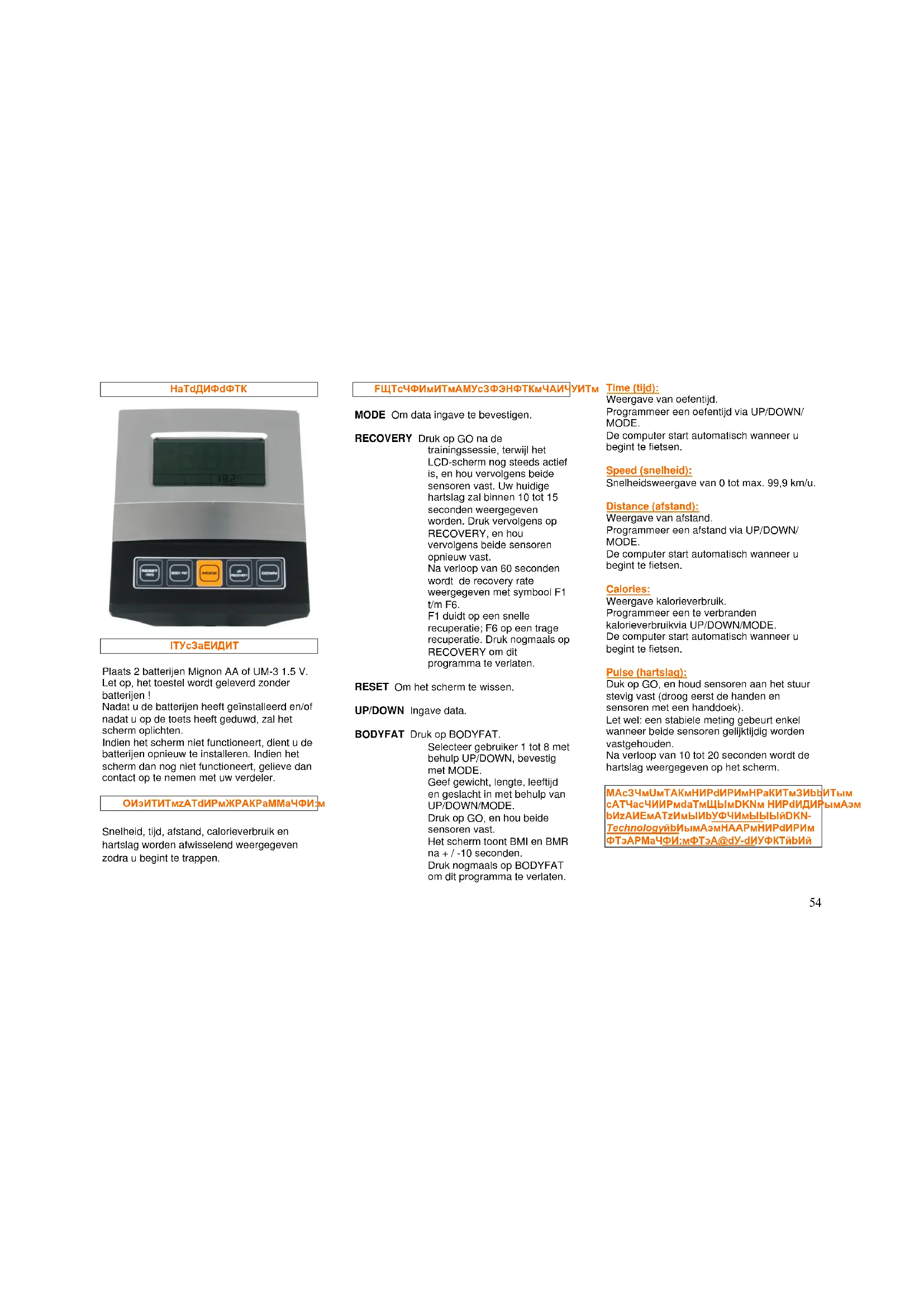 BODYFAT Druk op BODYfat. Selecteer gebruiker 1 tot 8 met behulp UP/DOWN, bevestig met MODE. Geef gewicht, lengte, leeftijd en geslacht in met behulp van UP/DOWN/MODE. Druk op GO, en hou beiden sensoren vast. Het scherm toont BMI en BMR na + / -10 seconden. Druk nogmaals op BODYfat om dit programme te verlaten.