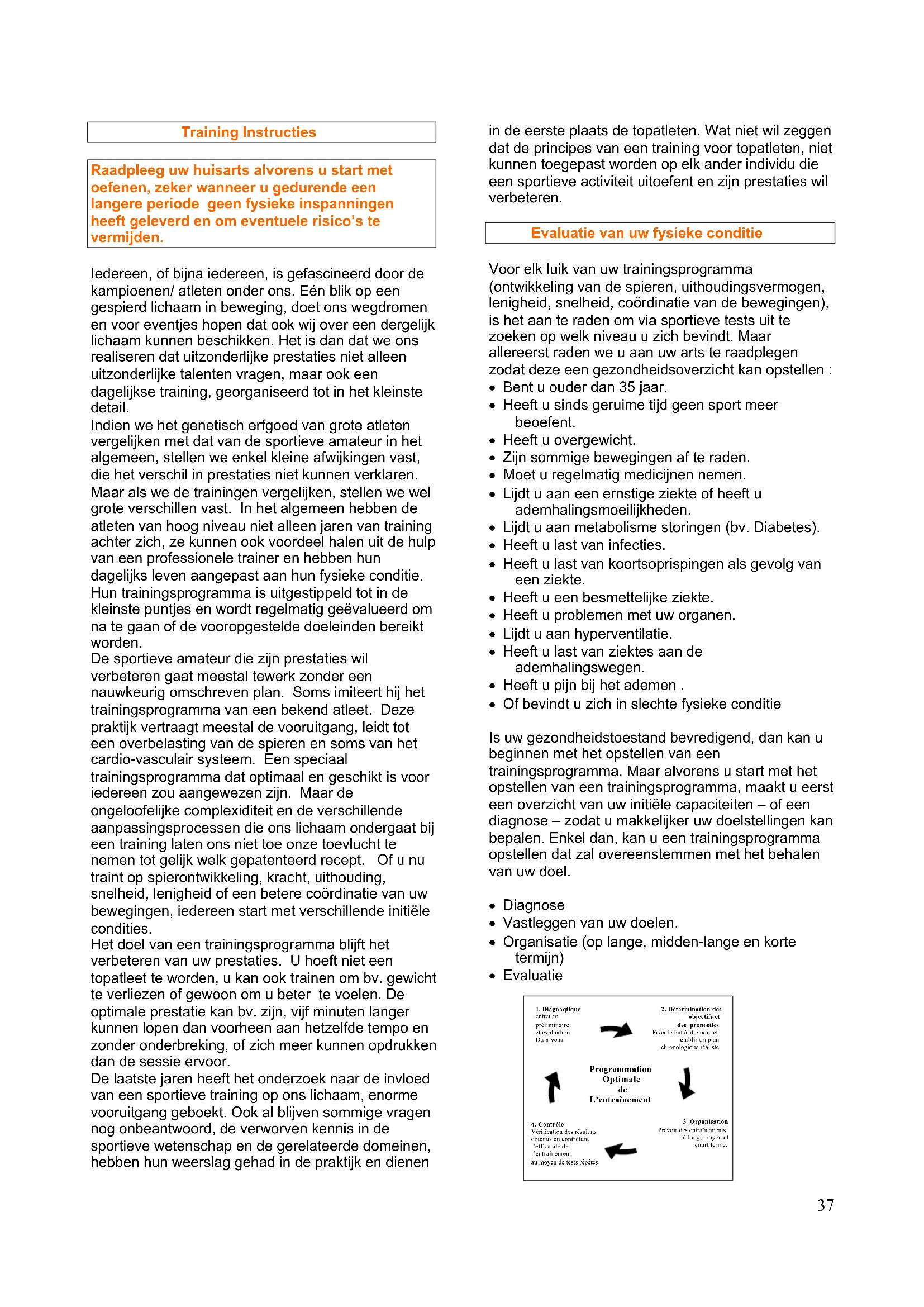 De sportieve amateur die zijn prestaties wil verbeteren gaat meestal tewerk zonder een nauwkeurig omschreven plan. Soms imiteert hij het trainingsprogramma van een bekend atleet. Deze praktijk vertraagt meestal de vooruitgang, leidt tot een overbelasting van de spieren en soms van het cardio-vasculair systeem. Een speciaal trainingsprogramma dat optimaal en geschikt is voor iedereen zou aangewezen zijn. Maar de ongeloofelijke complexiditeit en de verschillende aanpassingsprocessen die ons lichaam ondergaat bij een training laten ons niet toe onze toevlucht te nemen tot gelijk welk gepatenteerd recept. Of u nu traint op spierontwikkeling, kracht, uithouding, snelheid, lenigheid of een betere coördinatie van uw bewegingen, iedereen start met verschillende initiele condities.