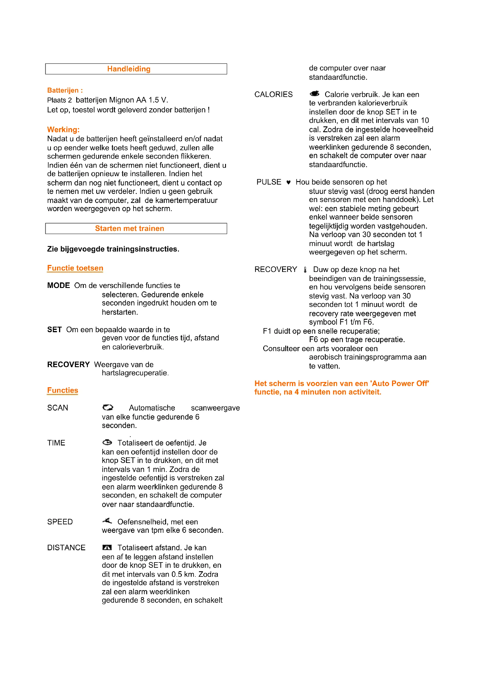 Calorie verbruik. Je kan een te verbranden kalorieverbruik instellen door de knop SET in te drukken, en dit met intervals van 10 cal. Zodra de ingestelde hoeveelheid is verstreten za een alarm werkblinken gedurende 8 seconden, en schakelt de computer overaar standardfundactie.