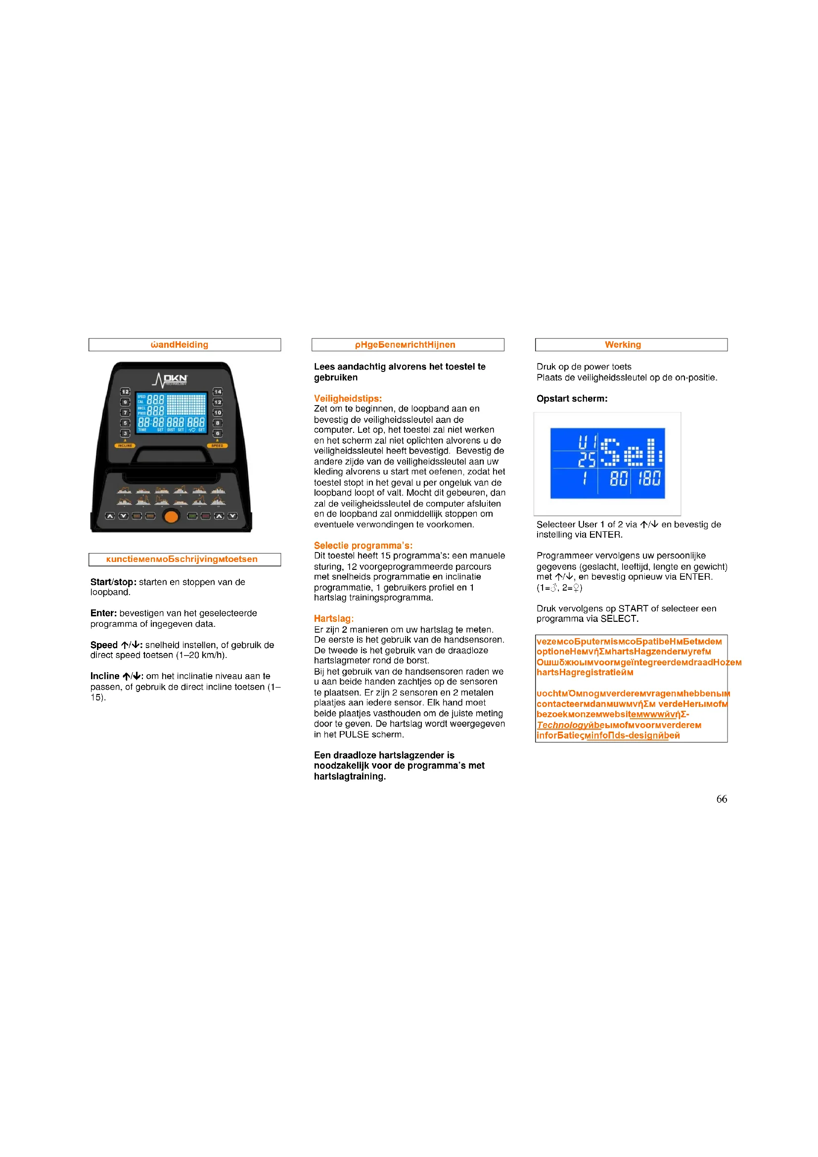 Houd bij het op -en van de loopband stappen altijd de handgrepen vast. Plaats uw voeten eerst op de zijkant van het apparaat (niet op de band) voordat u gaat lopen. Start de loopband en stel deze (voordat u erop staat) in op een lage snelheid. Pas de snelheid langzaam aan zodat u niet onaangenaam verrast wordt door een snel looptempo. Schakel het apparaat altijd uit voordat onderhoud of afstelwerkzaamheden worden verricht. Verwijder het motordeksel ten minste eenmaal per jaar en reinig het binnencompartiment met een stofzuiger. Onderhoudswerkzaamheden die niet in deze handleiding worden beschreven, mogen alleen door erkend onderhoudspersoneel worden uitgevoerd.