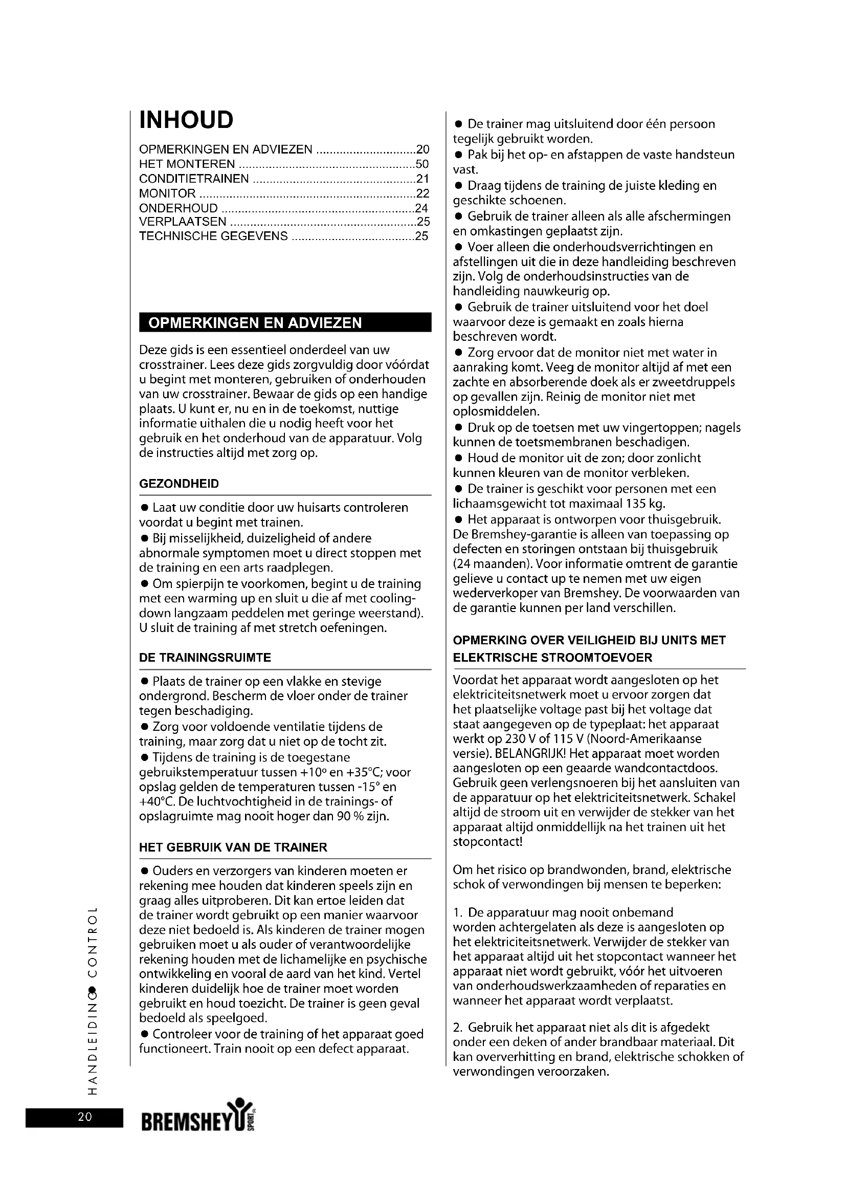 BELANGRIJK! De garantie vervalt bij schade als gevolg van het Niet volgen van de instructies in deze gids betreffende het monteren, het instellen en het onderhonden van de apparatuur. De instructies dienen bij het in elkaar zetten, het onderhoud en het gebruik, zo zorgvuldig möglich te worden gevolgd. Veranderingen of modificaties, welke net door Bremshey Sport zichn goedgekeurd, lately de Bremshey Sport product aansprakelijkheid geheel verrallen.