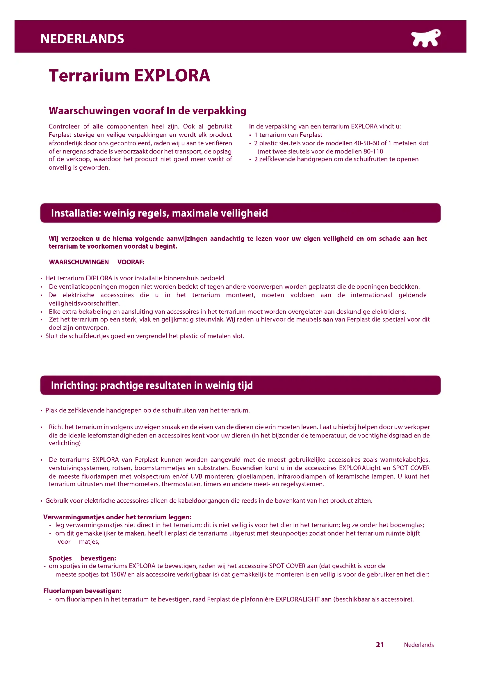EXPLORALIGHT 15 W / T8EXPLORALIGHT 18 W / T8EXPLORALIGHT 30 W / T8EXPLORA 40EXPLORA 50EXPLORA 60EXPLORA 80EXPLORA 80 HEXPLORA 110EXPLORA 110 H21 Nederlands NEDERLANDS Terrarium EXPLORA Controleer of alle componenten heel zijn. Ook al gebruikt Ferplast stevige en veilige verpakkingen en wordt elk product afzonderlijk door ons gecontroleerd, raden wij u aan te verifiëren of er nergens schade is veroorzaakt door het transport, de opslag of de verkoop, waardoor het product niet goed meer werkt of onveilig is geworden. Waarschuwingen vooraf In de verpakking In de verpakking van een terrarium EXPLORA vindt u: