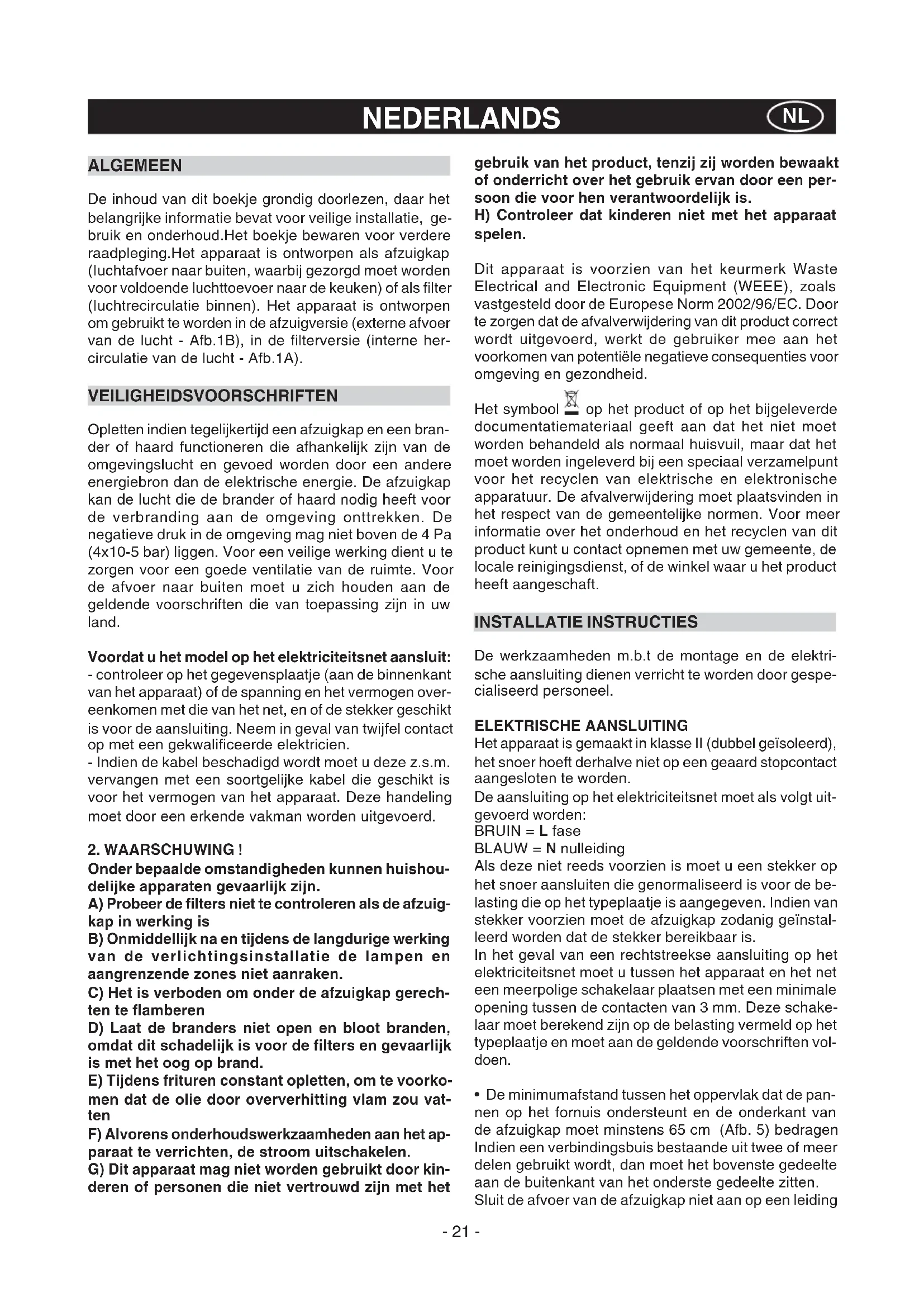 Onder bepaalde omstandigheden kunnen huishou- delijke apparaten gevaarlijk zijn. A) Probeer de filters niet te controleren als de afzuig- kap in werking is B) Onmiddellijk na en tijdens de langdurige werking van de verlichtingsinstallatie de lampen en aangrenzende zones niet aanraken. C) Het is verboden om onder de afzuigkap gerech- ten te flamberen D) Laat de branders niet open en bloot branden, omdat dit schadelijk is voor de filters en gevaarlijk is met het oog op brand. E) Tijdens frituren constant opletten, om te voorko- men dat de olie door oververhitting vlam zou vat- ten F) Alvorens onderhoudswerkzaamheden aan het ap- paraat te verrichten, de stroom uitschakelen. G) Dit apparaat mag niet worden gebruikt door kin- deren of personen die niet vertrouwd zijn met het gebruik van het product, tenzij zij worden bewaakt of onderricht over het gebruik ervan door een per- soon die voor hen verantwoordelijk is. H) Controleer dat kinderen niet met het apparaat spelen. Dit apparaat is voorzien van het keurmerk Waste Electrical and Electronic Equipment (WEEE), zoals vastgesteld door de Europese Norm 2002/96/EC. Door te zorgen dat de afvalverwijdering van dit product correct wordt uitgevoerd, werkt de gebruiker mee aan het voorkomen van potentiële negatieve consequenties voor omgeving en gezondheid. Het symbool op het product of op het bijgeleverde documentatiemateriaal geeft aan dat het niet moet worden behandeld als normaal huisvuil, maar dat het moet worden ingeleverd bij een speciaal verzamelpunt voor het recyclen van elektrische en elektronische apparatuur. De afvalverwijdering moet plaatsvinden in het respect van de gemeentelijke normen. Voor meer informatie over het onderhoud en het recyclen van dit product kunt u contact opnemen met uw gemeente, de locale reinigingsdienst, of de winkel waar u het product heeft aangeschaft. INSTALLATIE INSTRUCTIES De werkzaamheden m.b.t de montage en de elektri- sche aansluiting dienen verricht te worden door gespe- cialiseerd personeel. ELEKTRISCHE AANSLUITING Het apparaat is gemaakt in klasse II (dubbel geïsoleerd), het snoer hoeft derhalve niet op een geaard stopcontact aangesloten te worden. De aansluiting op het elektriciteitsnet moet als volgt uit- gevoerd worden: BRUIN = L fase BLAUW = N nulleiding Als deze niet reeds voorzien is moet u een stekker op het snoer aansluiten die genormaliseerd is voor de be- lasting die op het typeplaatje is aangegeven. Indien van stekker voorzien moet de afzuigkap zodanig geïnstal- leerd worden dat de stekker bereikbaar is. In het geval van een rechtstreekse aansluiting op het elektriciteitsnet moet u tussen het apparaat en het net een meerpolige schakelaar plaatsen met een minimale opening tussen de contacten van 3 mm. Deze schake- laar moet berekend zijn op de belasting vermeld op het typeplaatje en moet aan de geldende voorschriften vol- doen.