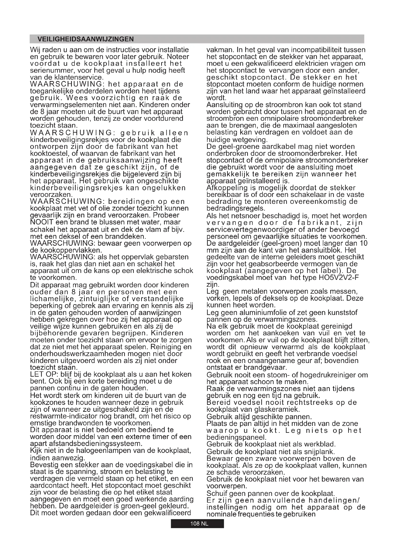 Si se produce este error, desconecte la placa de cocción de la corriente eléctrica y conéctela de nuevo. Si el error persiste, llame al servicio posventa. Si el error se produce de forma repentina durante el funcionamiento normal, llame al servicio posventa. Error de software de control táctil. Espere hasta que la temperatura descienda. La placa de cocción se recuperará automáticamente cuando la temperatura alcance un valor normal. La zona de control táctil está demasiado caliente y se han apagado todas las zonas de cocción. Espere hasta que la temperatura descienda. Si el mensaje no desaparece cuando la temperatura coincida con la temperatura ambiente, llame al servicio posventa. Espere hasta que la temperatura descienda. Si el mensaje no desaparece cuando la temperatura coincida con la temperatura ambiente, llame al servicio posventa. El sensor de temperatura de control táctil puede estar dañado. Compruebe si la placa de cocción está montada correctamente. Asegúrese de que la superficie de cristal permite una pulsación correcta de las teclas. Sensibilidad excesiva en cualquier tecla. Este error es una comprobación automática por teclado. Desaparece cuando se obtiene un valor seguro al final de la comprobación. Si el error persiste, llave al servicio posventa. Error de seguridad de teclado. Este error es una comprobación automática de software. Desaparece cuando se obtiene un valor seguro al final de la comprobación. Si el error persiste, llave al servicio posventa. Error de seguridad de teclado. Este error es una comprobación automática de software. Desaparece cuando se obtiene un valor seguro al final de la comprobación. Si el error persiste, llave al servicio posventa. Error de seguridad de teclado. El relé puede tener algún problema. Desconecte la placa de cocción de la alimentación, espere un minuto y vuelva a encenderla. Si el error persiste, llave al servicio posventa. Error de seguridad de relés. Fallo Acción Indicación El sensor de temperatura de control táctil puede estar dañado. 107 ESWij raden u aan om de instructies voor installatie en gebruik te bewaren voor later gebruik. Noteer voordat u de kookplaat installeert het serienummer, voor het geval u hulp nodig heeft van de klantenservice. WAARSCHUWING: het apparaat en de toegankelijke onderdelen worden heet tijdens gebruik. Wees voorzichtig en raak de verwarmingselementen niet aan. Kinderen onder de 8 jaar moeten uit de buurt van het apparaat worden gehouden, tenzij ze onder voortdurend toezicht staan. WAARSCHUWING: gebruik alleen kinderbeveiligingsrekjes voor de kookplaat die ontworpen zijn door de fabrikant van het kooktoestel, of waarvan de fabrikant van het apparaat in de gebruiksaanwijzing heeft aangegeven dat ze geschikt zijn, of de kinderbeveiligingsrekjes die bijgeleverd zijn bij het apparaat. Het gebruik van ongeschikte kinderbeveiligingsrekjes kan ongelukken veroorzaken. WAARSCHUWING: bereidingen op een kookplaat met vet of olie zonder toezicht kunnen gevaarlijk zijn en brand veroorzaken. Probeer NOOIT een brand te blussen met water, maar schakel het apparaat uit en dek de vlam af bijv. met een deksel of een branddeken. WAARSCHUWING: bewaar geen voorwerpen op de kookoppervlakken. WAARSCHUWING: als het oppervlak gebarsten is, raak het glas dan niet aan en schakel het apparaat uit om de kans op een elektrische schok te voorkomen. Dit apparaat mag gebruikt worden door kinderen ouder dan 8 jaar en personen met een lichamelijke, zintuiglijke of verstandelijke beperking of gebrek aan ervaring en kennis als zij in de gaten gehouden worden of aanwijzingen hebben gekregen over hoe zij het apparaat op veilige wijze kunnen gebruiken en als zij de bijbehorende gevaren begrijpen. Kinderen moeten onder toezicht staan om ervoor te zorgen dat ze niet met het apparaat spelen. Reiniging en onderhoudswerkzaamheden mogen niet door kinderen uitgevoerd worden als zij niet onder toezicht staan. LET OP: blijf bij de kookplaat als u aan het koken bent. Ook bij een korte bereiding moet u de pannen continu in de gaten houden. Het wordt sterk om kinderen uit de buurt van de kookzones te houden wanneer deze in gebruik zijn of wanneer ze uitgeschakeld zijn en de restwarmte-indicator nog brandt, om het risico op ernstige brandwonden te voorkomen. Dit apparaat is niet bedoeld om bediend te worden door middel van een externe timer of een apart afstandsbedieningssysteem. Kijk niet in de halogeenlampen van de kookplaat, indien aanwezig. Bevestig een stekker aan de voedingskabel die in staat is de spanning, stroom en belasting te verdragen die vermeld staan op het etiket, en een aardcontact heeft. Het stopcontact moet geschikt zijn voor de belasting die op het etiket staat aangegeven en moet een goed werkende aarding hebben. De aardgeleider is groen-geel gekleurd. Dit moet worden gedaan door een gekwalificeerd VEILIGHEIDSAANWIJZINGEN 108 NL vakman. In het geval van incompatibiliteit tussen het stopcontact en de stekker van het apparaat, moet u een gekwalificeerd elektricien vragen om het stopcontact te vervangen door een ander, geschikt stopcontact. De stekker en het stopcontact moeten conform de huidige normen zijn van het land waar het apparaat geïnstalleerd wordt. Aansluiting op de stroombron kan ook tot stand worden gebracht door tussen het apparaat en de stroombron een omnipolaire stroomonderbreker aan te brengen, die de maximaal aangesloten belasting kan verdragen en voldoet aan de huidige wetgeving. De geel-groene aardkabel mag niet worden onderbroken door de stroomonderbreker. Het stopcontact of de omnipolaire stroomonderbreker die gebruikt wordt voor de aansluiting moet gemakkelijk te bereiken zijn wanneer het apparaat geïnstalleerd is. Afkoppeling is mogelijk doordat de stekker bereikbaar is of door een schakelaar in de vaste bedrading te monteren overeenkomstig de bedradingsregels. Als het netsnoer beschadigd is, moet het worden vervangen door de fabrikant, zijn servicevertegenwoordiger of ander bevoegd 