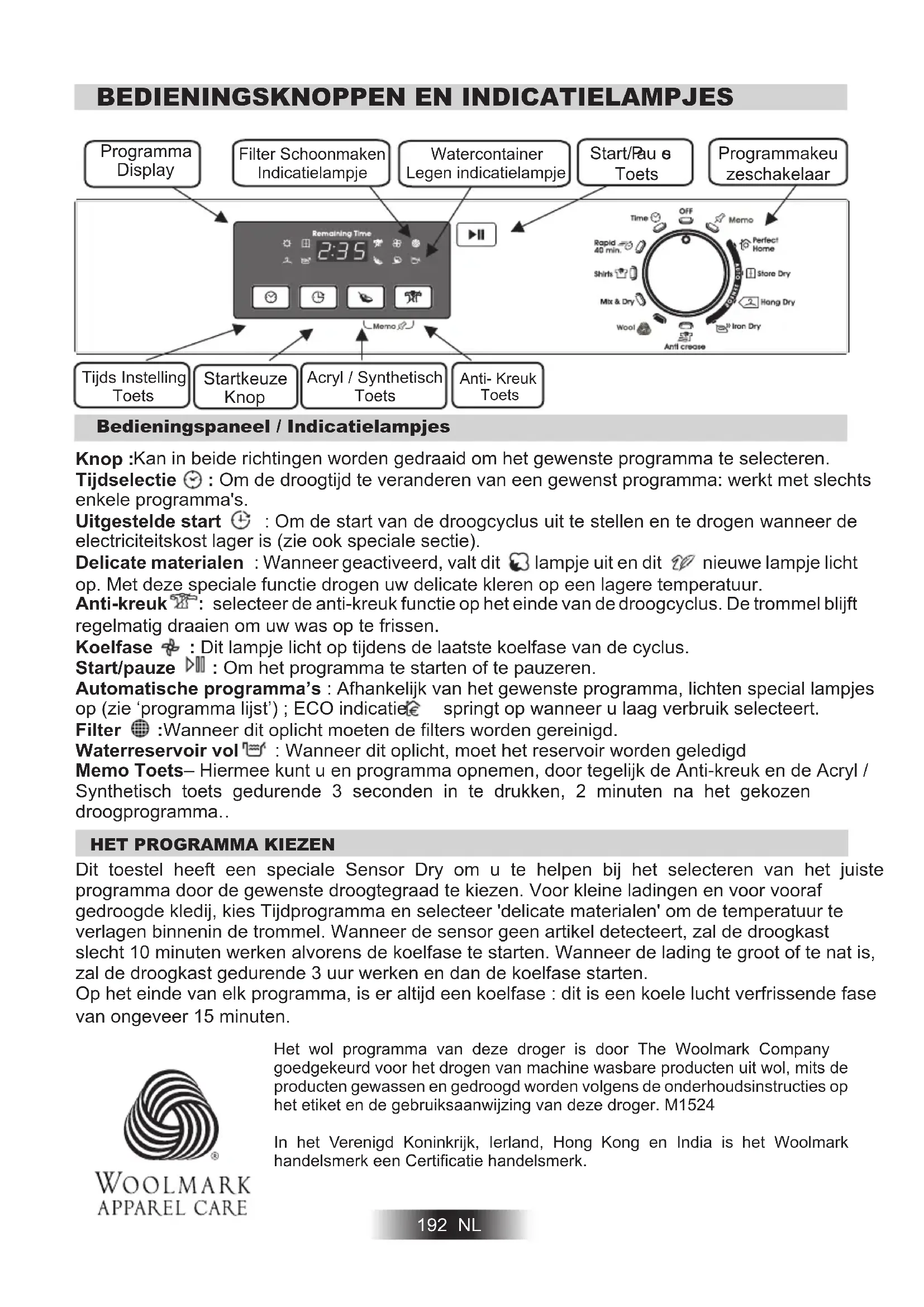 Kan in beide richtingen worden gedraaid om het gewenste programma te selecteren. Memo Toets– Hiermee kunt u en programma opnemen, door tegelijk de Anti-kreuk en de Acryl / Synthetisch toets gedurende 3 seconden in te drukken, 2 minuten na het gekozen droogprogramma. Watercontainer Legen indicatielampje Filter Schoonmaken Indicatielampje Tijds Instelling Toets Start/ au e Toets P s Programma Display Startkeuze Knop Programmakeu zeschakelaar Acryl / Synthetisch Toets Anti- Kreuk Toets 192 NL Het wol programma van deze droger is door The Woolmark Company goedgekeurd voor het drogen van machine wasbare producten uit wol, mits de producten gewassen en gedroogd worden volgens de onderhoudsinstructies op het etiket en de gebruiksaanwijzing van deze droger. M1524 In het Verenigd Koninkrijk, Ierland, Hong Kong en India is het Woolmark handelsmerk een Certificatie handelsmerk.