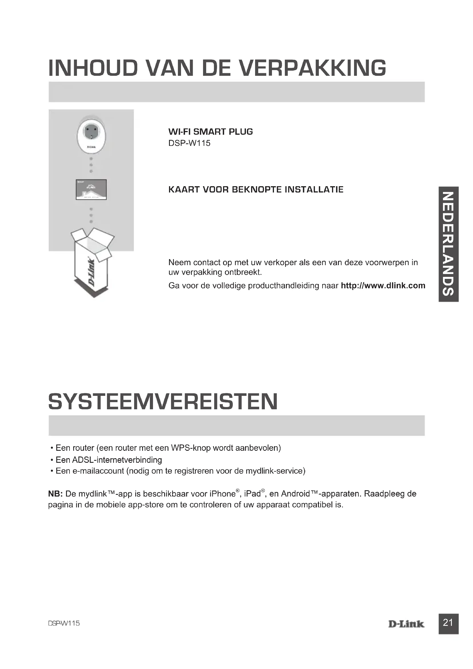 , en Android™-apparaten. Raadpleeg de pagina in de mobiele app-store om te controleren of uw apparaat compatibel is. Neem contact op met uw verkoper als een van deze voorwerpen in uw verpakking ontbreekt. Ga voor de volledige producthandleiding naar http://www.dlink.com