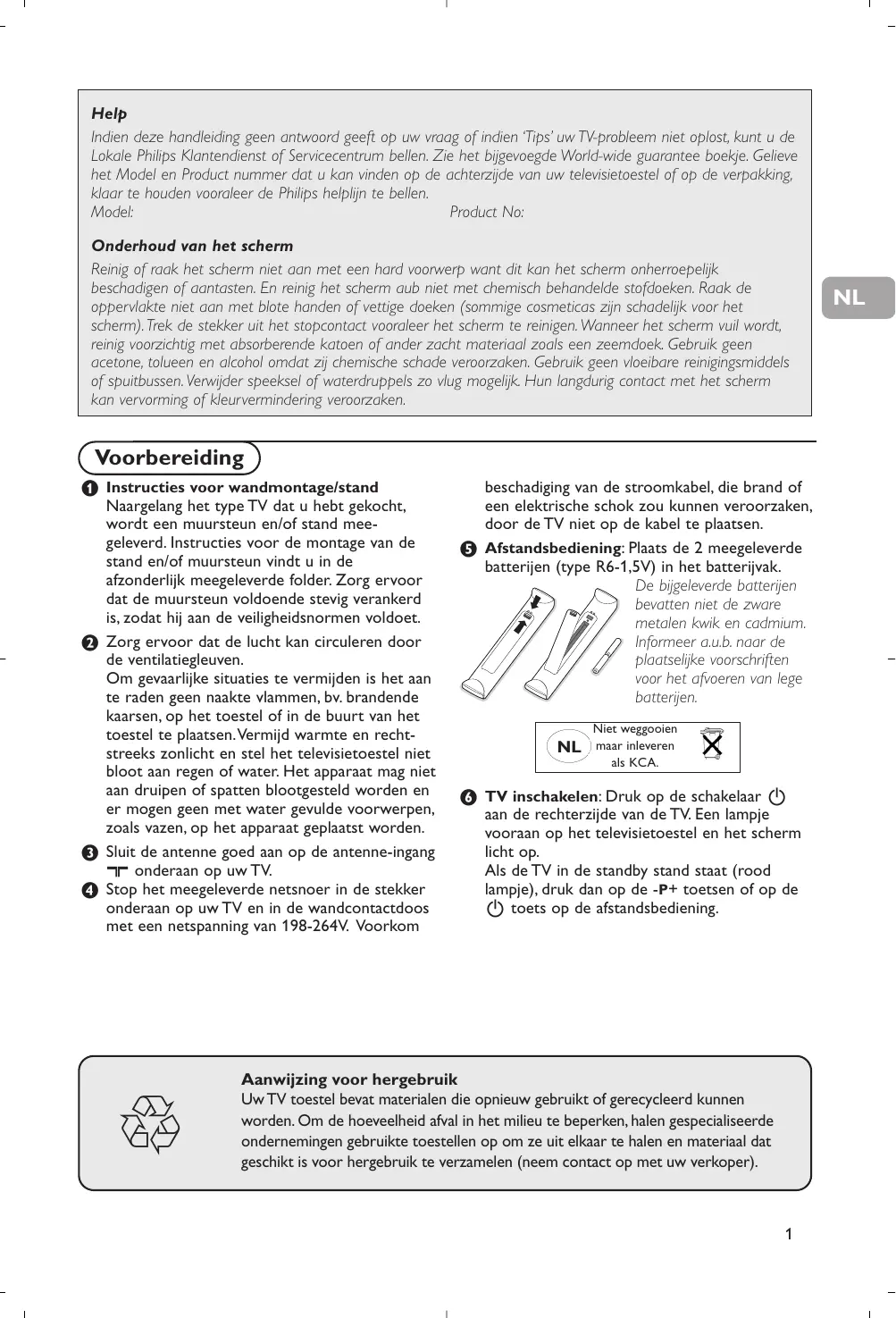 Help Indien deze handleiding geen antwoord geeft op uw vraag of indien ‘Tips’ uw TV-probleem niet oplost, kunt u de Lokale Philips Klantendienst of Servicecentrum bellen. Zie het bijgevoegde World-wide guarantee boekje. Gelieve het Model en Product nummer dat u kan vinden op de achterzijde van uw televisietoestel of op de verpakking, klaar te houden vooraleer de Philips helplijn te bellen. Model: Product No: Onderhoud van het scherm Reinig of raak het scherm niet aan met een hard voorwerp want dit kan het scherm onherroepelijk beschadigen of aantasten. En reinig het scherm aub niet met chemisch behandelde stofdoeken. Raak de oppervlakte niet aan met blote handen of vettige doeken (sommige cosmeticas zijn schadelijk voor het scherm). Trek de stekker uit het stopcontact vooraleer het scherm te reinigen. Wanneer het scherm vuil wordt, reinig voorzichtig met absorberende katoen of ander zacht materiaal zoals een zeemdoek. Gebruik geen acetone, tolueen en alcohol omdat zij chemische schade veroorzaken. Gebruik geen vloeibare reinigingsmiddels of spuitbussen. Verwijder speeksel of waterdruppels zo vlug mogelijk. Hun langdurig contact met het scherm kan vervorming of kleurvermindering veroorzaken. Voorbereiding & Instructies voor wandmontage/stand Naargelang het type TV dat u hebt gekocht, wordt een muursteun en/of stand meegeleverd. Instructies voor de montage van de stand en/of muursteun vindt u in de afzonderlijk meegeleverde folder. Zorg ervoor dat de muursteun voldoende stevig verankerd is, zodat hij aan de veiligheidsnormen voldoet. é Zorg ervoor dat de lucht kan circuleren door de ventilatiegleuven. Om gevaarlijke situaties te vermijden is het aan te raden geen naakte vlammen, bv. brandende kaarsen, op het toestel of in de buurt van het toestel te plaatsen.Vermijd warmte en rechtstreeks zonlicht en stel het televisietoestel niet bloot aan regen of water. Het apparaat mag niet aan druipen of spatten blootgesteld worden en er mogen geen met water gevulde voorwerpen, zoals vazen, op het apparaat geplaatst worden. “ Sluit de antenne goed aan op de antenne-ingang x onderaan op uw TV. ‘ Stop het meegeleverde netsnoer in de stekker onderaan op uw TV en in de wandcontactdoos met een netspanning van 198-264V. Voorkom