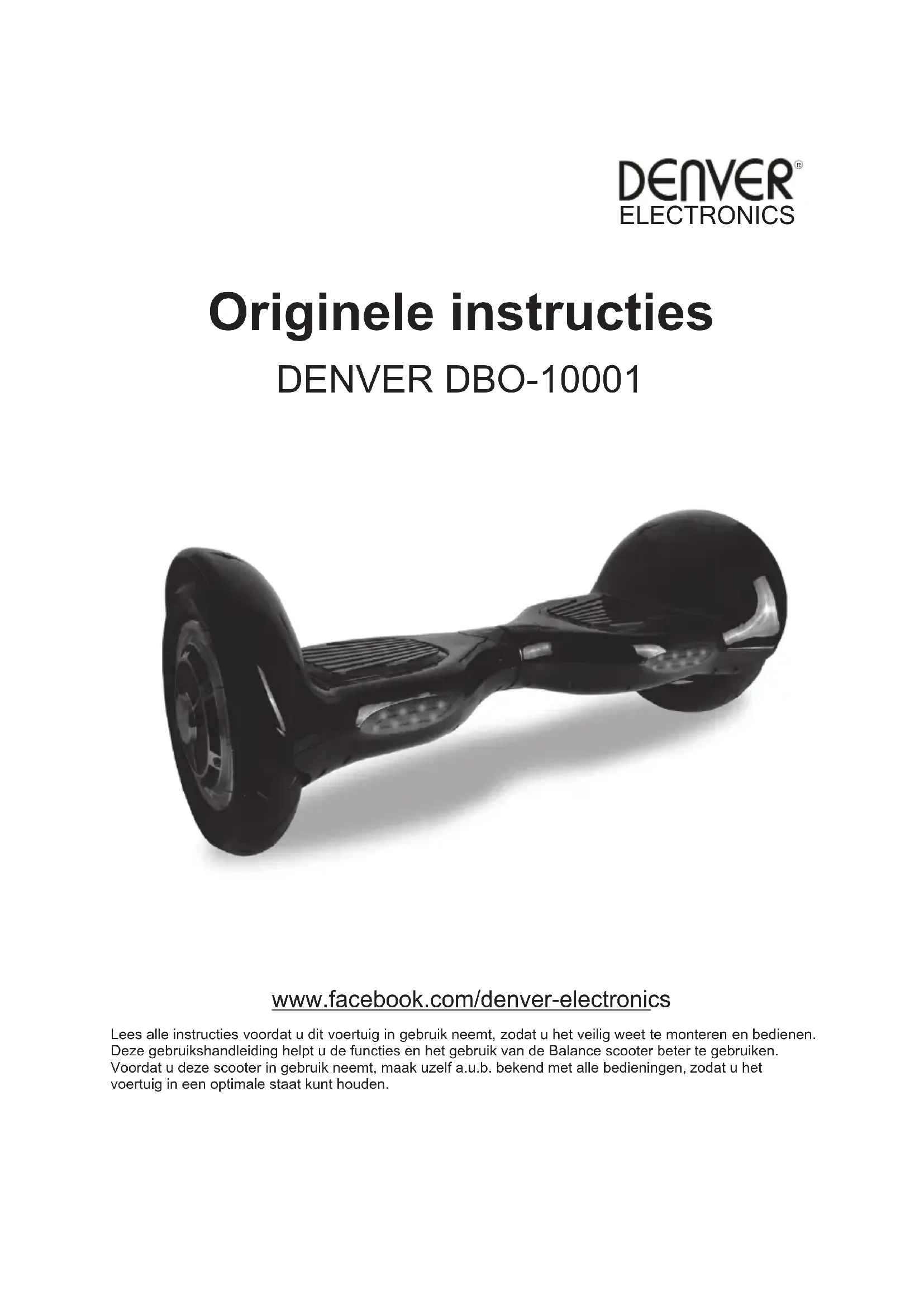 Danimarca Omega 5A, Soeften, DK-8382 Hinnerup, ITA 8Originele instructies DENVER DBO-10001 www.facebook.com/denver-electronics Lees alle instructies voordat u dit voertuig in gebruik neemt, zodat u het veilig weet te monteren en bedienen. Deze gebruikshandleiding helpt u de functies en het gebruik van de Balance scooter beter te gebruiken. Voordat u deze scooter in gebruik neemt, maak uzelf a.u.b. bekend met alle bedieningen, zodat u het voertuig in een optimale staat kunt houden.