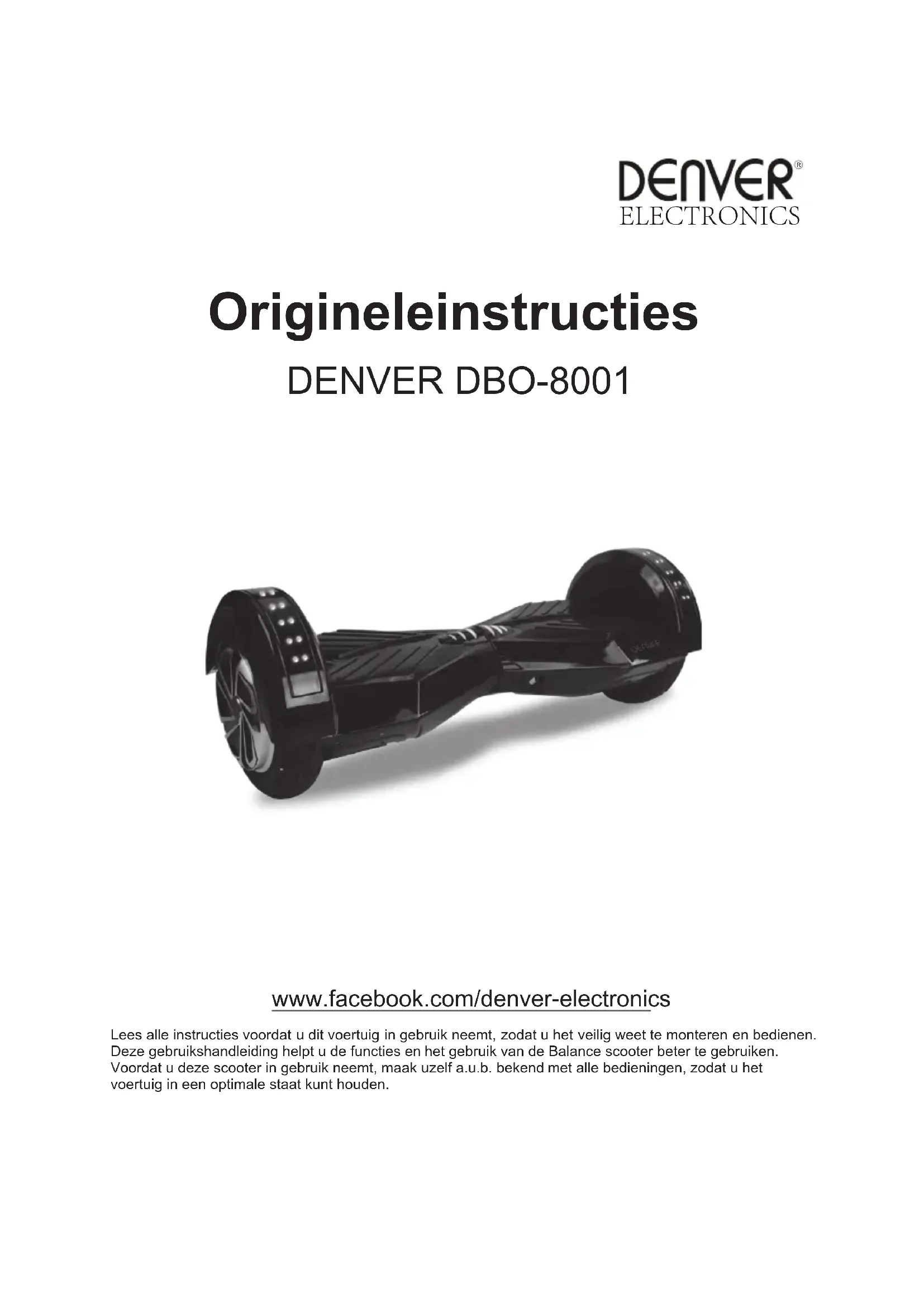 www.facebook.com/denverelectronics Danimarca Omega 5A, Soeften, DK-8382 Hinnerup, ITA 8Originele instructies DENVER DBO-8001 www.facebook.com/denver-electronics Lees alle instructies voordat u dit voertuig in gebruik neemt, zodat u het veilig weet te monteren en bedienen. Deze gebruikshandleiding helpt u de functies en het gebruik van de Balance scooter beter te gebruiken. Voordat u deze scooter in gebruik neemt, maak uzelf a.u.b. bekend met alle bedieningen, zodat u het voertuig in een optimale staat kunt houden.