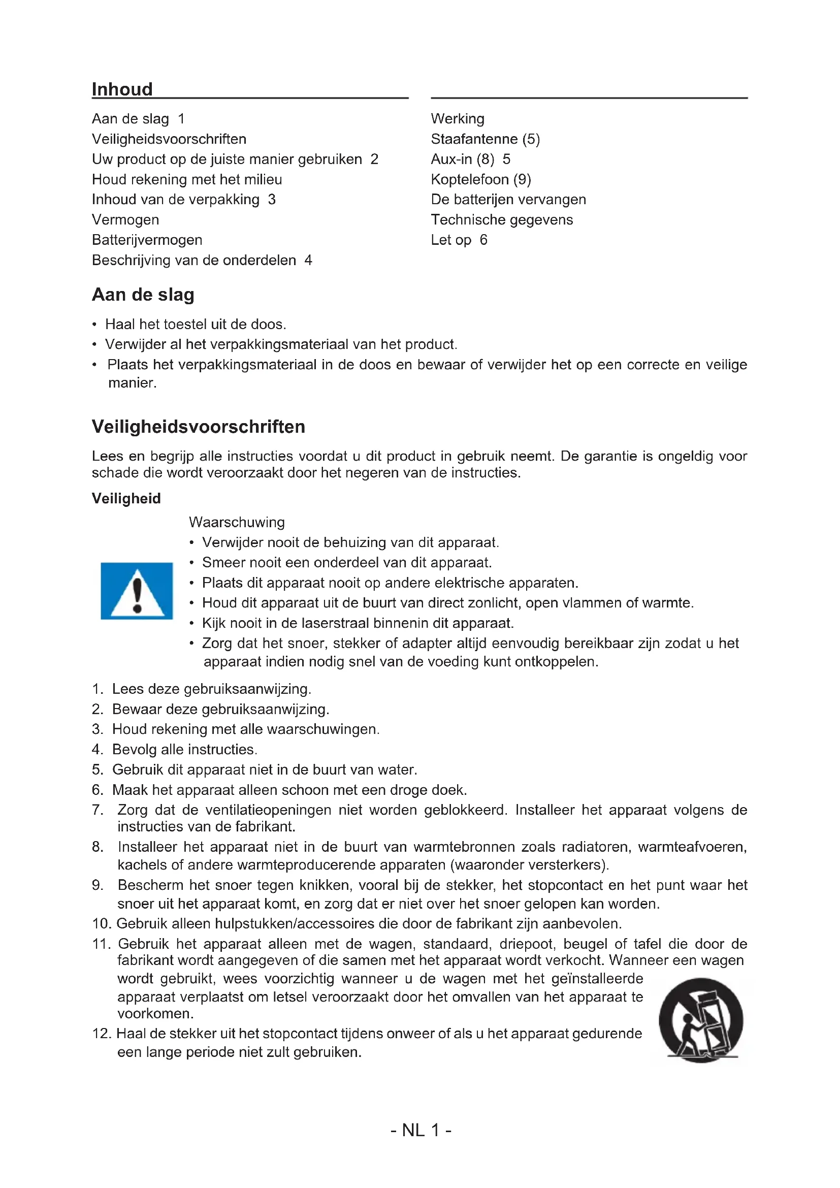 ALVORENS DEZE EENHEID TE BEDIENEN, EN BEWAAR DIT BOEKJE VOOR UW ADMINISTRATIE. NL- NL 1 - Inhoud Aan de slag 1 Veiligheidsvoorschriften Uw product op de juiste manier gebruiken 2 Houd rekening met het milieu Inhoud van de verpakking 3 Vermogen Batterijvermogen Beschrijving van de onderdelen 4 Werking Staafantenne (5) Aux-in (8) 5 Koptelefoon (9) De batterijen vervangen Technische gegevens Let op 6 Aan de slag