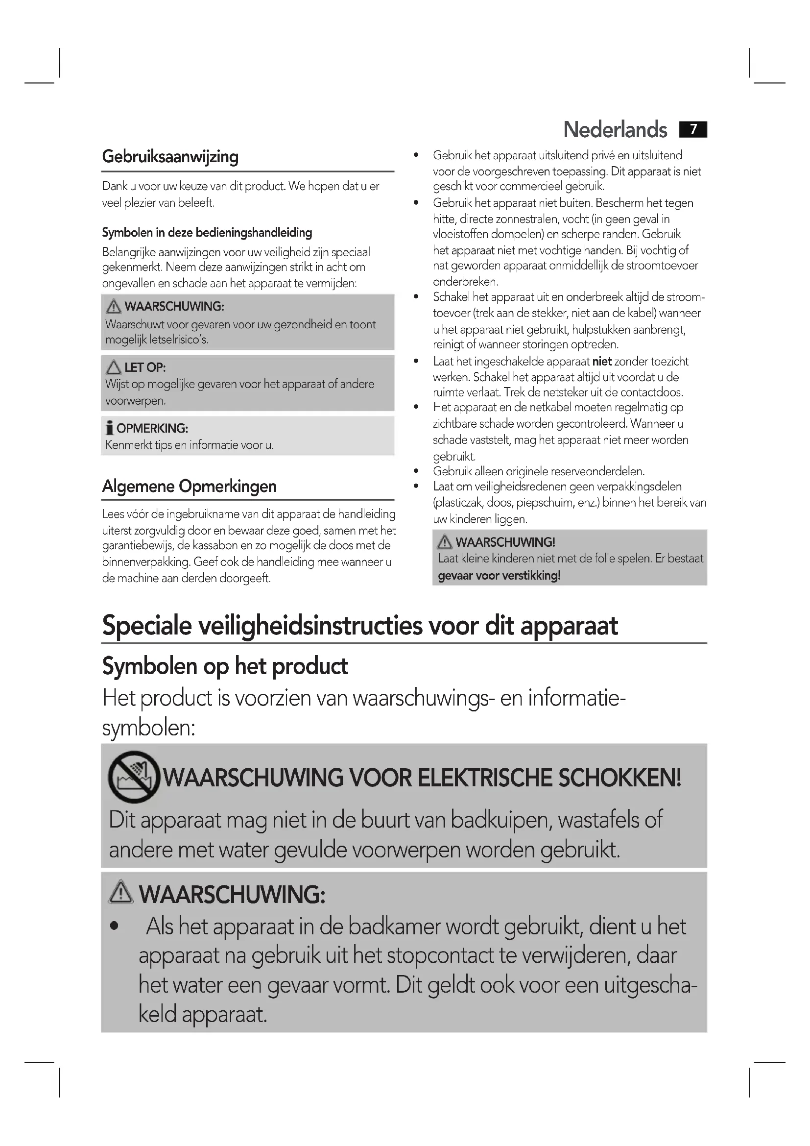 Gebruiksaanwijzing Dank u voor uw keuze van dit product. We hopen dat u er veel plezier van beleeft.Symbolen in deze bedieningshandleidingBelangrijke aanwijzingen voor uw veiligheid zijn speciaal gekenmerkt. Neem deze aanwijzingen strikt in acht om ongevallen en schade aan het apparaat te vermijden: WAARSCHUWING: Waarschuwt voor gevaren voor uw gezondheid en toont mogelijk letselrisico’s. LET OP: Wijst op mogelijke gevaren voor het apparaat of andere voorwerpen. OPMERKING: Kenmerkt tips en informatie voor u. Algemene Opmerkingen Lees vóór de ingebruikname van dit apparaat de handleiding uiterst zorgvuldig door en bewaar deze goed, samen met het garantiebewijs, de kassabon en zo mogelijk de doos met de binnenverpakking. Geef ook de handleiding mee wanneer u de machine aan derden doorgeeft.• Gebruikhetapparaatuitsluitendprivéenuitsluitendvoor de voorgeschreven toepassing. Dit apparaat is niet geschikt voor commercieel gebruik.• Gebruikhetapparaatnietbuiten.Beschermhettegenhitte, directe zonnestralen, vocht (in geen geval in vloeistoffen dompelen) en scherpe randen. Gebruik het apparaat niet met vochtige handen. Bij vochtig of nat geworden apparaat onmiddellijk de stroomtoevoer onderbreken.• Schakelhetapparaatuitenonderbreekaltddestroom-toevoer (trek aan de stekker, niet aan de kabel) wanneer u het apparaat niet gebruikt, hulpstukken aanbrengt, reinigt of wanneer storingen optreden.• Laathetingeschakeldeapparaatniet zonder toezicht werken. Schakel het apparaat altijd uit voordat u de ruimte verlaat. Trek de netsteker uit de contactdoos.• Hetapparaatendenetkabelmoetenregelmatigopzichtbare schade worden gecontroleerd. Wanneer u schade vaststelt, mag het apparaat niet meer worden gebruikt.• Gebruikalleenoriginelereserveonderdelen.• Laatomveiligheidsredenengeenverpakkingsdelen(plasticzak, doos, piepschuim, enz.) binnen het bereik van uw kinderen liggen. WAARSCHUWING! Laat kleine kinderen niet met de folie spelen. Er bestaat gevaar voor verstikking! Speciale veiligheidsinstructies voor dit apparaat Symbolen op het product Het product is voorzien van waarschuwings- en informatie- symbolen: WAARSCHUWING VOOR ELEKTRISCHE SCHOKKEN! Dit apparaat mag niet in de buurt van badkuipen, wastafels of andere met water gevulde voorwerpen worden gebruikt. WAARSCHUWING: