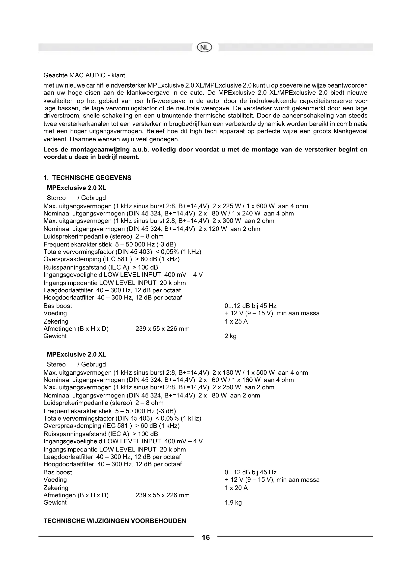 MPExclusive 2.0 XL Stereo / Gebrugd Max. uitgangsvermogen (1 kHz sinus burst 2:8, B+=14,4V) 2 x 225 W / 1 x 600 W aan 4 ohm Nominaal uitgangsvermogen (DIN 45 324, B+=14,4V) 2 x 80 W / 1 x 240 W aan 4 ohm Max. uitgangsvermogen (1 kHz sinus burst 2:8, B+=14,4V) 2 x 300 W aan 2 ohm Nominaal uitgangsvermogen (DIN 45 324, B+=14,4V) 2 x 120 W aan 2 ohm Luidsprekerimpedantie (stereo) 2 – 8 ohm Frequentiekarakteristiek 5 – 50 000 Hz (-3 dB) Totale vervormingsfactor (DIN 45 403) < 0,05% (1 kHz) Overspraakdemping (IEC 581 ) > 60 dB (1 kHz) Ruisspanningsafstand (IEC A) > 100 dB Ingangsgevoeligheid LOW LEVEL INPUT 400 mV – 4 V Ingangsimpedantie LOW LEVEL INPUT 20 k ohm Laagdoorlaatfilter 40 – 300 Hz, 12 dB per octaaf Hoogdoorlaatfilter 40 – 300 Hz, 12 dB per octaaf Bas boost 0...12 dB bij 45 Hz Voeding + 12 V (9 – 15 V), min aan massa Zekering 1 x 25 A Afmetingen (B x H x D) 239 x 55 x 226 mm Gewicht 2 kg MPExclusive 2.0 XL Stereo / Gebrugd Max. uitgangsvermogen (1 kHz sinus burst 2:8, B+=14,4V) 2 x 180 W / 1 x 500 W aan 4 ohm Nominaal uitgangsvermogen (DIN 45 324, B+=14,4V) 2 x 60 W / 1 x 160 W aan 4 ohm Max. uitgangsvermogen (1 kHz sinus burst 2:8, B+=14,4V) 2 x 250 W aan 2 ohm Nominaal uitgangsvermogen (DIN 45 324, B+=14,4V) 2 x 80 W aan 2 ohm Luidsprekerimpedantie (stereo) 2 – 8 ohm Frequentiekarakteristiek 5 – 50 000 Hz (-3 dB) Totale vervormingsfactor (DIN 45 403) < 0,05% (1 kHz) Overspraakdemping (IEC 581 ) > 60 dB (1 kHz) Ruisspanningsafstand (IEC A) > 100 dB Ingangsgevoeligheid LOW LEVEL INPUT 400 mV – 4 V Ingangsimpedantie LOW LEVEL INPUT 20 k ohm Laagdoorlaatfilter 40 – 300 Hz, 12 dB per octaaf Hoogdoorlaatfilter 40 – 300 Hz, 12 dB per octaaf Bas boost 0...12 dB bij 45 Hz Voeding + 12 V (9 – 15 V), min aan massa Zekering 1 x 20 A Afmetingen (B x H x D) 239 x 55 x 226 mm Gewicht 1,9 kg