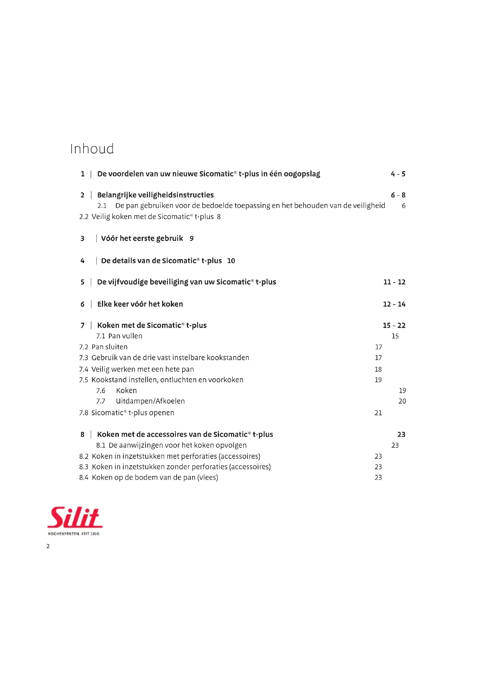 3 | Vóór het eerste gebruik 9 4 | De details van de Sicomatic® t-plus 10 5 | De vijfvoudige beveiliging van uw Sicomatic® t-plus 11 - 12 6 | Elke keer vóór het koken 12 - 14 7 | Koken met de Sicomatic® t-plus 15 - 22