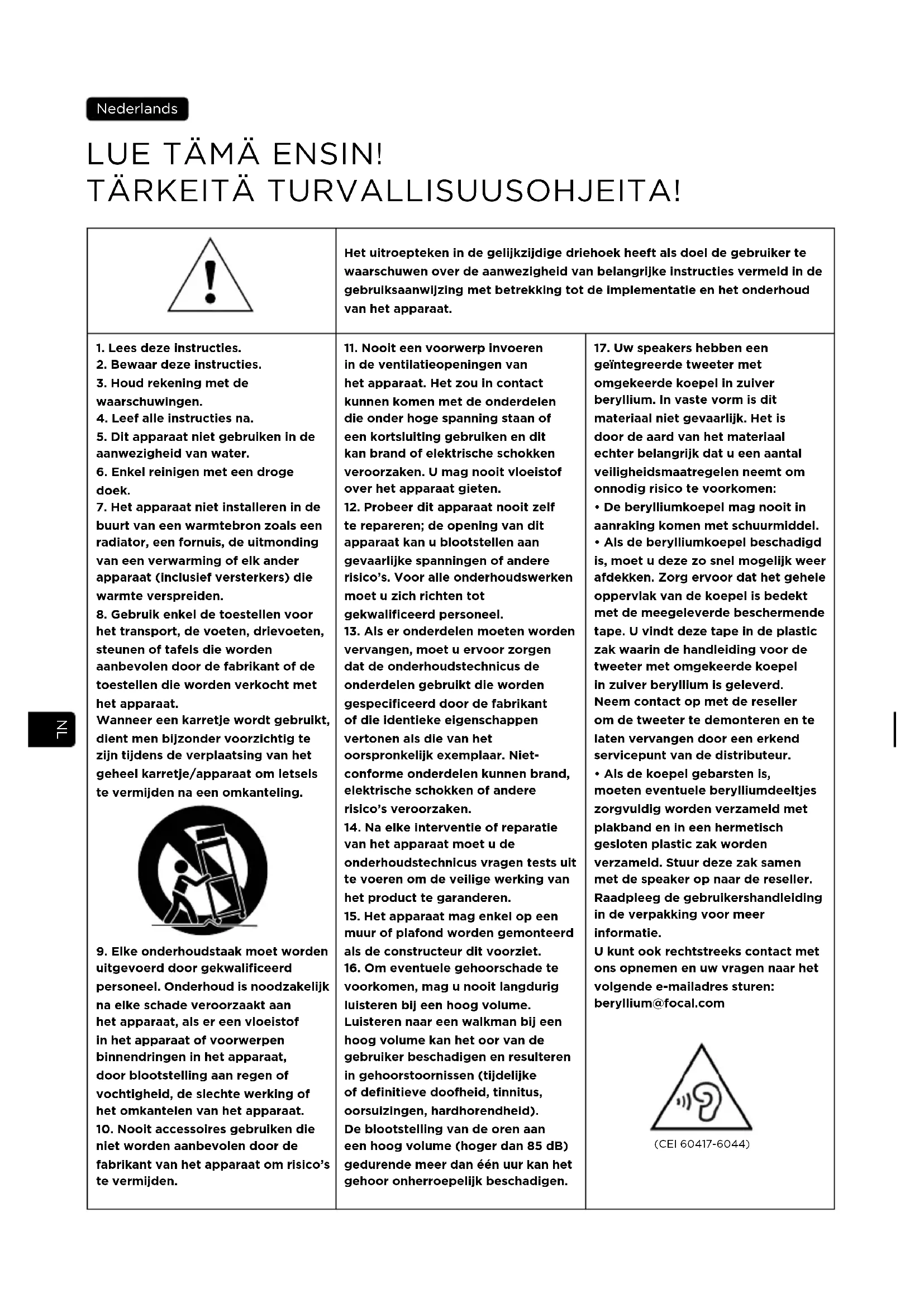 - Als de koepel gebarsten is, moeten eventuele berylliumdeeltjes zorgvuldig worden verzameld met plakband en in een hermetisch gesloten plastic zak worden verzameld. Stuur deze zak samen met de speaker op naar de reseller. Raadpleeg de gebruikershandleiding in de verpakking voor meer informatie. U kunt ook rechtstreeks contact met ons opnemen en uw vragen naar het volgende e-mailadres sturen: beryllium@focal.com (CEI 60417-6044)39 SOPRA