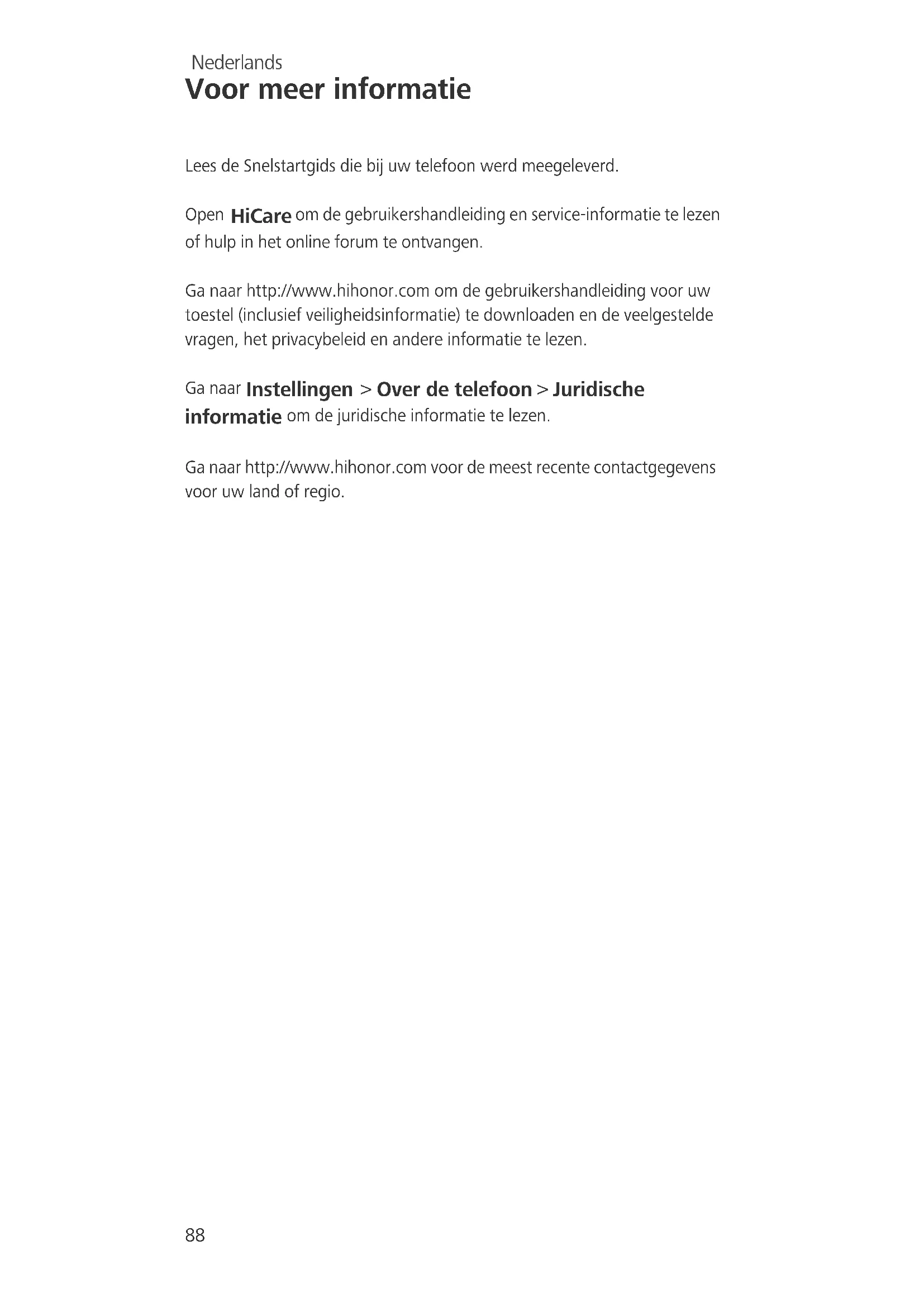 DE MAXIMALE AANSPRAKELIJKHEID (DEZE BEPERKING IS NIET VAN TOEPASSING OP DE AANSPRAKELIJKHEID VOOR PERSOONLIJK LETSEL TOT DE MATE WAARIN DE WET EEN DERGELIJKE BEPERKING VERBIEDT) VAN HUAWEI DIE VOORTVLOEIT UIT HET GEBRUIK VAN HET PRODUCT, ZOALS BESCHREVEN IN DEZE HANDLEIDNG ZAL WORDEN BEPERKT TOT DE HOOGTE VAN HET DOOR DE KLANTEN BETAALDE BEDRAG VOOR DE AANSCHAF VAN DIT PRODUCT. Import- en exportregelgeving Klanten moeten alle toepasselijke export- en importwetten en -regelgeving naleven en zijn verantwoordelijk voor het verkrijgen van alle noodzakelijke overheidsvergunningen en licenties om het product dat vermeld wordt in deze handleiding, inclusief de software en de technische gegevens, te exporteren, te herexporteren of te importeren. Privacybeleid Om meer inzicht te krijgen in de manier waarop wij uw persoonlijke gegevens beschermen, raadpleegt u ons privacybeleid via http://www.hihonor.com. Alle afbeeldingen en illustraties in deze handleiding, met inbegrip maar niet beperkt tot de telefoonkleur, afmetingen en weergegeven inhoud, zijn alleen ter referentie. Het product kan er in werkelijkheid anders uitzien. Niets in deze handleiding houdt enige vorm van garantie in, expliciet of impliciet.For DTS patents, see http://patents.dts.com. Manufactured under license from DTS Licensing Limited. DTS, the Symbol, & DTS and the Symbol together are registered trademarks, and DTS Sound is a trademark of DTS, Inc. © DTS, Inc. All Rights Reserved. Model:PLK-L01 31010UXJ_02 Please visit http://www.hihonor.com for recent updated hotline and email address in your country or region.
