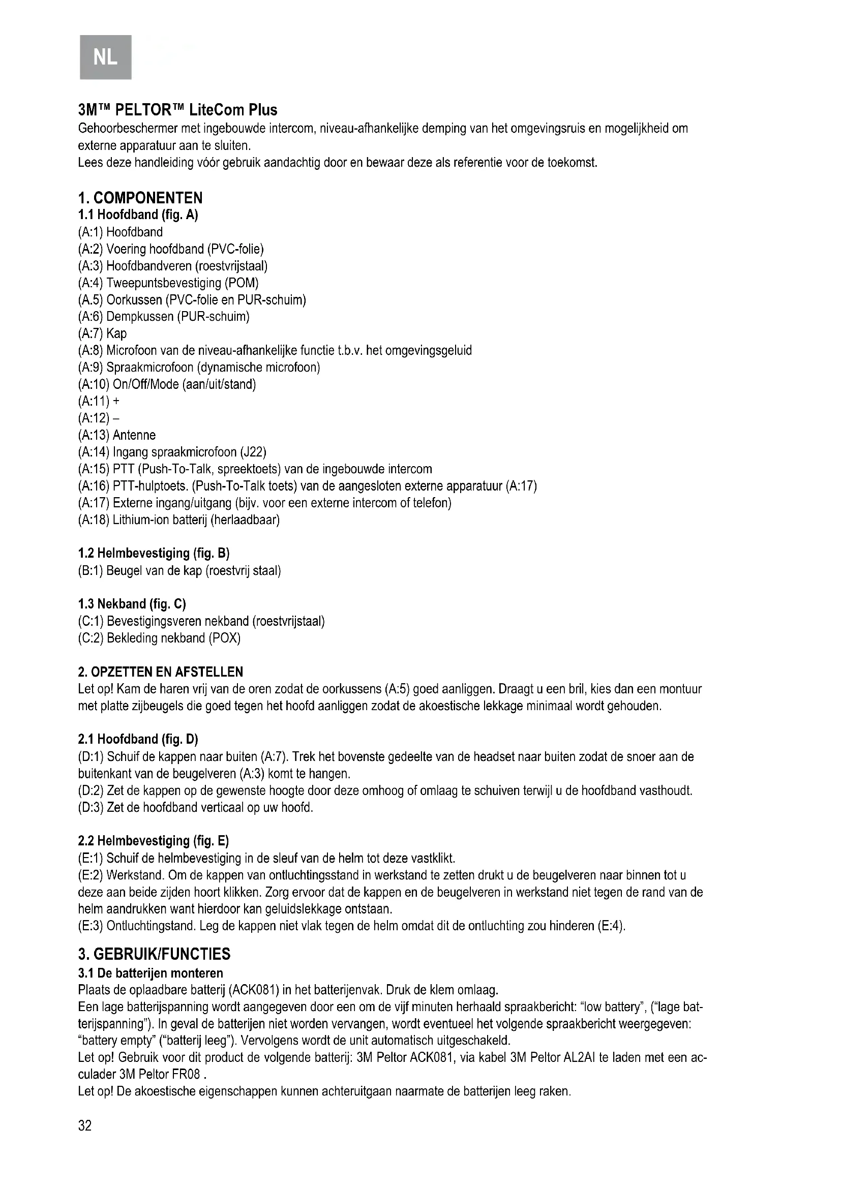 Plaats de oplaadbare batterij (ACK081) in het batterijenvak. Druk de klem omlaag. Een lage batterijspanning wordt aangegeven door een om de vijf minuten herhaald spraakbericht: “low battery”, (“lage bat- terijspanning”). In geval de batterijen niet worden vervangen, wordt eventueel het volgende spraakbericht weergegeven: “battery empty” (“batterij leeg”). Vervolgens wordt de unit automatisch uitgeschakeld. Let op! Gebruik voor dit product de volgende batterij: 3M Peltor ACK081, via kabel 3M Peltor AL2AI te laden met een ac- culader 3M Peltor FR08 . Let op! De akoestische eigenschappen kunnen achteruitgaan naarmate de batterijen leeg raken.32
