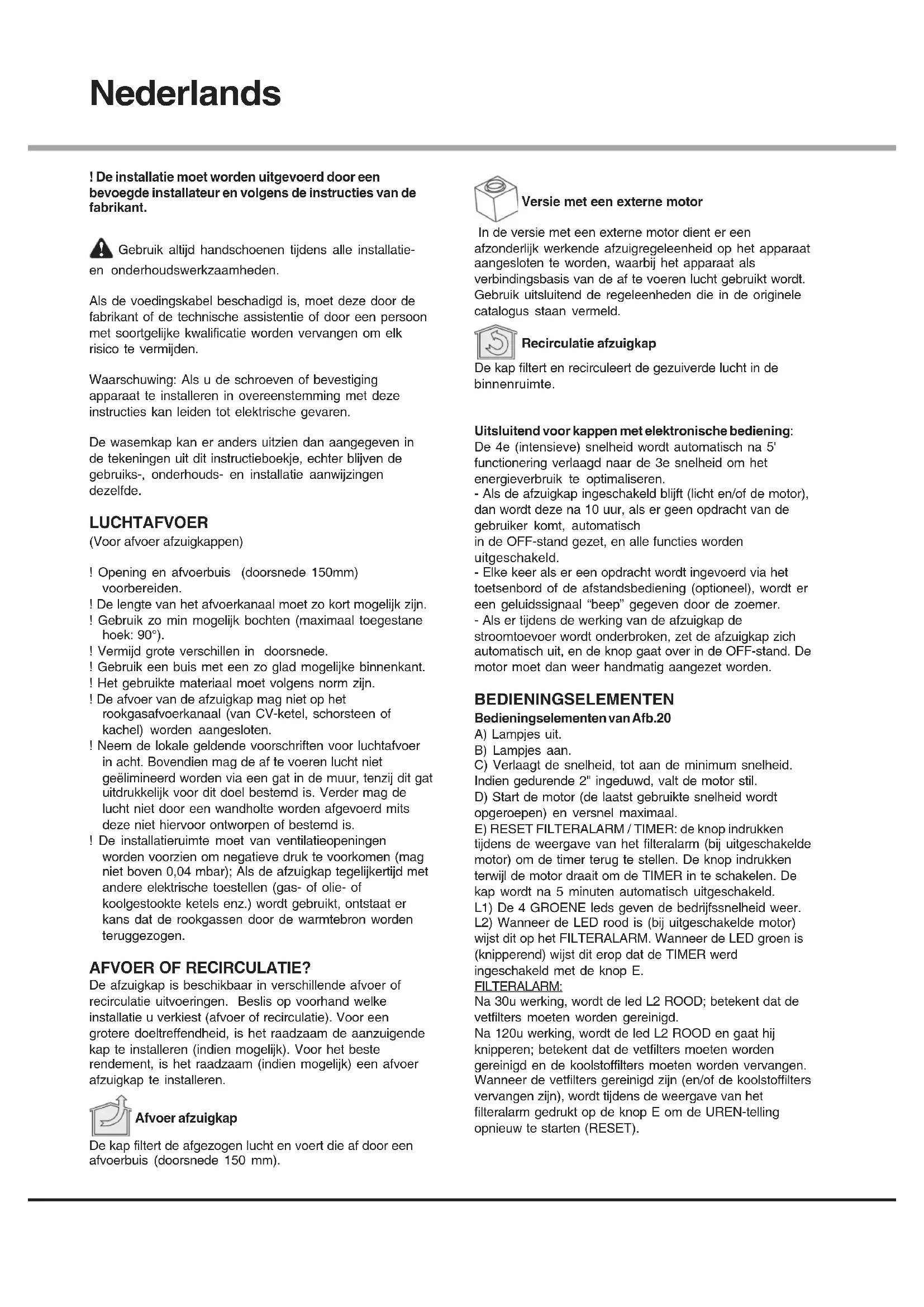 Gebruik altijd handschoenen tijdens alle installatie- en onderhoudswerkzaamheden. Als de voedingskabel beschadigd is, moet deze door de fabrikant of de technische assistentie of door een persoon met soortgelijke kwalificatie worden vervangen om elk risico te vermijden. Waarschuwing: Als u de schroeven of bevestiging apparaat te installeren in overeenstemming met deze instructies kan leiden tot elektrische gevaren. De wasemkap kan er anders uitzien dan aangegeven in de tekeningen uit dit instructieboekje, echter blijven de gebruiks-, onderhouds- en installatie aanwijzingen dezelfde. LUCHTAFVOER (Voor afvoer afzuigkappen) ! Opening en afvoerbuis (doorsnede 150mm) voorbereiden. ! De lengte van het afvoerkanaal moet zo kort mogelijk zijn. ! Gebruik zo min mogelijk bochten (maximaal toegestane hoek: 90°). ! Vermijd grote verschillen in doorsnede. ! Gebruik een buis met een zo glad mogelijke binnenkant. ! Het gebruikte materiaal moet volgens norm zijn. ! De afvoer van de afzuigkap mag niet op het rookgasafvoerkanaal (van CV-ketel, schorsteen of kachel) worden aangesloten. ! Neem de lokale geldende voorschriften voor luchtafvoer in acht. Bovendien mag de af te voeren lucht niet geëlimineerd worden via een gat in de muur, tenzij dit gat uitdrukkelijk voor dit doel bestemd is. Verder mag de lucht niet door een wandholte worden afgevoerd mits deze niet hiervoor ontworpen of bestemd is. ! De installatieruimte moet van ventilatieopeningen worden voorzien om negatieve druk te voorkomen (mag niet boven 0,04 mbar); Als de afzuigkap tegelijkertijd met andere elektrische toestellen (gas- of olie- of koolgestookte ketels enz.) wordt gebruikt, ontstaat er kans dat de rookgassen door de warmtebron worden teruggezogen. AFVOER OF RECIRCULATIE? De afzuigkap is beschikbaar in verschillende afvoer of recirculatie uitvoeringen. Beslis op voorhand welke installatie u verkiest (afvoer of recirculatie). Voor een grotere doeltreffendheid, is het raadzaam de aanzuigende kap te installeren (indien mogelijk). Voor het beste rendement, is het raadzaam (indien mogelijk) een afvoer afzuigkap te installeren. Afvoer afzuigkap De kap filtert de afgezogen lucht en voert die af door een afvoerbuis (doorsnede 150 mm). Versie met een externe motor In de versie met een externe motor dient er een afzonderlijk werkende afzuigregeleenheid op het apparaat aangesloten te worden, waarbij het apparaat als verbindingsbasis van de af te voeren lucht gebruikt wordt. Gebruik uitsluitend de regeleenheden die in de originele catalogus staan vermeld. Recirculatie afzuigkap De kap filtert en recirculeert de gezuiverde lucht in de binnenruimte. Uitsluitend voor kappen met elektronische bediening: De 4e (intensieve) snelheid wordt automatisch na 5' functionering verlaagd naar de 3e snelheid om het energieverbruik te optimaliseren. - Als de afzuigkap ingeschakeld blijft (licht en/of de motor), dan wordt deze na 10 uur, als er geen opdracht van de gebruiker komt, automatisch in de OFF-stand gezet, en alle functies worden uitgeschakeld. - Elke keer als er een opdracht wordt ingevoerd via het toetsenbord of de afstandsbediening (optioneel), wordt er een geluidssignaal “beep” gegeven door de zoemer. - Als er tijdens de werking van de afzuigkap de stroomtoevoer wordt onderbroken, zet de afzuigkap zich automatisch uit, en de knop gaat over in de OFF-stand. De motor moet dan weer handmatig aangezet worden. BEDIENINGSELEMENTEN Bedieningselementen van Afb.20 A) Lampjes uit. B) Lampjes aan. C) Verlaagt de snelheid, tot aan de minimum snelheid. Indien gedurende 2" ingeduwd, valt de motor stil. D) Start de motor (de laatst gebruikte snelheid wordt opgeroepen) en versnel maximaal. E) RESET FILTERALARM / TIMER: de knop indrukken tijdens de weergave van het filteralarm (bij uitgeschakelde motor) om de timer terug te stellen. De knop indrukken terwijl de motor draait om de TIMER in te schakelen. De kap wordt na 5 minuten automatisch uitgeschakeld. L1) De 4 GROENE leds geven de bedrijfssnelheid weer. L2) Wanneer de LED rood is (bij uitgeschakelde motor) wijst dit op het FILTERALARM. Wanneer de LED groen is (knipperend) wijst dit erop dat de TIMER werd ingeschakeld met de knop E. FILTERALARM: Na 30u werking, wordt de led L2 ROOD; betekent dat de vetfilters moeten worden gereinigd. Na 120u werking, wordt de led L2 ROOD en gaat hij knipperen; betekent dat de vetfilters moeten worden gereinigd en de koolstoffilters moeten worden vervangen. Wanneer de vetfilters gereinigd zijn (en/of de koolstoffilters vervangen zijn), wordt tijdens de weergave van het filteralarm gedrukt op de knop E om de UREN-telling opnieuw te starten (RESET).Bedieningselementen van Afb.21 Toets A = schakelaar voor de verlichting. Toets B = schakelaar AAN/UIT motor I ste snelheid. Toets C = schakelaar 2 de snelheid. Toets D = schakelaar 3 de snelheid. Bedieningselementen van Afb.22 P1: kort ingedrukt à de lampen gaan aan/uit, deled P1 gaat aan/uit. P2: Ingedrukt bij uitgeschakelde motor: de motormotorwordt op de eerste snelheid opgestart. Ingedruktbij ingeschakelde motor in de 1ste: de motor wordtuitgeschakeld. Ingedrukt bij ingeschakelde motor opsnelheid 1 vanuit de 1ste plaatst de motor in de 1ste.Geeft de snelheid aan met de brandende led. P3: Ingedrukt bij uitgeschakelde motor: de motorwordt op de 2de snelheid opgestart. Ingedrukt bij ingeschakeldemotor op snelheid 1 vanuit de 2de plaatst demotor in de 2de. Geeft de snelheid aan met de brandendeled. P4: Ingedrukt bij uitgeschakelde motor: de motorwordt op de 3de snelheid opgestart. Ingedrukt bij ingeschakeldemotor op snelheid 1 vanuit de 3de plaatst demotor in de 3de. Geeft de snelheid aan met de brandendeled. P5: Ingedrukt bij uitgeschakelde motor: de motorwordt op de 4de snelheid opgestart. Ingedrukt bij ingeschakeldemotor op snelheid 1 vanuit de 4de plaatst demotor in de 4de. Geeft de snelheid aan met de brandendeled. P6: Activeert/deactiveert de functie timer 5’ aangeduidmet brandende P6. P7: Reset filters: reset de teller en schake