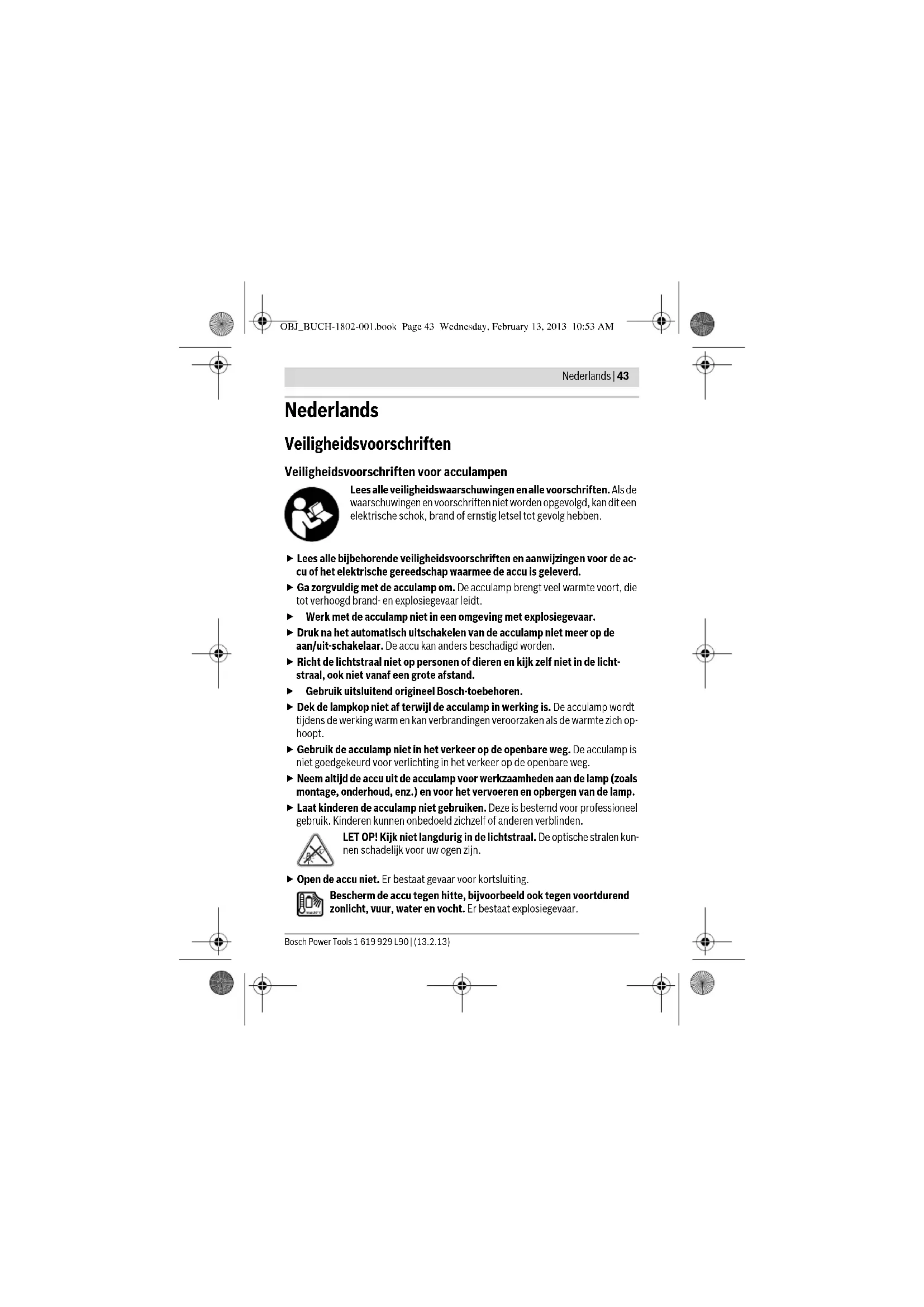 - Niet elk afgebeeld en beschreven toebehoren wordt standaard meegeleverd. Het volledige toebehoren vindt u in ons toebehorenprogramma. OBJ_BUCH-1802-001.book Page 44 Wednesday, February 13, 2013 10:53 AMNederlands | 45 Bosch Power Tools 1 619 929 L90 | (13.2.13) Technische gegevens Montage Accu opladen (toebehoren) (zie afbeelding A) Gebruik alleen de oplaadapparaten die op de toebehorenpagina vermeld staan. Alleen deze oplaadapparaten zijn afgestemd op de bij de acculamp gebruik- te lithiumionaccu. Opmerking: De accu wordt gedeeltelijk opgeladen geleverd. Om de volledige capaci- teit van de accu te verkrijgen, laadt u voor het eerste gebruik de accu volledig in het oplaadapparaat op. De lithiumionaccu kan op elk moment worden opgeladen zonder de levensduur te ver- korten. Een onderbreking van het opladen schaadt de accu niet. De lithiumionaccu is met „Electronic Cell Protection (ECP)” tegen te sterk ontladen beschermd. Als de accu leeg is, wordt de acculamp door een veiligheidsschakeling uitgeschakeld. Druk na het automatisch uitschakelen van de acculamp niet meer op de aan/uit- schakelaar. De accu kan anders beschadigd worden. Als u de accu 3 wilt verwijderen, drukt u op de ontgrendelingsknoppen 4 en trekt u de accu naar achteren uit de acculamp. Forceer daarbij niet. De accu is voorzien van een thermische beveiliging (NTC) die opladen alleen in het temperatuurbereik tussen 0 °C en 45 °C toelaat. Daardoor wordt een lange levens- duur van de accu bereikt. Neem de voorschriften ten aanzien van de afvalverwijdering in acht. Acculamp PLI 10,8 LI Zaaknummer 3 603 JA1 0.. Nominale spanning V= 10,8 Brandduur, ca. –1,3 Ah –1,5 Ah min min