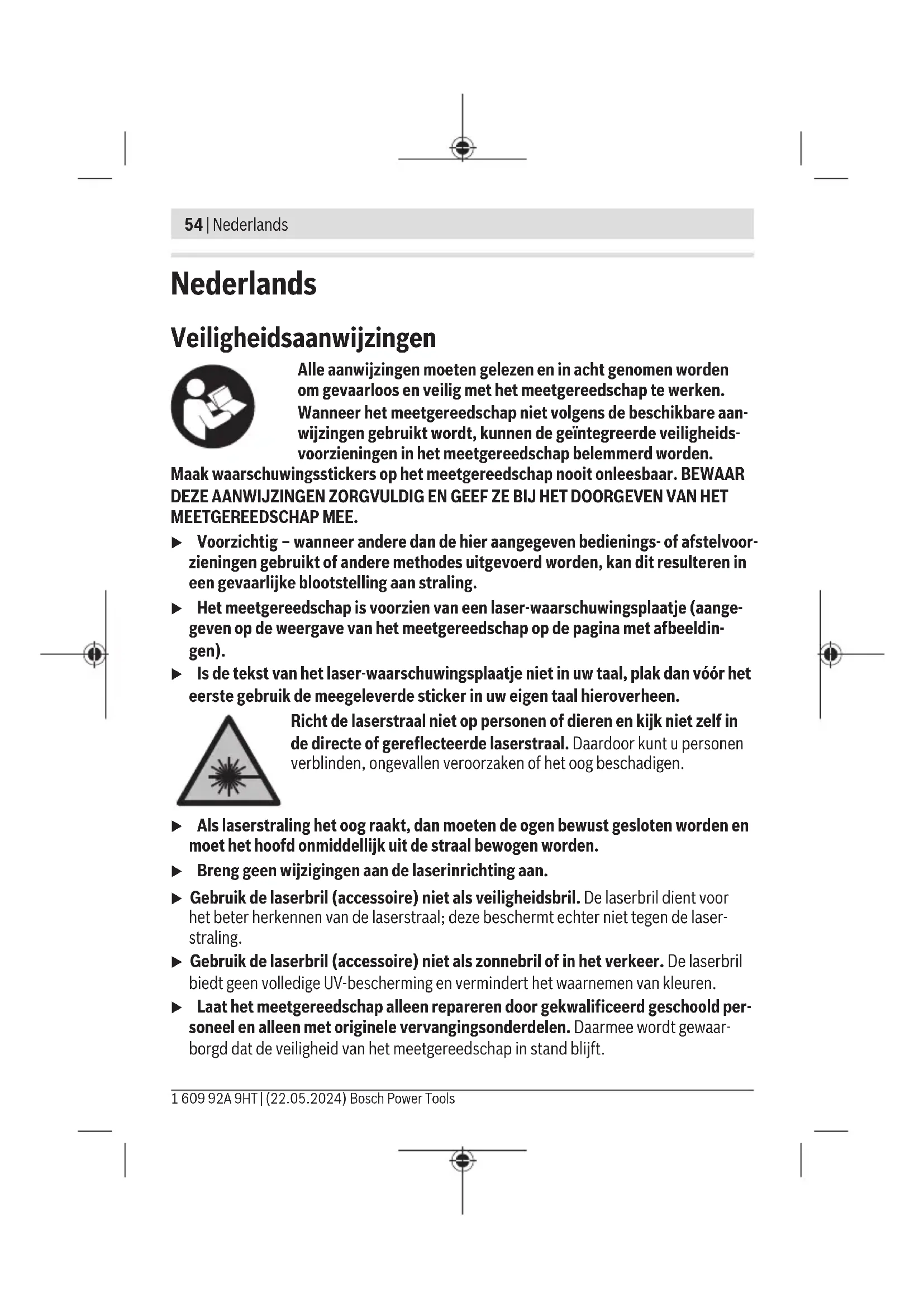 bij 20–25°C C) De opgegeven waarden gelden bij normale tot gunstige omgevingsomstandigheden (bijv. geen trillingen, geen mist, geen rook, geen direct zonlicht). Na sterke temperatuurschommelingen kan de nauwkeurigheid afwijken. D) Er ontstaat slechts een niet geleidende vervuiling, waarbij echter soms een tijdelijke geleidbaar- heid wort verwacht door bedauwing. E) Gewicht zonder (oplaadbare) batterijen Het productnummer (10) op het typeplaatje dient voor een ondubbelzinnige identificatie van uw meetgereedschap. Montage Batterijen plaatsen/verwisselen Voor het gebruik van het meetgereedschap worden alkalimangaanbatterijen of accu’s ge- adviseerd. Voor het openen van het batterijvakdeksel(8) drukt u op de vergrendeling(7) en verwij- dert u het batterijvakdeksel. Plaats de (oplaadbare) batterijen. Let er hierbij op dat de polen juist worden geplaatst volgens de afbeelding op de binnen- kant van het batterijvak. Als de (oplaadbare) batterijen leeg zijn, dan brandt de statusaanduiding(3) rood en de laserstralen worden uitgeschakeld. Schakel het meetgereedschap uit en vervang de (op- laadbare) batterijen. Verwissel altijd alle batterijen of accu’s tegelijkertijd. Gebruik alleen batterijen of accu’s van één fabrikant en met dezelfde capaciteit. u Haal de (oplaadbare) batterijen uit het meetgereedschap, wanneer u dit langere tijd niet gebruikt. De (oplaadbare) batterijen kunnen bij een langere opslagduur in het meetgereedschap gaan corroderen. Bosch Power Tools 1 609 92A 9HT | (22.05.2024)58 | Nederlands Gebruik Ingebruikname u Bescherm het meetgereedschap tegen vocht en fel zonlicht. u Stel het meetgereedschap niet bloot aan extreme temperaturen of temperatuur- schommelingen. Laat het bijv. niet gedurende langere tijd in de auto liggen. Laat het meetgereedschap bij grotere temperatuurschommelingen eerst op temperatuur ko- men, voordat u het in gebruik neemt. Bij extreme temperaturen of temperatuur- schommelingen kan de nauwkeurigheid van het meetgereedschap nadelig beïnvloed worden. u Vermijd krachtige stoten of vallen van het meetgereedschap. Door schade aan het meetgereedschap kan de nauwkeurigheid in het gedrang komen. Vergelijk na een heftige schok of val de laserlijn ter controle met een bekende horizontale of verticale referentielijn. u Het meetgereedschap tijdens transport uitschakelen. Bij het uitschakelen wordt de pendeleenheid vergrendeld. Anders kan deze bij heftige bewegingen beschadigd raken. In-/uitschakelen Voor het inschakelen van het meetgereedschap schuift u de aan/uit-schakelaar (5) naar de stand ON. Het meetgereedschap zendt direct na het inschakelen laserlijnen uit de voorste opening(1). u Richt de laserstraal niet op personen of dieren en kijk zelf niet in de laserstraal, ook niet vanaf een grote afstand. Voor het uitschakelen van het meetgereedschap schuift u de aan-/uit-schakelaar (5) in stand OFF. Bij het uitschakelen wordt de pendeleenheid vergrendeld. u Laat het ingeschakelde meetgereedschap niet onbeheerd achter en schakel het meetgereedschap na gebruik uit. Andere personen kunnen door de laserstraal ver- blind worden. Modi Het meetgereedschap beschikt over meerdere modi. U kunt op elk gewenst moment tus- sen de modi wisselen: – kruislijnmodus (zie afbeeldingenA−B): toont één horizontale en één verticale laser- lijn, – kruislijn- en loodpuntmodus (zie afbeeldingC): produceert een horizontale en een verticale laserlijn evenals telkens een loodpunt naar boven en beneden, 1 609 92A 9HT | (22.05.2024) Bosch Power ToolsNederlands | 59 – loodpuntmodus: produceert telkens een loodpunt naar boven en beneden. Na het inschakelen bevindt het meetgereedschap zich in de kruislijnmodus met automa- tische nivellering. Om van modus te wisselen, drukt u zo vaak op de toets voor lasermodus(4) tot de laser- stralen in de gewenste modus worden getoond. Alle modi zijn zowel met automatische nivellering als met hellingsfunctie mogelijk. Automatische nivellering Werken met automatische nivellering (zie afbeeldingen A–C) Bij het werken met automatische nivellering mag de statusaanduiding(3) niet branden. Schakel eventueel door het indrukken van de toets hellingsfunctie(2) de automatische nivellering weer in, zodat de statusaanduiding uitgaat. Plaats het meetgereedschap op een vlakke, stevige ondergrond of bevestig het op het statief(11). Het automatische nivelleersysteem nivelleert automatisch oneffenheden binnen het zelf- nivelleerbereik van ±4°. De nivellering is afgesloten zodra de laserlijnen niet meer bewe- gen. Als de automatische nivellering niet mogelijk is, bijv. omdat het standvlak van het meet- gereedschap meer dan 4° van de horizontale lijn afwijkt, dan beginnen de laserstralen te knipperen. Plaats in dit geval het meetgereedschap horizontaal en wacht de zelfnivellering af. Zodra het meetgereedschap zich binnen het zelfnivelleerbereik van ±4° bevindt, branden de la- serstralen continu. Buiten het zelfnivelleerbereik van ±4° is het werken met automatische nivellering niet mogelijk, omdat anders noch de nivelleernauwkeurigheid van de laserstralen noch de rechte hoek tussen de laserstralen gewaarborgd is. Bij schokken of veranderingen van positie tijdens het gebruik wordt het meetgereed- schap automatisch opnieuw genivelleerd. Controleer na een hernieuwde nivellering de positie van de horizontale of verticale laserlijn met betrekking tot de referentiepunten om fouten door een verschuiving van het meetgereedschap te vermijden. Werken met hellingsfunctie (zie afbeeldingB) Druk voor werkzaamheden met hellingsfunctie op de toets hellingsfunctie(2). In de hel- lingsfunctie brandt de statusaanduiding(3) groen. Bij het werken met hellingsfunctie is de automatische nivellering uitgeschakeld. U kunt het meetgereedschap vrij in de hand houden of op een hellende ondergrond zetten. De laserstralen worden niet meer genivelleerd en lopen niet meer noodzakelijk loodrecht t.o.v. elkaar. Bosch Power Tools 1 609 92A 9HT | (22.05.2024)60 | Nederlands Aanwijzingen voo