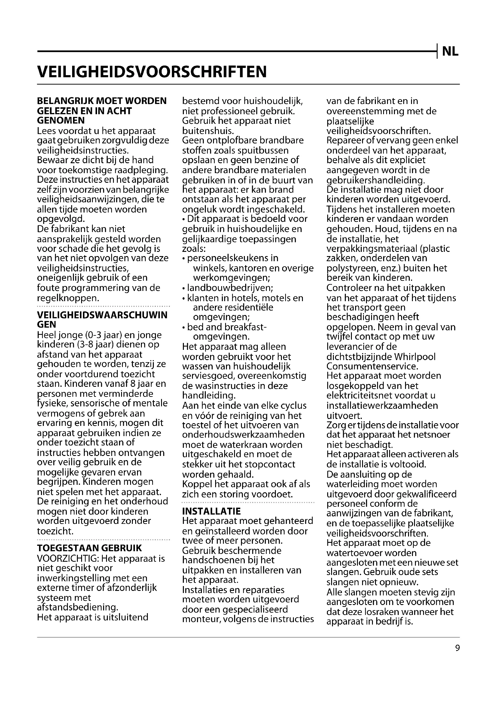 - bed and breakfast- omgevingen. Het apparaat mag alleen worden gebruikt voor het wassen van huishoudelijk serviesgoed, overeenkomstig de wasinstructies in deze handleiding. Aan het einde van elke cyclus en vóór de reiniging van het toestel of het uitvoeren van onderhoudswerkzaamheden moet de waterkraan worden uitgeschakeld en moet de stekker uit het stopcontact worden gehaald. Koppel het apparaat ook af als zich een storing voordoet. INSTALLATIE Het apparaat moet gehanteerd en geïnstalleerd worden door twee of meer personen. Gebruik beschermende handschoenen bij het uitpakken en installeren van het apparaat. Installaties en reparaties moeten worden uitgevoerd door een gespecialiseerd monteur, volgens de instructies van de fabrikant en in overeenstemming met de plaatselijke veiligheidsvoorschriften. Repareer of vervang geen enkel onderdeel van het apparaat, behalve als dit expliciet aangegeven wordt in de gebruikershandleiding. De installatie mag niet door kinderen worden uitgevoerd. Tijdens het installeren moeten kinderen er vandaan worden gehouden. Houd, tijdens en na de installatie, het verpakkingsmateriaal (plastic zakken, onderdelen van polystyreen, enz.) buiten het bereik van kinderen. Controleer na het uitpakken van het apparaat of het tijdens het transport geen beschadigingen heeft opgelopen. Neem in geval van twijfel contact op met uw leverancier of de dichtstbijzijnde Whirlpool Consumentenservice. Het apparaat moet worden losgekoppeld van het elektriciteitsnet voordat u installatiewerkzaamheden uitvoert. Zorg er tijdens de installatie voor dat het apparaat het netsnoer niet beschadigt. Het apparaat alleen activeren als de installatie is voltooid. De aansluiting op de waterleiding moet worden uitgevoerd door gekwalificeerd personeel conform de aanwijzingen van de fabrikant, en de toepasselijke plaatselijke veiligheidsvoorschriften. Het apparaat moet op de watertoevoer worden aangesloten met een nieuwe set slangen. Gebruik oude sets slangen niet opnieuw. Alle slangen moeten stevig zijn aangesloten om te voorkomen dat deze losraken wanneer het apparaat in bedrijf is. NL10 Neem de geldende voorschriften van het waterleidingbedrijf in acht. Watertoevoerdruk 0,05-1,0 MPa. De druk van het toevoerwater hangt af van het model afwasmachine. Als de geïnstalleerde toevoerslang is gemarkeerd met "25°C Max" is de maximale toegestane watertemperatuur 25°C. Voor alle andere modellen is de maximale toegestane watertemperatuur is 60°C. De slangen mogen niet worden doorgesneden en bij een apparaat met waterstopsysteem mag de kunststof doos voor de aansluiting op het waterleidingnet niet onder water worden gedompeld. Neem contact op met uw leverancier indien slangen niet lang genoeg zijn. Controleer of de watertoevoer- en afvoerslangen niet gevouwen of afgekneld zijn. Controleer voor gebruik of de toevoer- en afvoerslangen waterdicht zijn. Bij gebruik dient de toegang tot de achterwand op geschikte wijze beperkt worden door bijvoorbeeld het apparaat voor een wand of meubelwand te plaatsen. Controleer bij de installatie van het apparaat of de vier pootjes stevig op de vloer rusten, stel ze naar wens af en controleer of het apparaat exact horizontaal staat en gebruik hiervoor een waterpas. Wanneer het apparaat aan het einde van een reeks apparaten wordt geïnstalleerd waardoor het zijpaneel toegankelijk is, moet het scharnierend gedeelte worden afgedekt om het risico op beknelling te voorkomen. Voor afwasmachines met ventilatieopeningen in de onderkant mogen de openingen niet door een tapijt worden geblokkeerd. ELEKTRISCHE WAARSCHUWINGEN Om ervoor te zorgen dat de installatie voldoet aan de geldende veiligheidsvoorschriften moet er een multipolaire schakelaar met een afstand van minstens 3 mm worden gebruikt en moet het apparaat geaard worden. Vervang een beschadigde stroomkabel door een soortgelijk exemplaar. De stroomkabel mag uitsluitend vervangen worden door een gespecialiseerd monteur, volgens de instructies van de fabrikant en in overeenstemming met de geldende veiligheidsvoorschriften. Neem contact op met een erkend servicecentrum. Als de bijgeleverde stekker niet geschikt is voor uw stopcontact neem dan contact op met een erkende monteur. De stroomkabel moet lang genoeg zijn om het apparaat, nadat dit is ingebouwd in het meubel, te kunnen aansluiten op het stopcontact van de netvoeding. Niet aan de stroomkabel trekken. Gebruik geen verlengkabels, meervoudige stopcontacten of adapters. Gebruik het apparaat niet als het netsnoer of de stekker beschadigd is, als het apparaat niet goed werkt of als het beschadigd of gevallen is. Houd het snoer uit de buurt van hete oppervlakken. Als de installatie voltooid is, mogen de elektrische onderdelen niet meer toegankelijk zijn voor de gebruiker. Raak het apparaat niet aan met vochtige lichaamsdelen en gebruik het niet op blote voeten. CORRECT GEBRUIK Het water in de afwasmachine is geen drinkwater. Het maximum aantal couverts staat in het productinformatieblad. Laat de deur niet openstaan, dit verhoogt het gevaar van struikelen. De geopende deur kan alleen het gewicht van het uitgeschoven rek dragen, met inbegrip van het serviesgoed. Leun niet op de deur en ga er niet op zitten of staan. Gebruik alleen wasmiddelen en/ of nabehandelingsproducten die speciaal bedoeld zijn voor automatische afwasmachines. WAARSCHUWING: Vaatwasmiddelen zijn sterk alkalinehoudend. Zij zijn uiterst gevaarlijk als deze worden ingeslikt. Vermijd contact met de huid en ogen en houd kinderen uit de buurt van de afwasmachine wanneer de deur open is. Controleer of het wasmiddelbakje leeg is na afloop van de wascyclus. Bewaar het afwasmiddel, het glansspoelmiddel en het zout buiten het bereik van kinderen. WAARSCHUWING: Messen en andere gebruiksvoorwerpen met scherpe punten moeten in de mand worden gezet met de punten naar beneden of in een horizontale positie geplaatst. Aan het einde van elk programma en vóór de reiniging van de afwasmachine of het uitvoeren van onderhouds