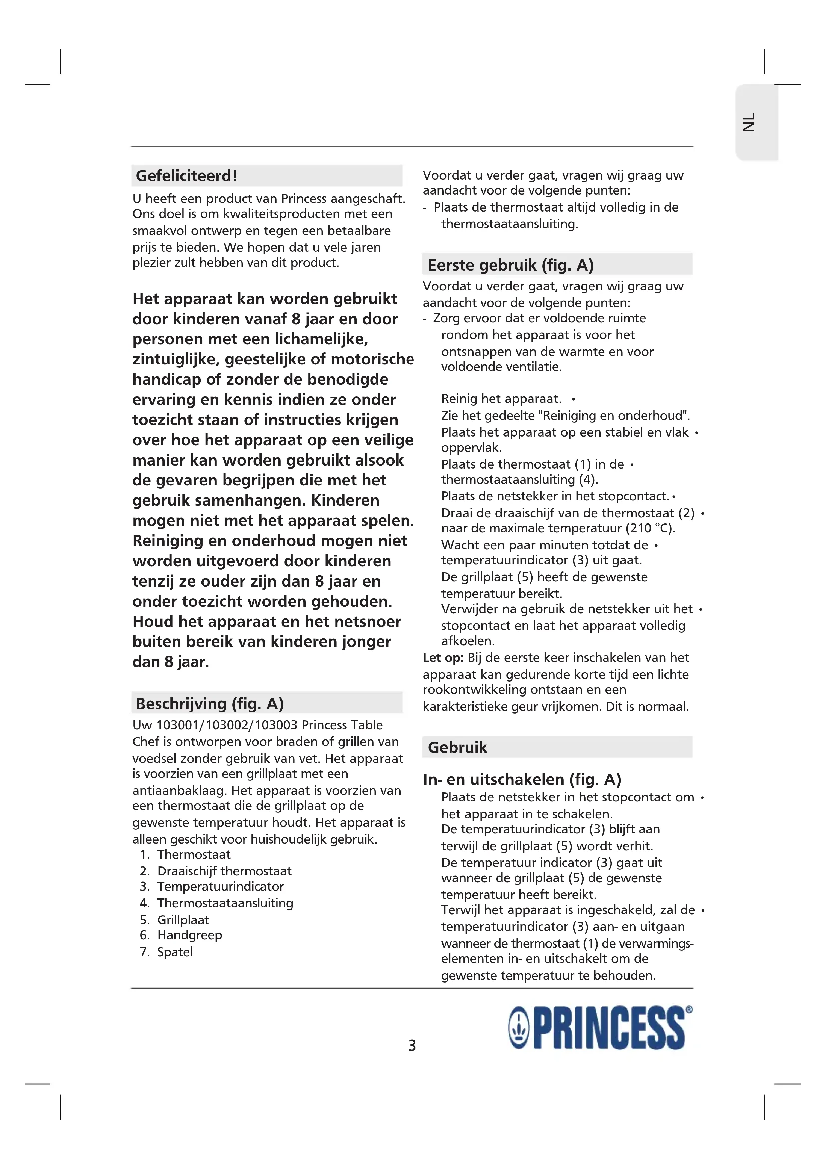 Gefeliciteerd! U heeft een product van Princess aangeschaft. Ons doel is om kwaliteitsproducten met een smaakvol ontwerp en tegen een betaalbare prijs te bieden. We hopen dat u vele jaren plezier zult hebben van dit product. Het apparaat kan worden gebruikt door kinderen vanaf 8 jaar en door personen met een lichamelijke, zintuiglijke, geestelijke of motorische handicap of zonder de benodigde ervaring en kennis indien ze onder toezicht staan of instructies krijgen over hoe het apparaat op een veilige manier kan worden gebruikt alsook de gevaren begrijpen die met het gebruik samenhangen. Kinderen mogen niet met het apparaat spelen. Reiniging en onderhoud mogen niet worden uitgevoerd door kinderen tenzij ze ouder zijn dan 8 jaar en onder toezicht worden gehouden. Houd het apparaat en het netsnoer buiten bereik van kinderen jonger dan 8 jaar. Beschrijving (fig. A) Uw 103001/103002/103003 Princess Table Chef is ontworpen voor braden of grillen van voedsel zonder gebruik van vet. Het apparaat is voorzien van een grillplaat met een antiaanbaklaag. Het apparaat is voorzien van een thermostaat die de grillplaat op de gewenste temperatuur houdt. Het apparaat is alleen geschikt voor huishoudelijk gebruik.