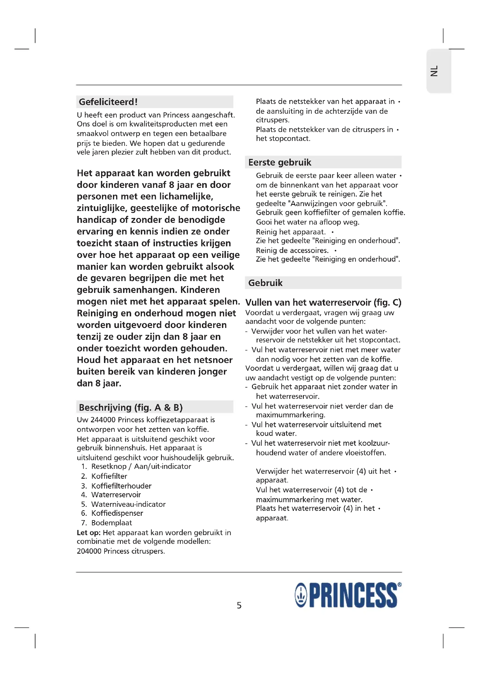 Gefeliciteerd! U heeft een product van Princess aangeschaft. Ons doel is om kwaliteitsproducten met een smaakvol ontwerp en tegen een betaalbare prijs te bieden. We hopen dat u gedurende vele jaren plezier zult hebben van dit product. Het apparaat kan worden gebruikt door kinderen vanaf 8 jaar en door personen met een lichamelijke, zintuiglijke, geestelijke of motorische handicap of zonder de benodigde ervaring en kennis indien ze onder toezicht staan of instructies krijgen over hoe het apparaat op een veilige manier kan worden gebruikt alsook de gevaren begrijpen die met het gebruik samenhangen. Kinderen mogen niet met het apparaat spelen. Reiniging en onderhoud mogen niet worden uitgevoerd door kinderen tenzij ze ouder zijn dan 8 jaar en onder toezicht worden gehouden. Houd het apparaat en het netsnoer buiten bereik van kinderen jonger dan 8 jaar. Beschrijving (fig. A & B) Uw 244000 Princess koffiezetapparaat is ontworpen voor het zetten van koffie. Het apparaat is uitsluitend geschikt voor gebruik binnenshuis. Het apparaat is uitsluitend geschikt voor huishoudelijk gebruik.