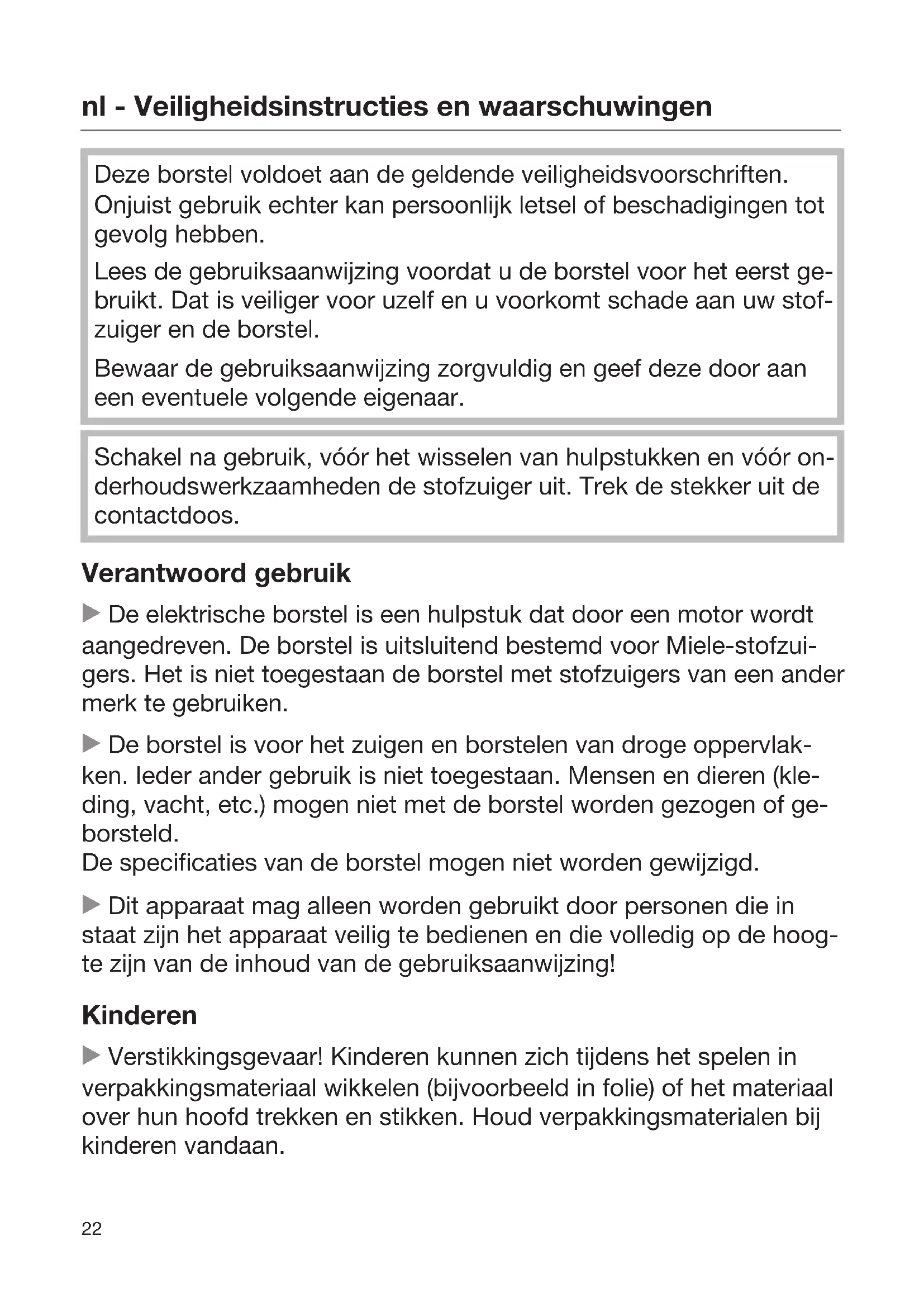 Deze borstel voldoet aan de geldende veiligheidsvoorschriften. Onjuist gebruik echter kan persoonlijk letsel of beschadigingen tot gevolg hebben. Lees de gebruiksaanwijzing voordat u de borstel voor het eerst ge- bruikt. Dat is veiliger voor uzelf en u voorkomt schade aan uw stof- zuiger en de borstel. Bewaar de gebruiksaanwijzing zorgvuldig en geef deze door aan een eventuele volgende eigenaar. Schakel na gebruik, vóór het wisselen van hulpstukken en vóór on- derhoudswerkzaamheden de stofzuiger uit. Trek de stekker uit de contactdoos. Verantwoord gebruik De elektrische borstel is een hulpstuk dat door een motor wordt aangedreven. De borstel is uitsluitend bestemd voor Miele-stofzui- gers. Het is niet toegestaan de borstel met stofzuigers van een ander merk te gebruiken. De borstel is voor het zuigen en borstelen van droge oppervlak- ken. Ieder ander gebruik is niet toegestaan. Mensen en dieren (kle- ding, vacht, etc.) mogen niet met de borstel worden gezogen of ge- borsteld. De specificaties van de borstel mogen niet worden gewijzigd. Dit apparaat mag alleen worden gebruikt door personen die in staat zijn het apparaat veilig te bedienen en die volledig op de hoog- te zijn van de inhoud van de gebruiksaanwijzing! Kinderen Verstikkingsgevaar! Kinderen kunnen zich tijdens het spelen in verpakkingsmateriaal wikkelen (bijvoorbeeld in folie) of het materiaal over hun hoofd trekken en stikken. Houd verpakkingsmaterialen bij kinderen vandaan.nl - Veiligheidsinstructies en waarschuwingen