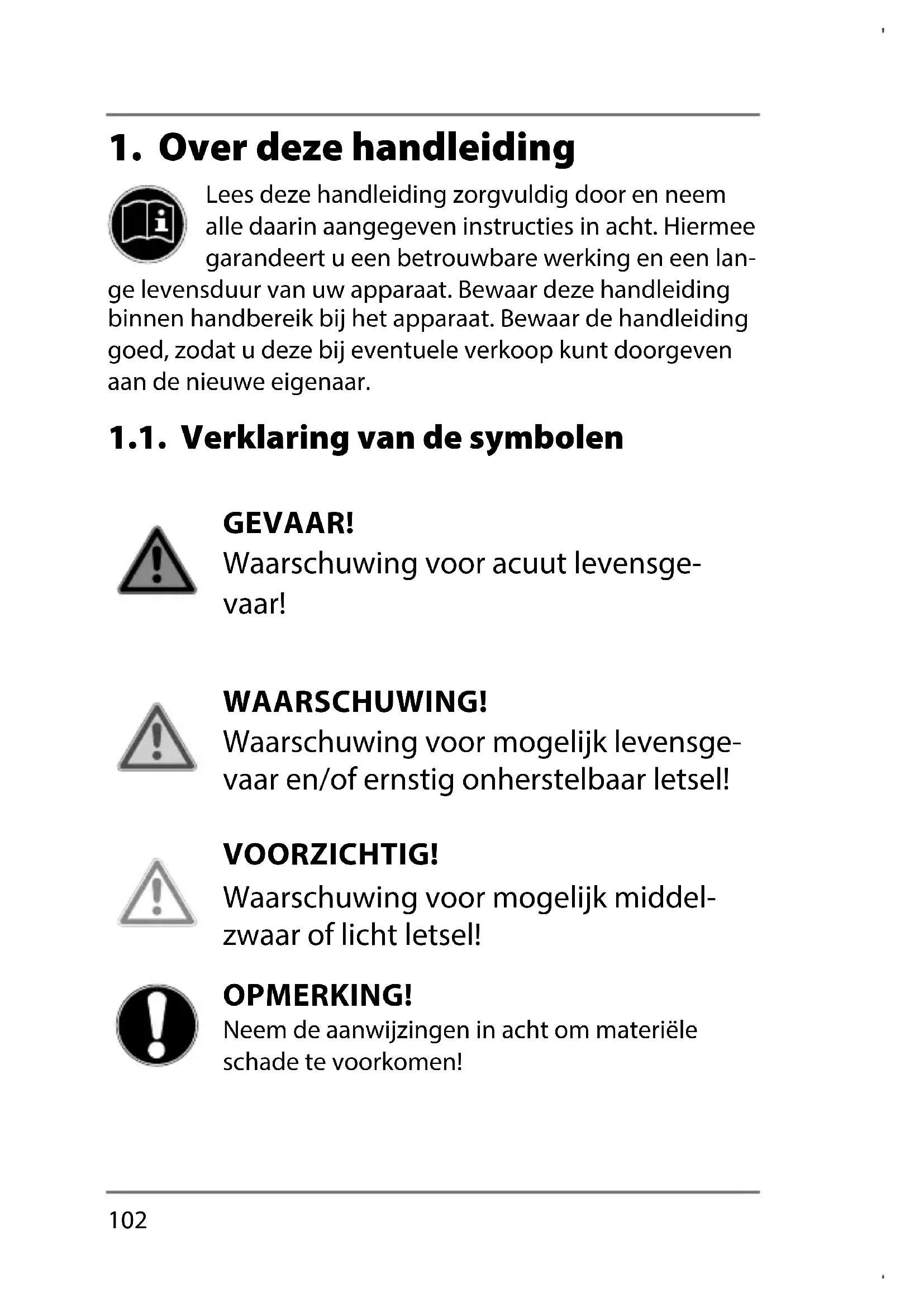 Lees deze handleiding zorgvuldig door en neem alle daarin aangegeven instructies in acht. Hiermee garandeert u een betrouwbare werking en een lan- ge levensduur van uw apparaat. Bewaar deze handleiding binnen handbereik bij het apparaat. Bewaar de handleiding goed, zodat u deze bij eventuele verkoop kunt doorgeven aan de nieuwe eigenaar. 1.1. Verklaring van de symbolen GEVAAR! Waarschuwing voor acuut levensge- vaar! WAARSCHUWING! Waarschuwing voor mogelijk levensge- vaar en/of ernstig onherstelbaar letsel! VOORZICHTIG! Waarschuwing voor mogelijk middel- zwaar of licht letsel! OPMERKING! Neem de aanwijzingen in acht om materiële schade te voorkomen! 87787 MULI Landi CH-DS Content MSN 5005 6775 final REV1.indb 10287787 MULI Landi CH-DS Content MSN 5005 6775 final REV1.indb 102 26.02.2018 15:04:1826.02.2018 15:04:18103