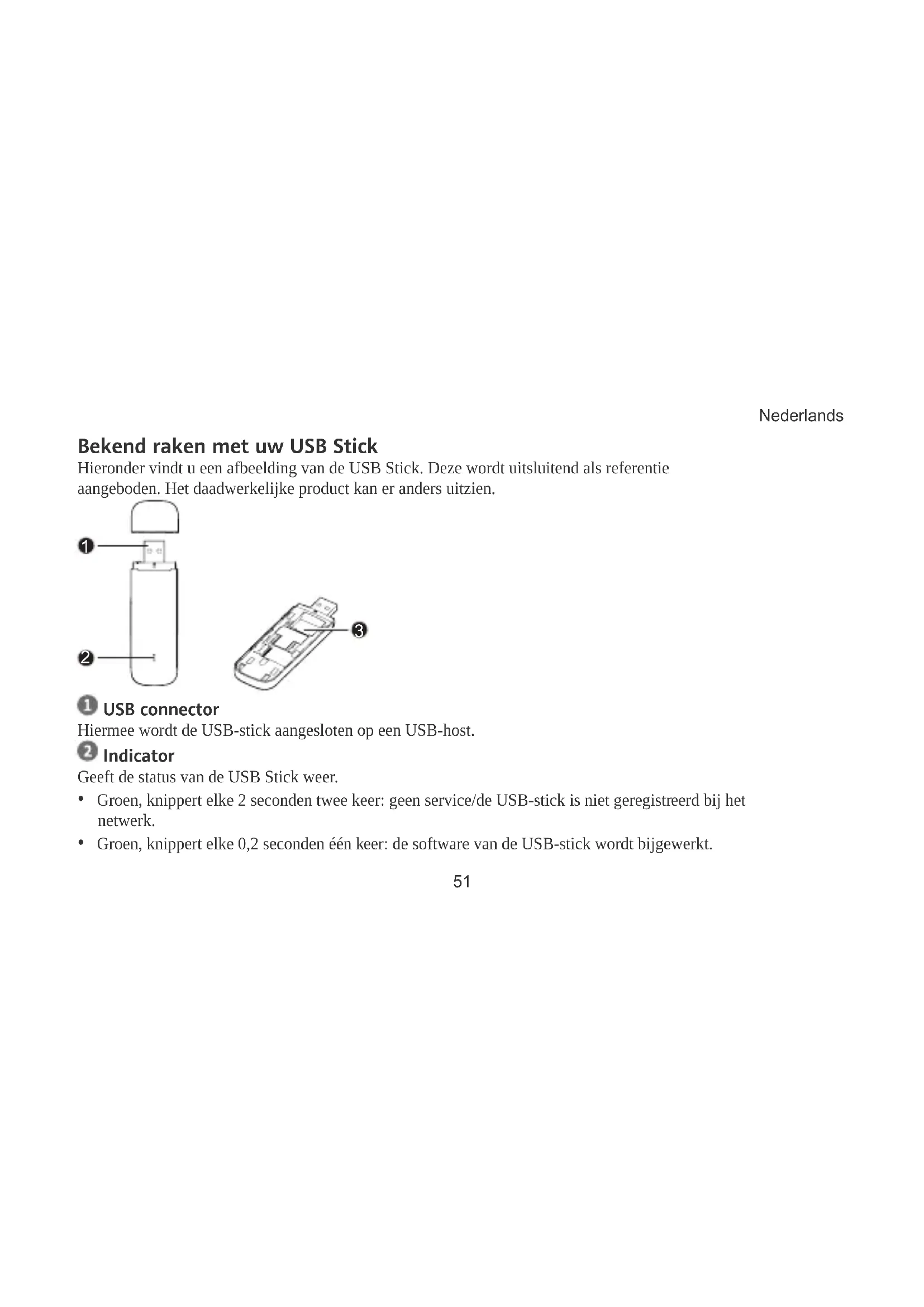 - Groen, knippert elke 0,2 seconden één keer: de software van de USB-stick wordt bijgewerkt. Nederlands 51• Groen, knippert elke 2 seconden één keer: de USB-stick is al geregistreerd bij het 2G-netwerk.