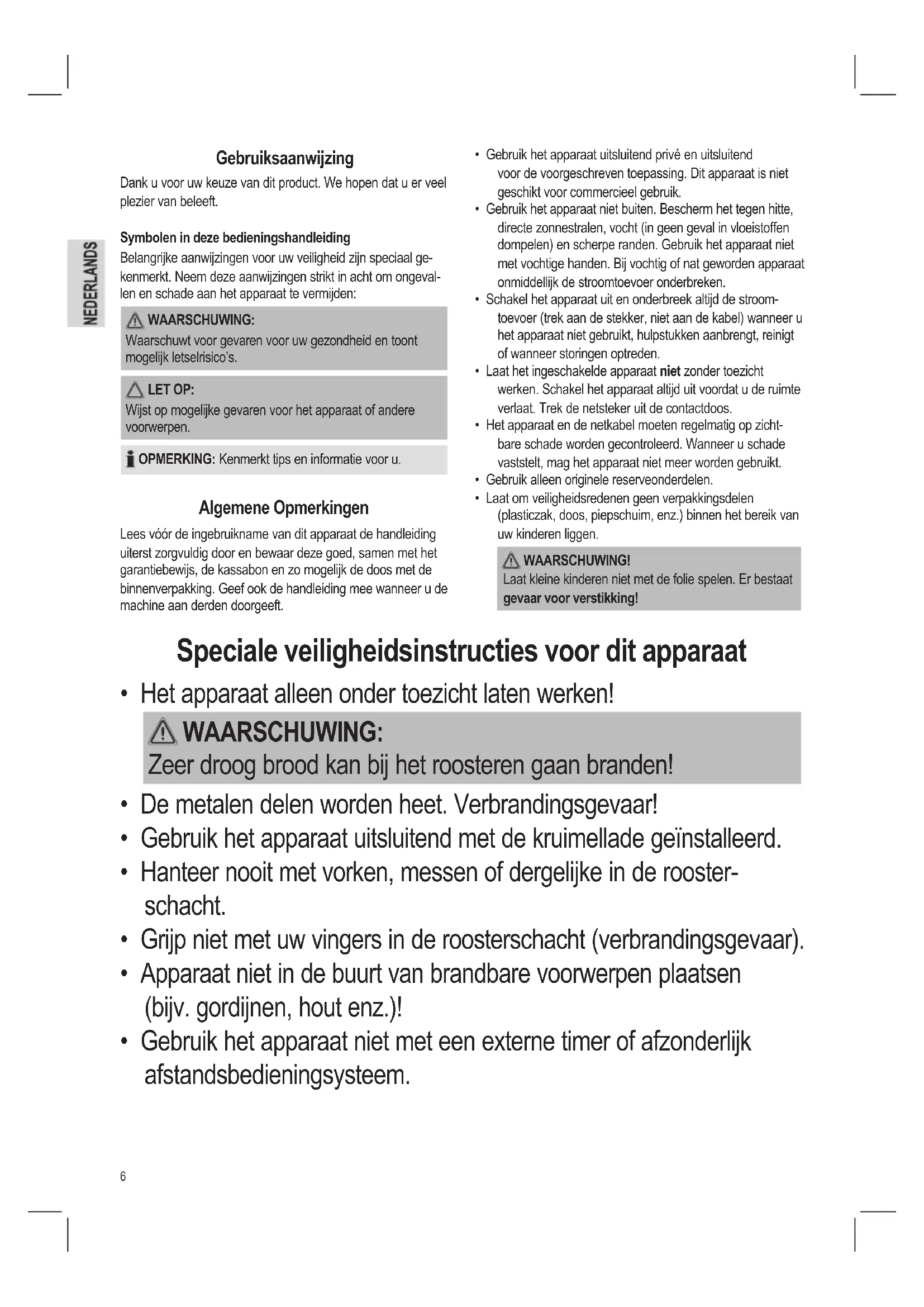 - Het apparaat alleen onder toezicht laten werken! WAARSCHUWING: Zeer droog brood kan bij het roosteren gaan branden!