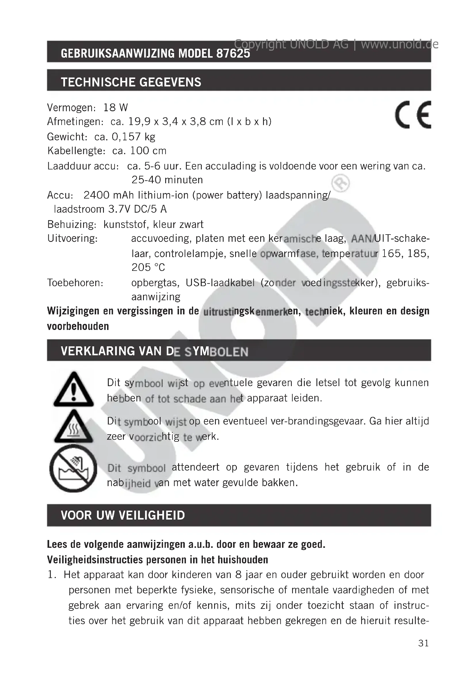 pc aan te sluiten en het apparaat op die manier op te laden. Om technische redenen kan het opladen dan echter heel lang duren, waardoor wij het opladen met een USB-lader aanbevelen. Copyright UNOLD AG | www.unold.de36 BEDIENING Let op: Het apparaat kan niet worden gebruikt als het met de laadkabel aan een USB-lader op het stroomnet is aangesloten. Het mag alleen met accuvoeding worden gebruikt! Gebruik vóór het glad maken van uw haar a.u.b. geen chemische haarstylingproducten zoals haarspray om verbranding van het haar te voorkomen. Het gebruik van hittebeschermingsproducten voor het haar is daarentegen zeker aan te bevelen. Let op: Het apparaat wordt tijdens het gebruik zeer heet. Bij direct huidcontact bestaat kans op brandwonden.